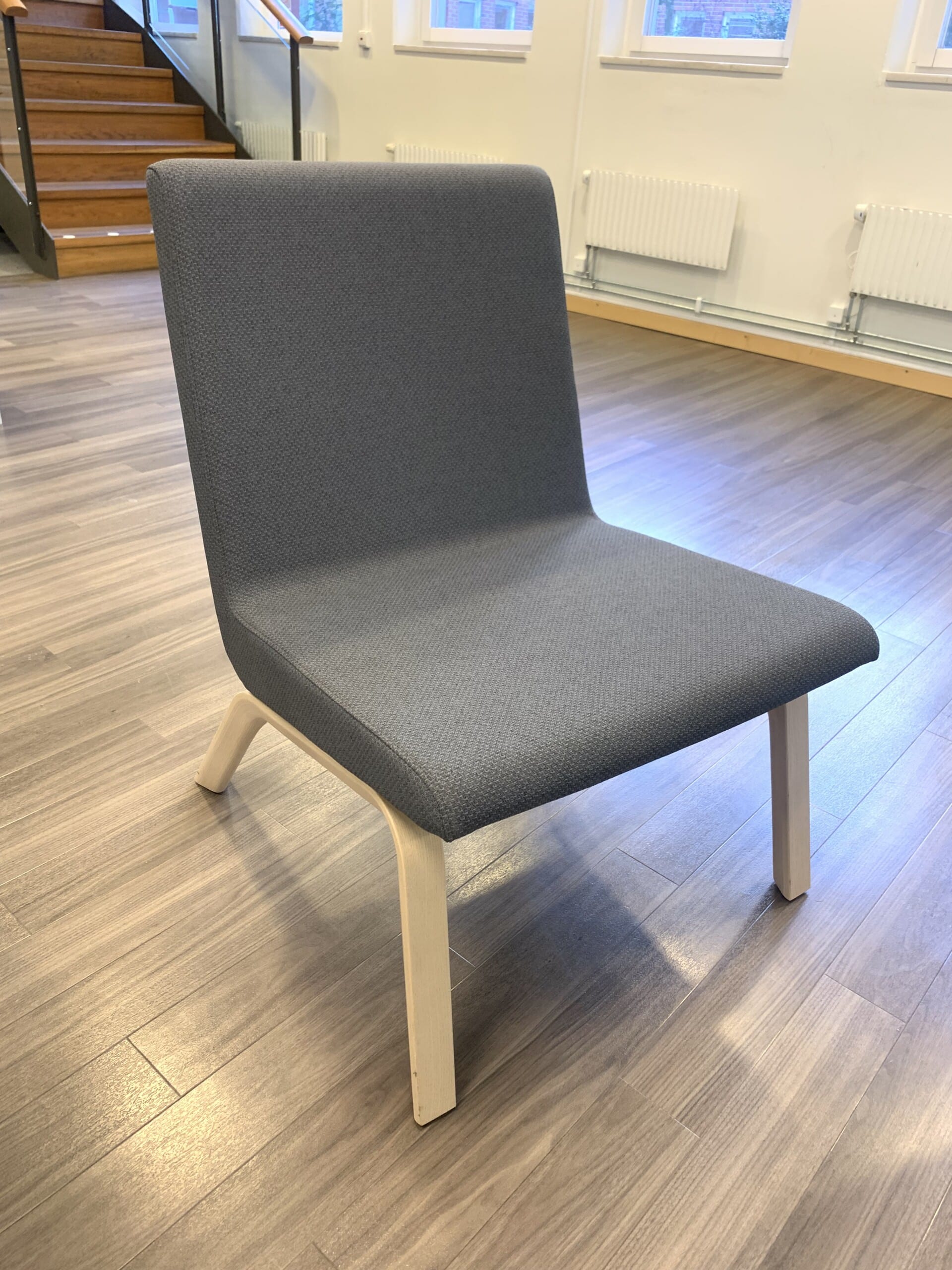 Sæde og ryg i stof (grå). 4-bensstel i træ (ask).