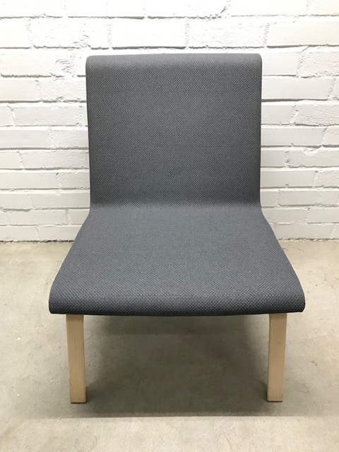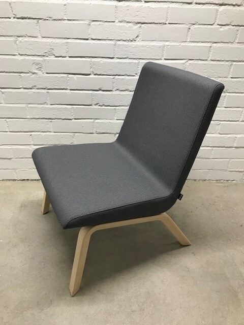 Sæde og ryg i stof (grå). 4-bensstel i træ (ask).