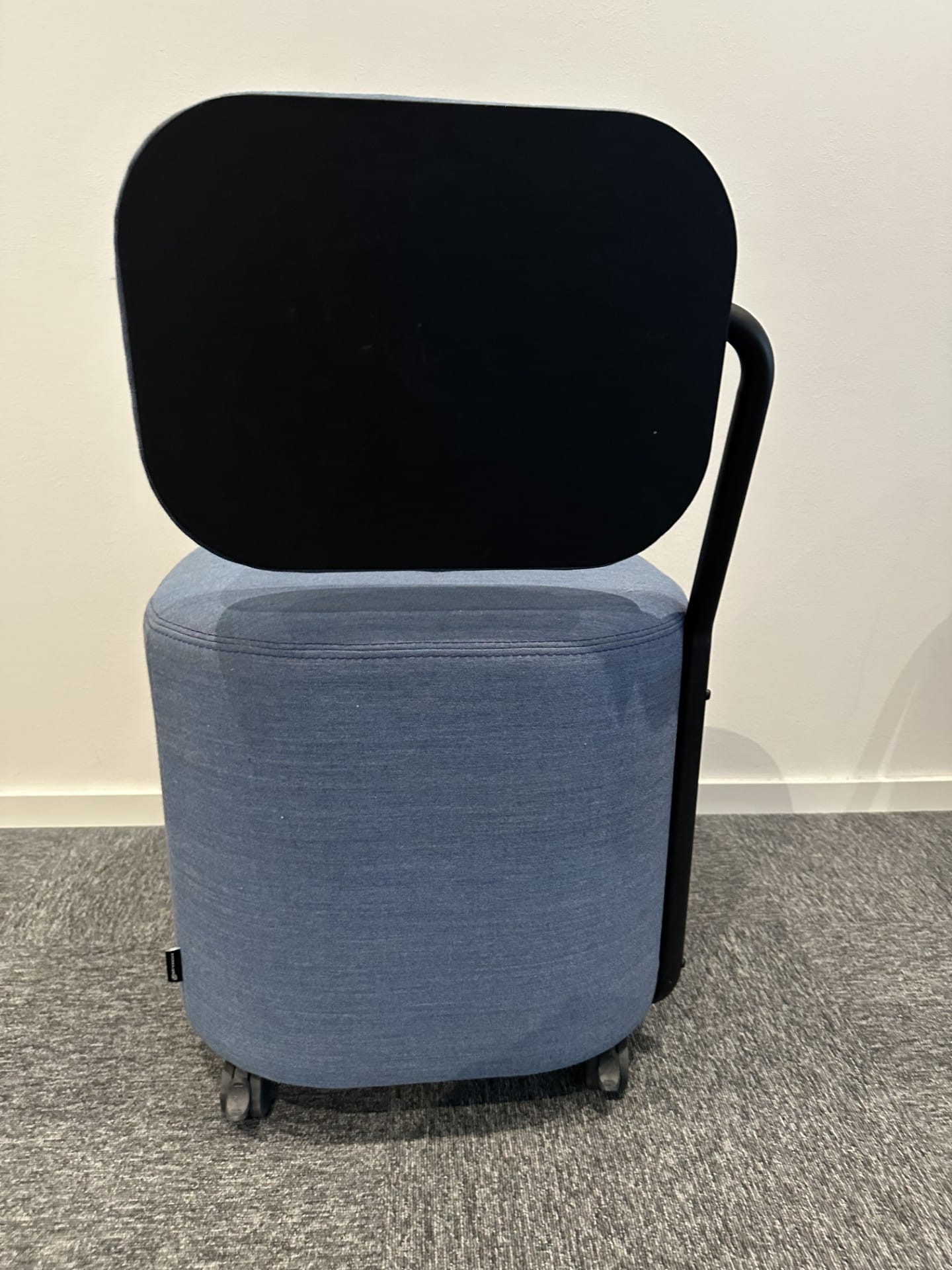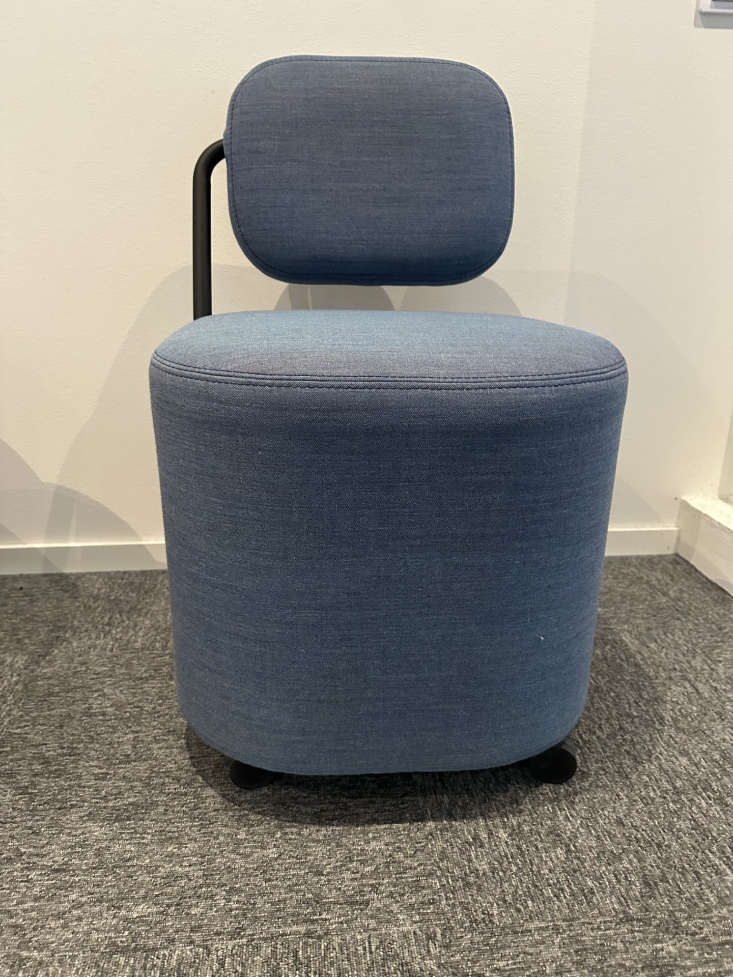 Sæde og ryg i stof (blå). Sokkel i plast (sort).