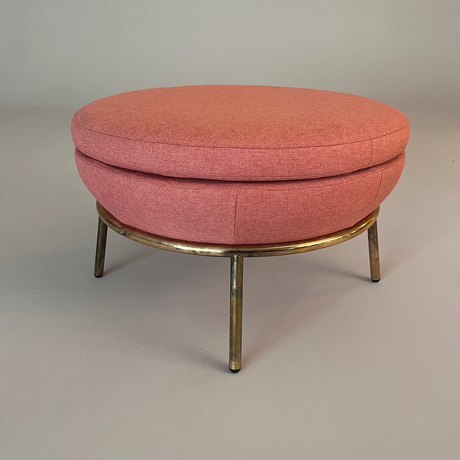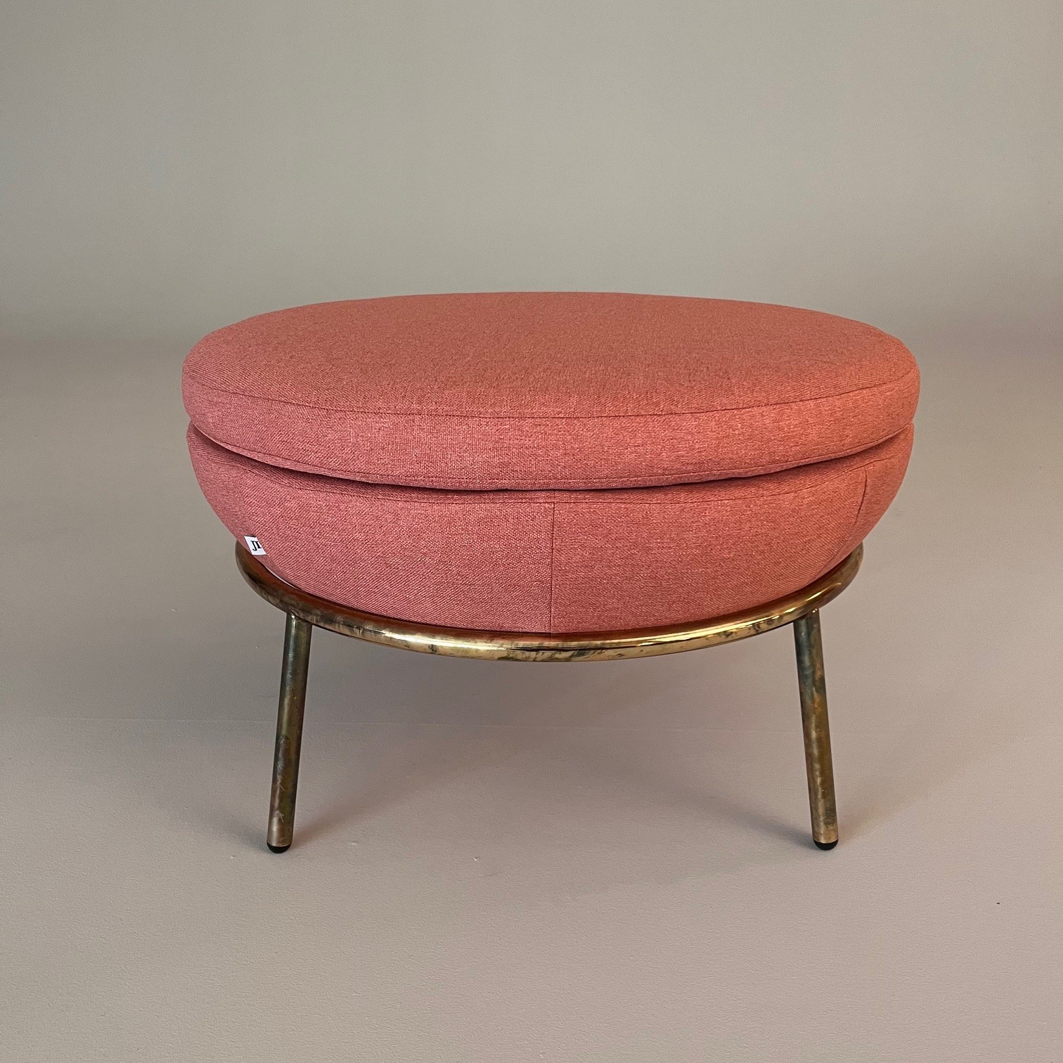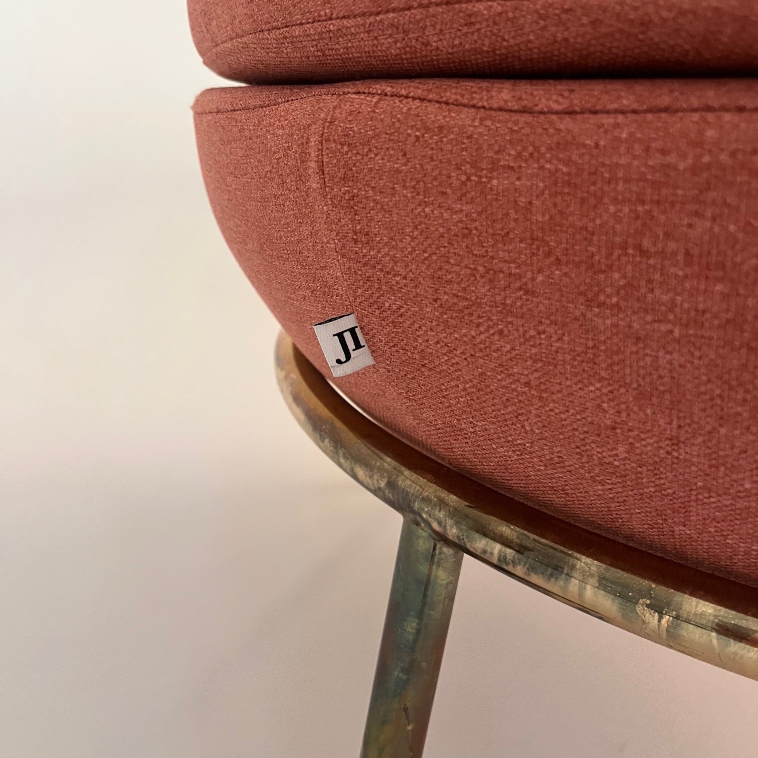 Sæde i stof (lyserød). 4-bensstel i metal (mässing).