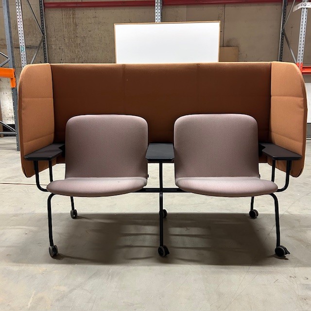 Sæde i stof (beige). Ryg i stof (orange). 4-bensstel i metal (sort).