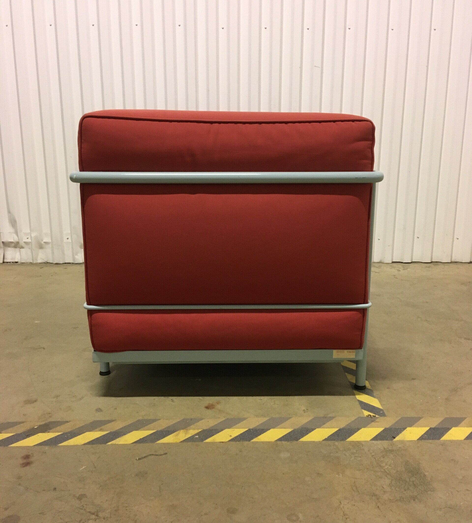 Sæde og ryg i stof (rød). Medestel i metal (blå).