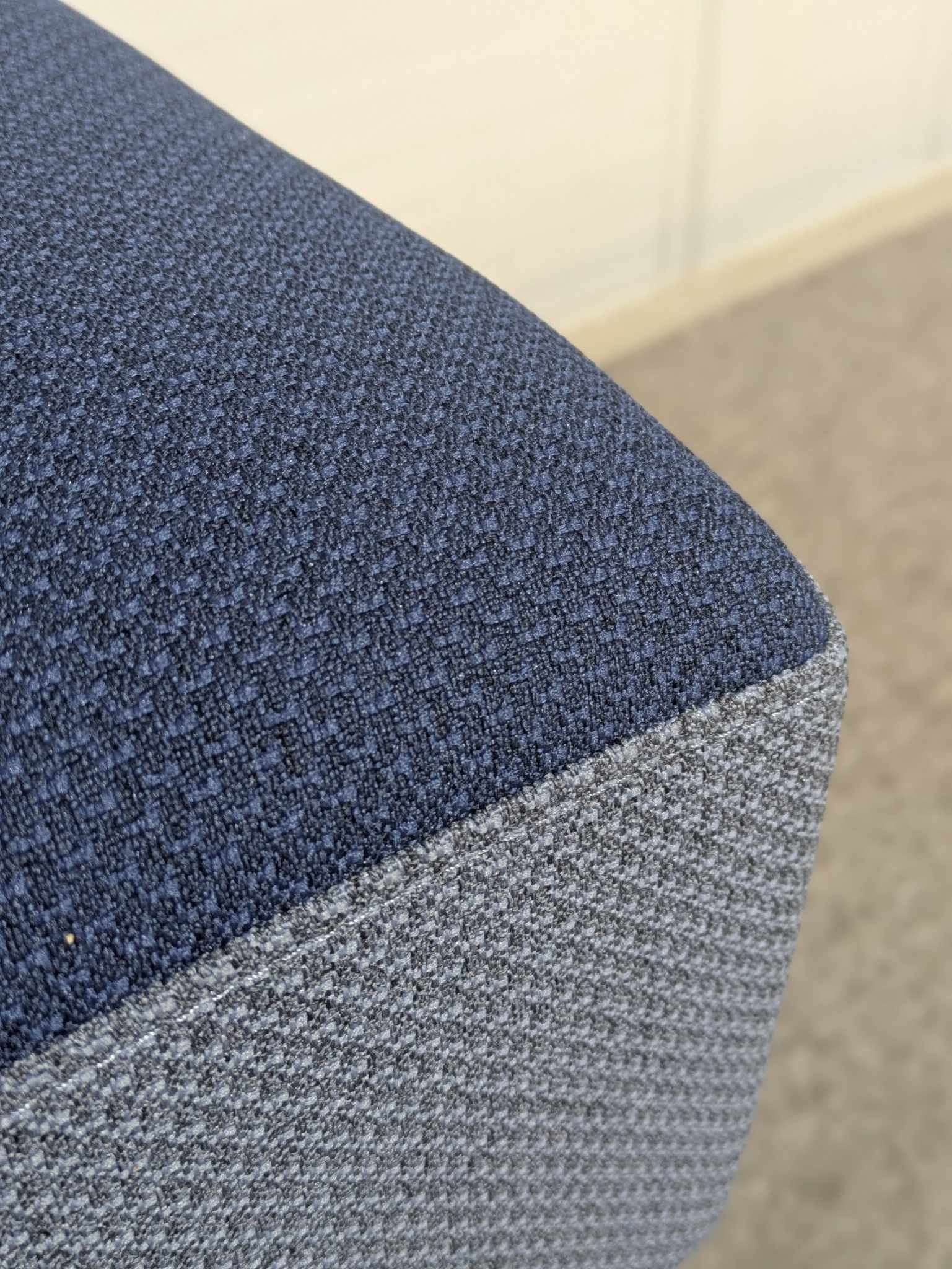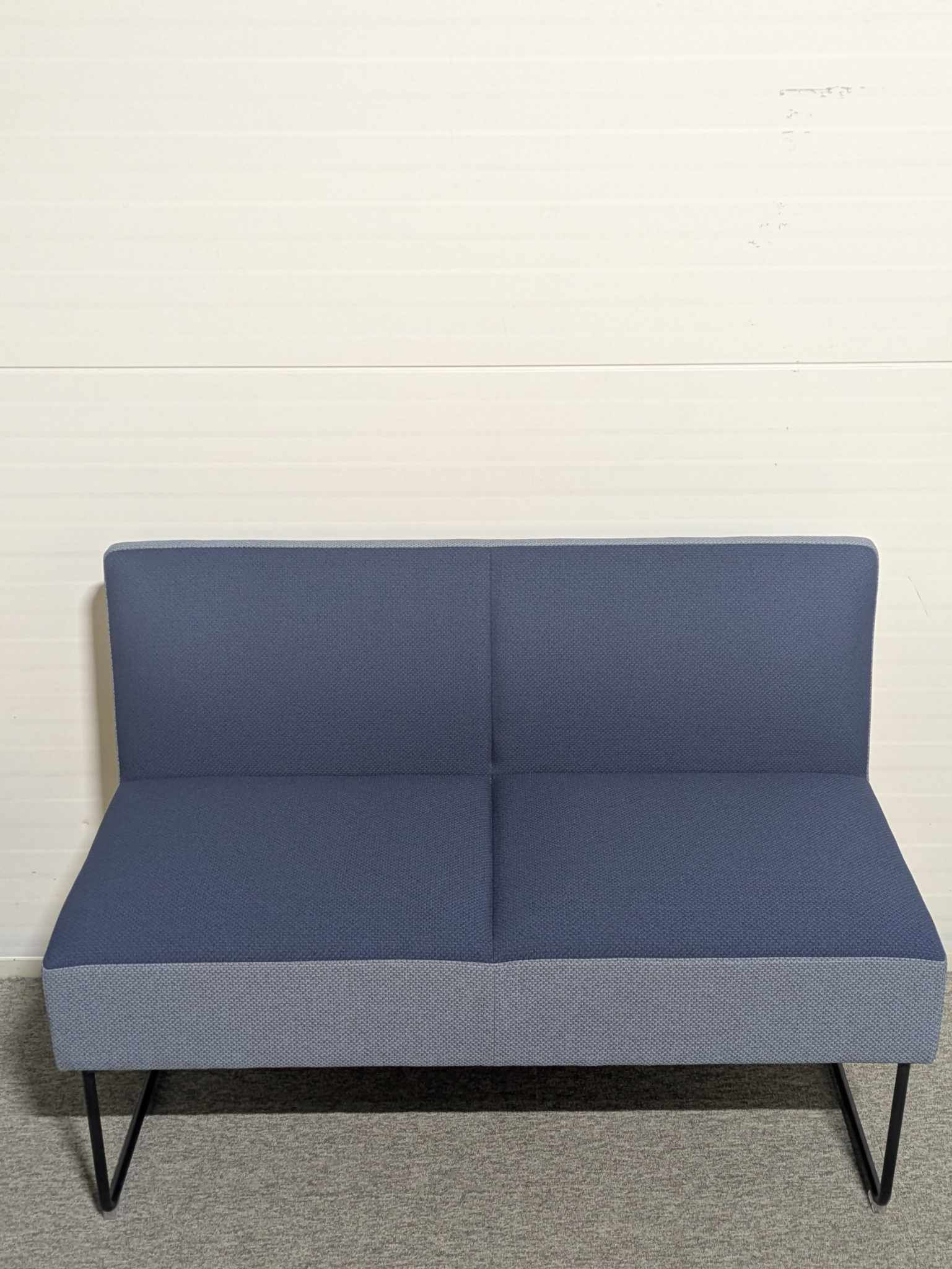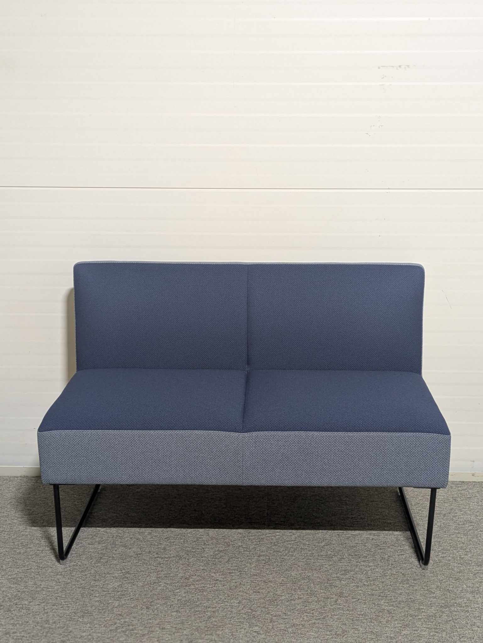 Sæde og ryg i stof (blå). Medestel i metal (sort).