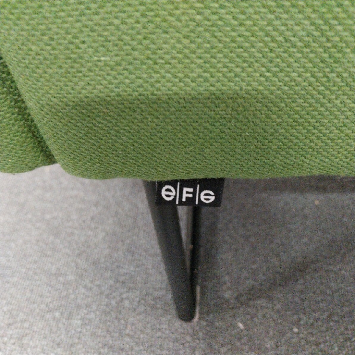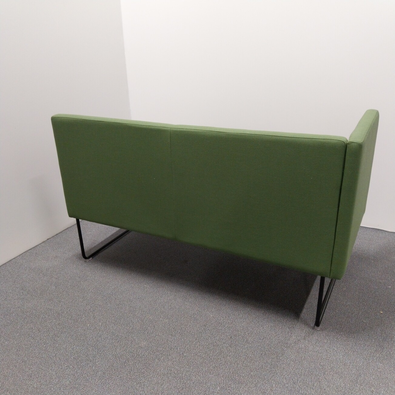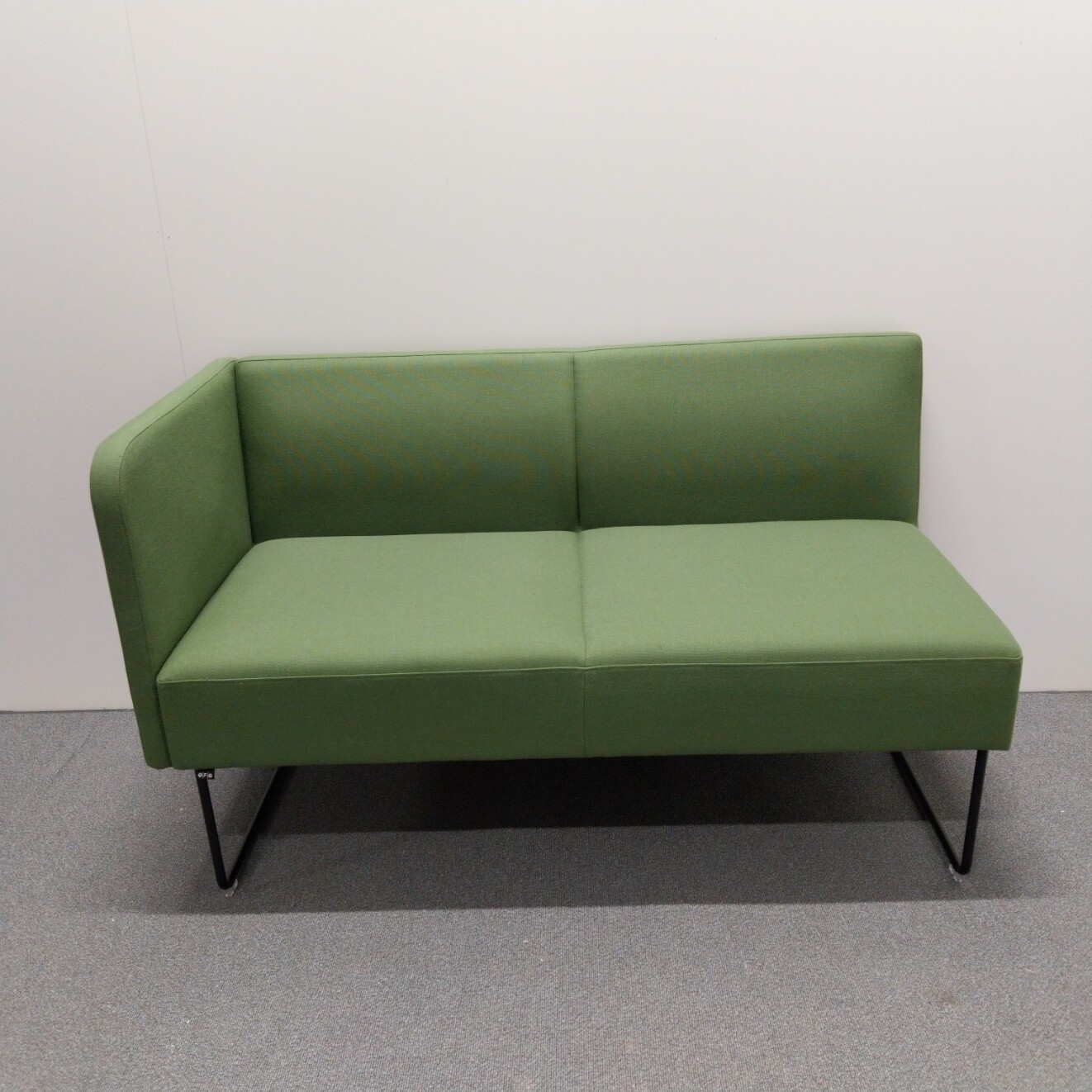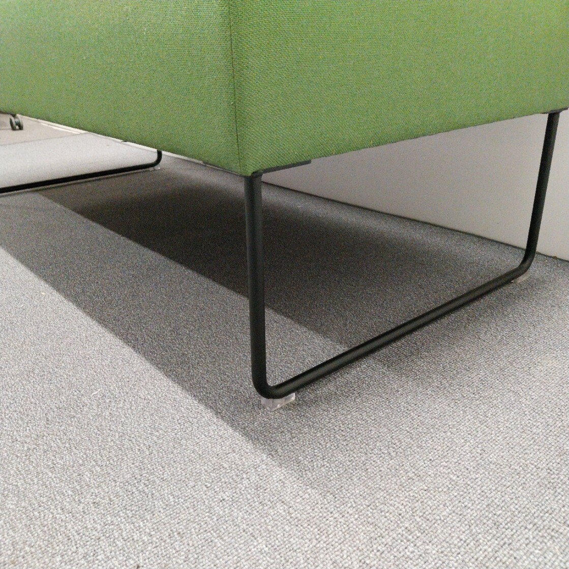 Sæde og ryg i stof (grøn). Medestel i metal (sort).