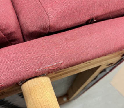 Sæde og ryg i stof (lyserød). 4-bensstel i træ (eg).
