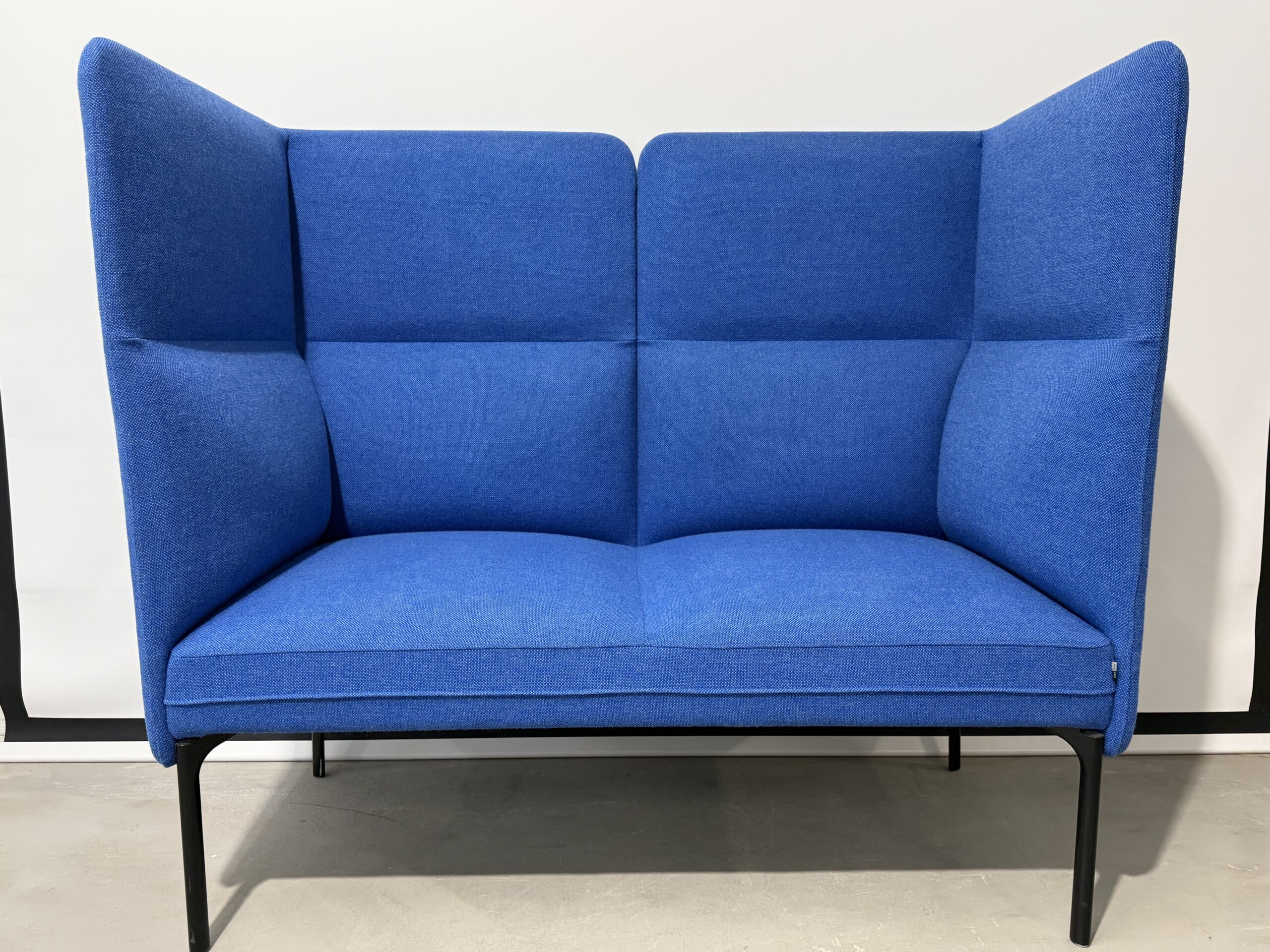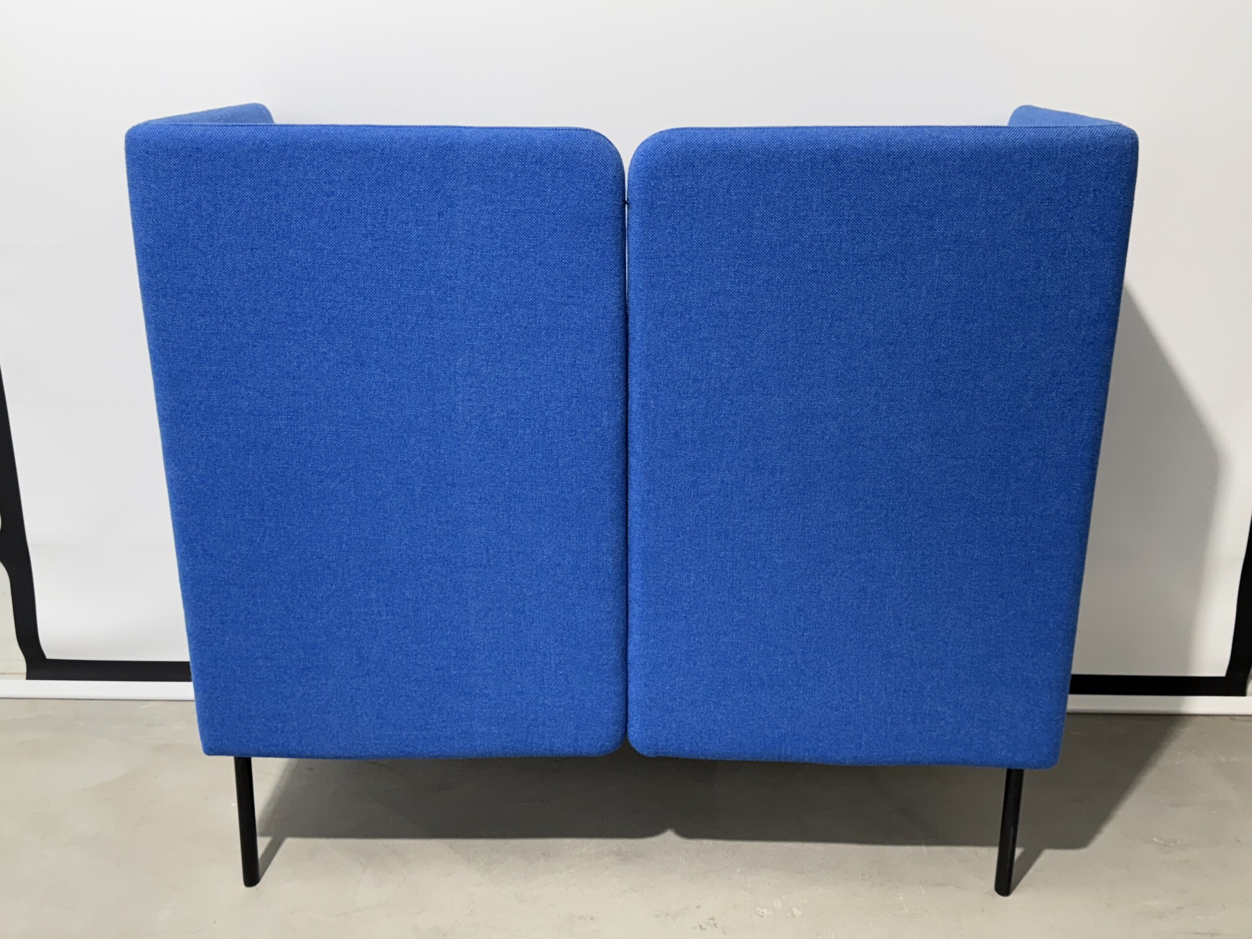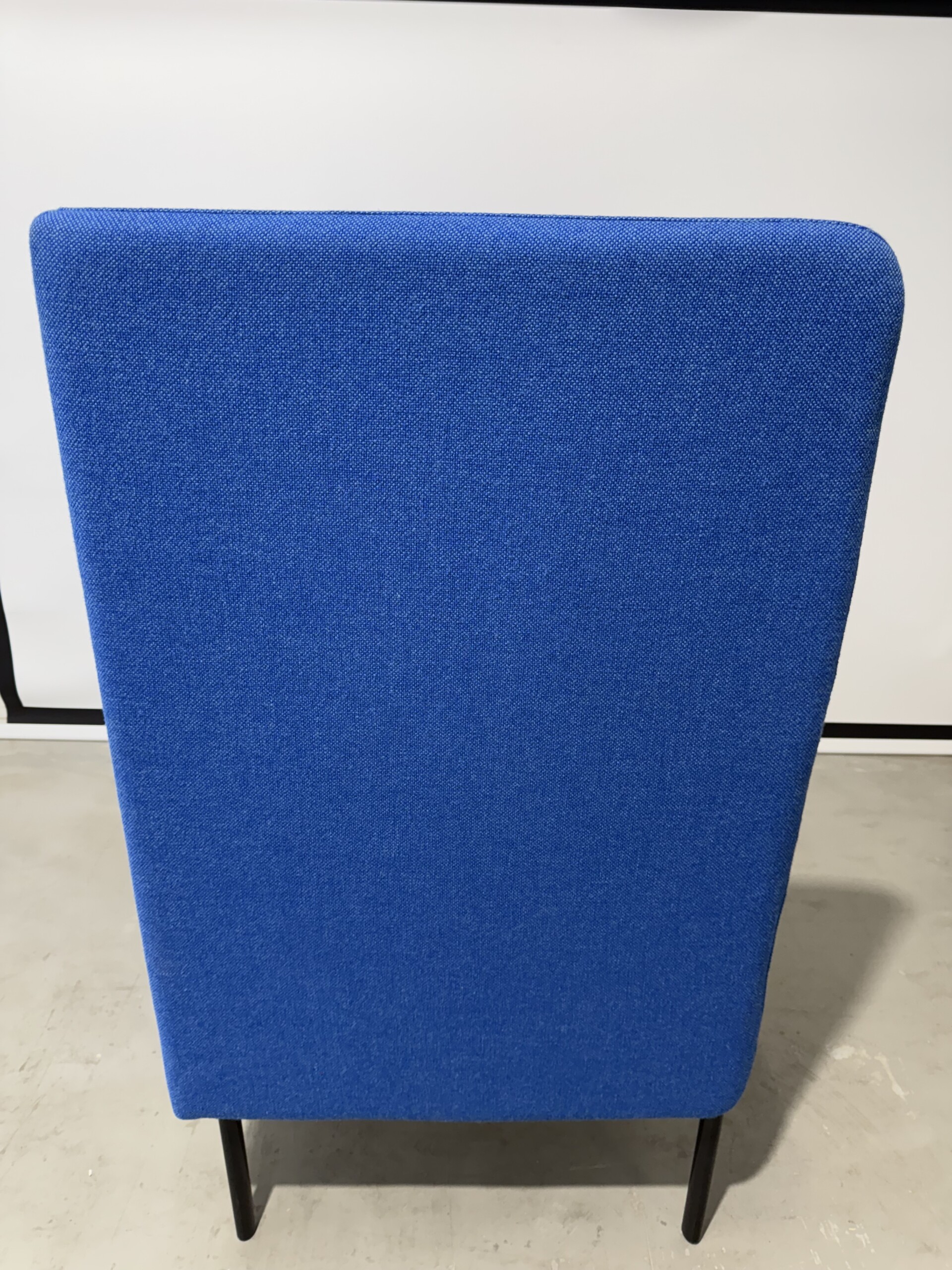 Sæde og ryg i stof (blå). 4-bensstel i metal (sort).