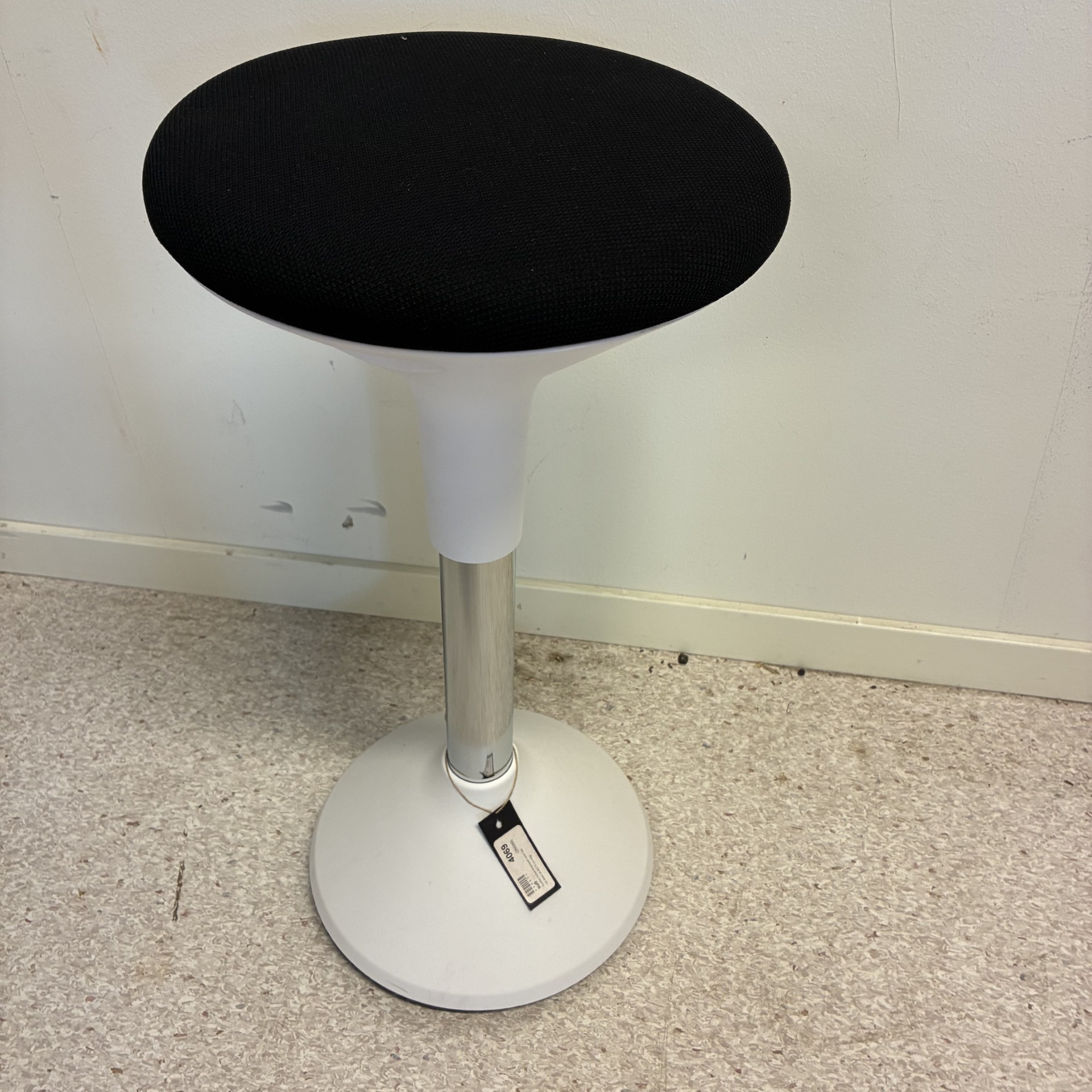 Sæde i stof (sort). Søjlefod i plast (hvid).