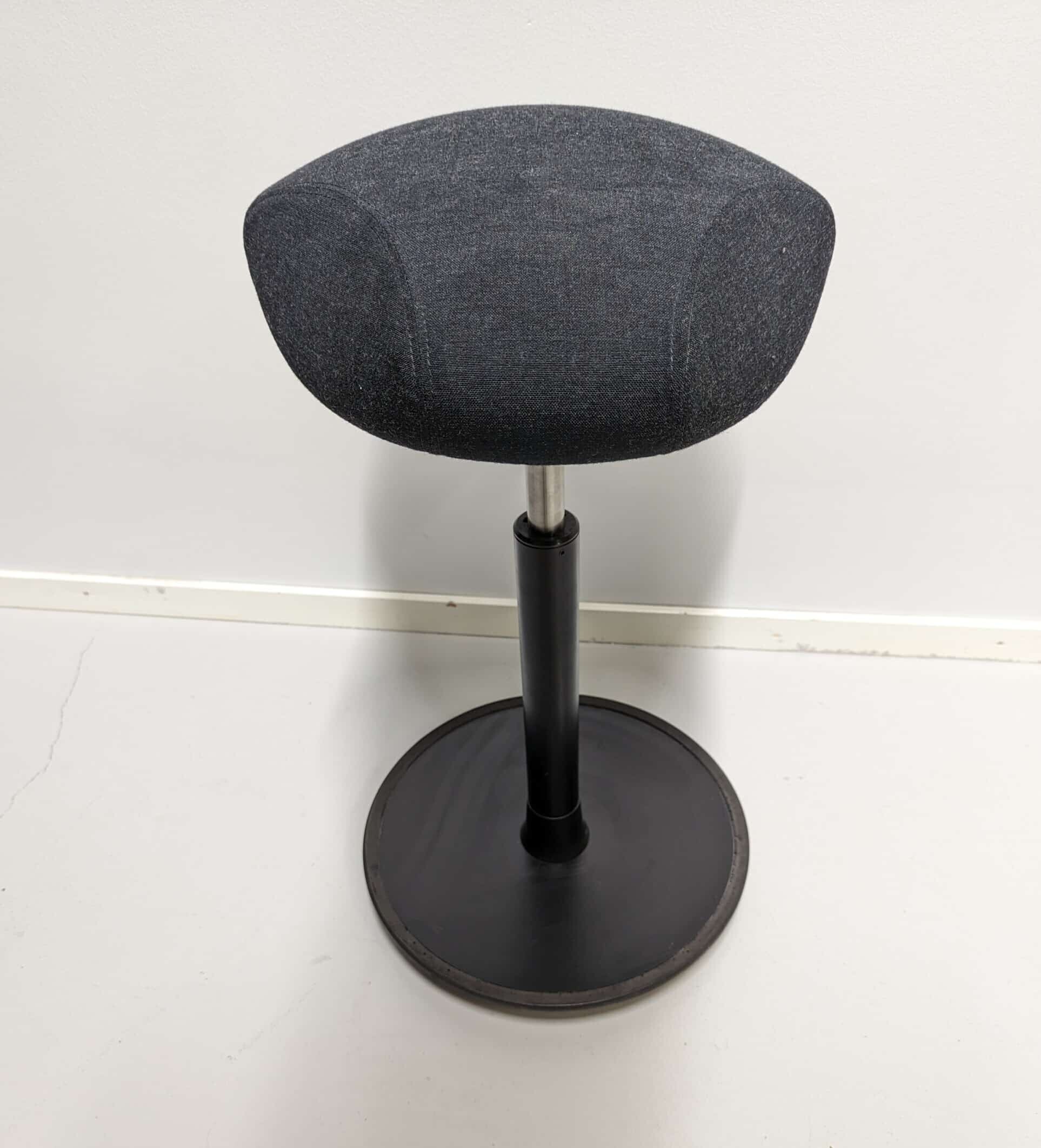 Sæde i stof (grå). Søjlefod i metal (sort).