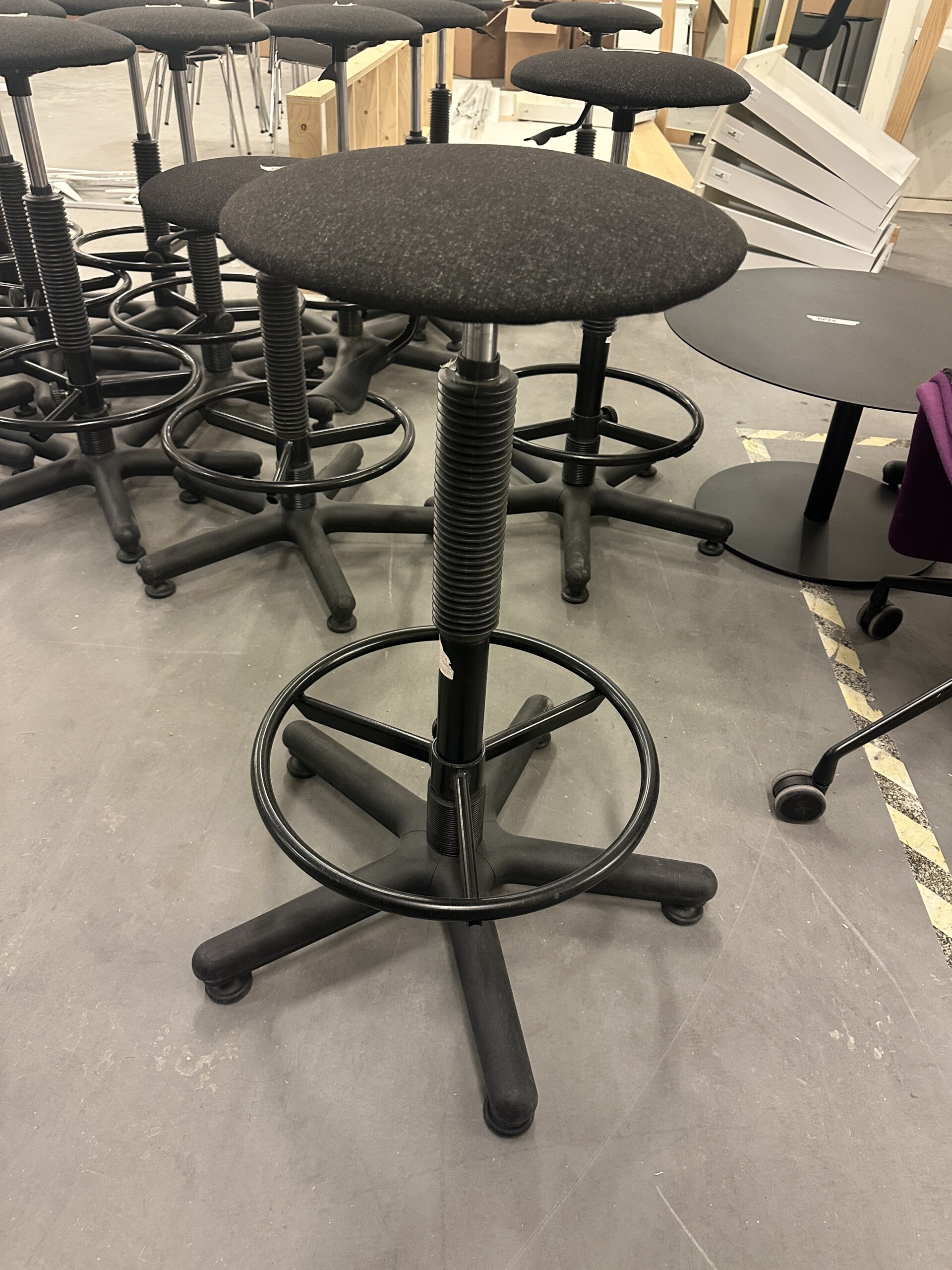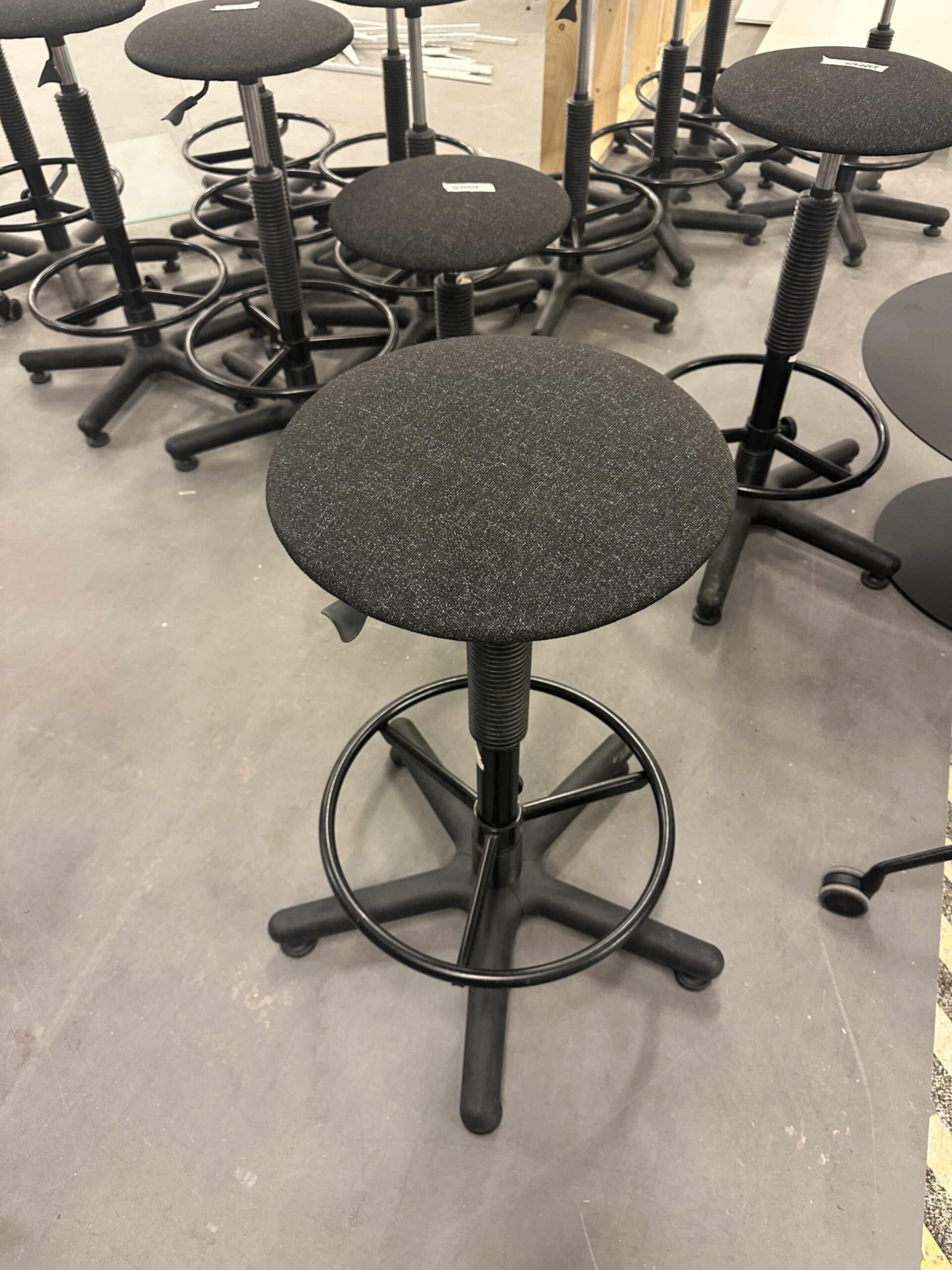 Sæde i stof (grå). Fodkryds i plast (sort). Højdejusterbar.