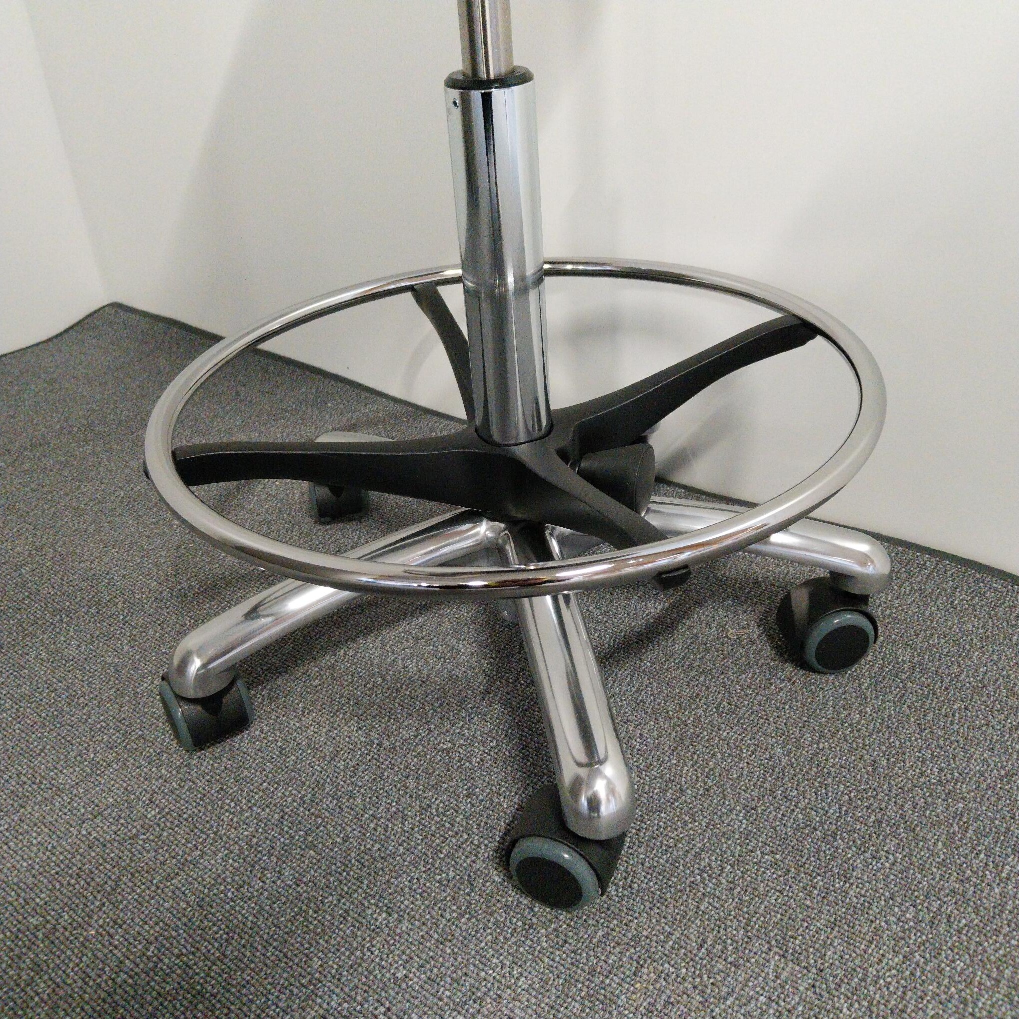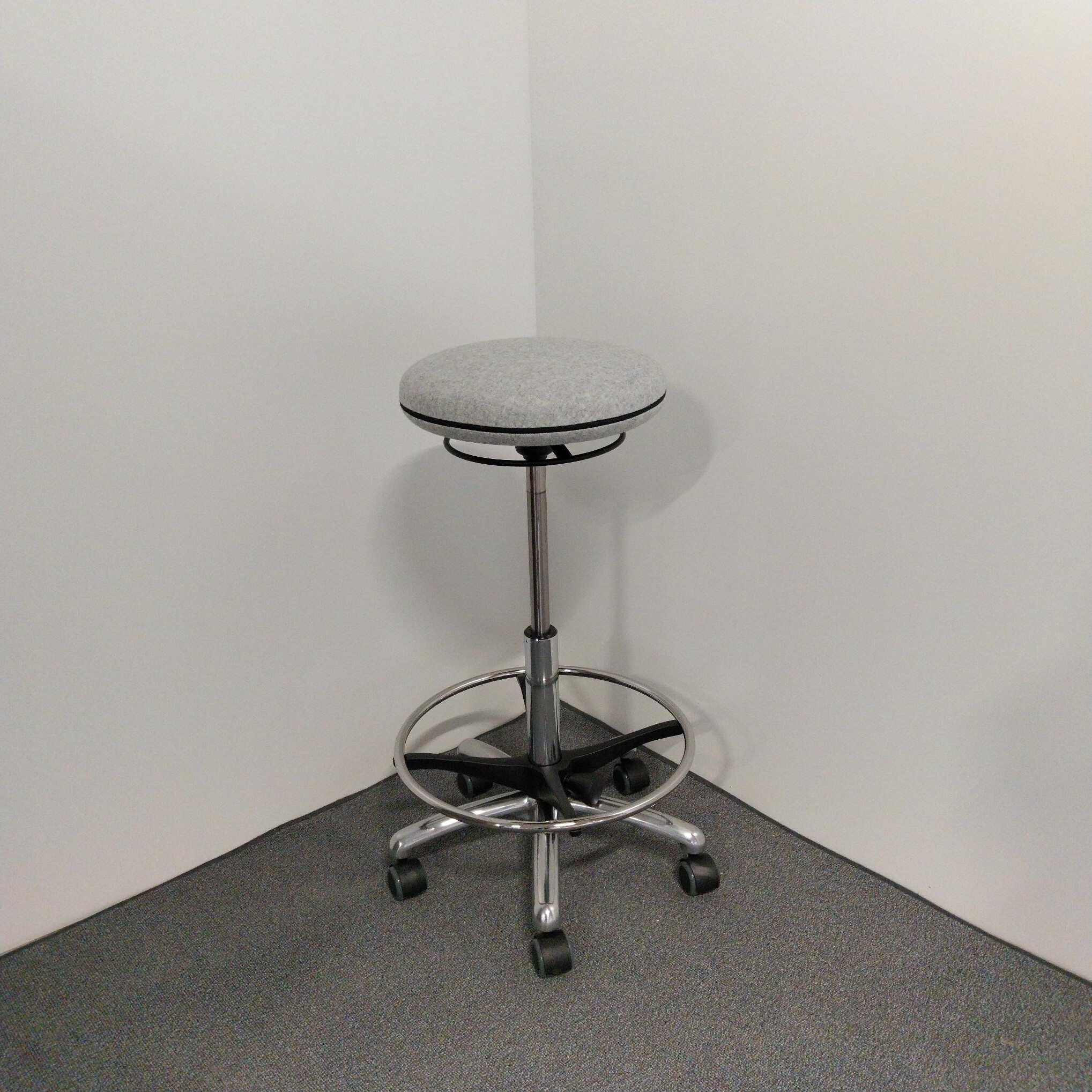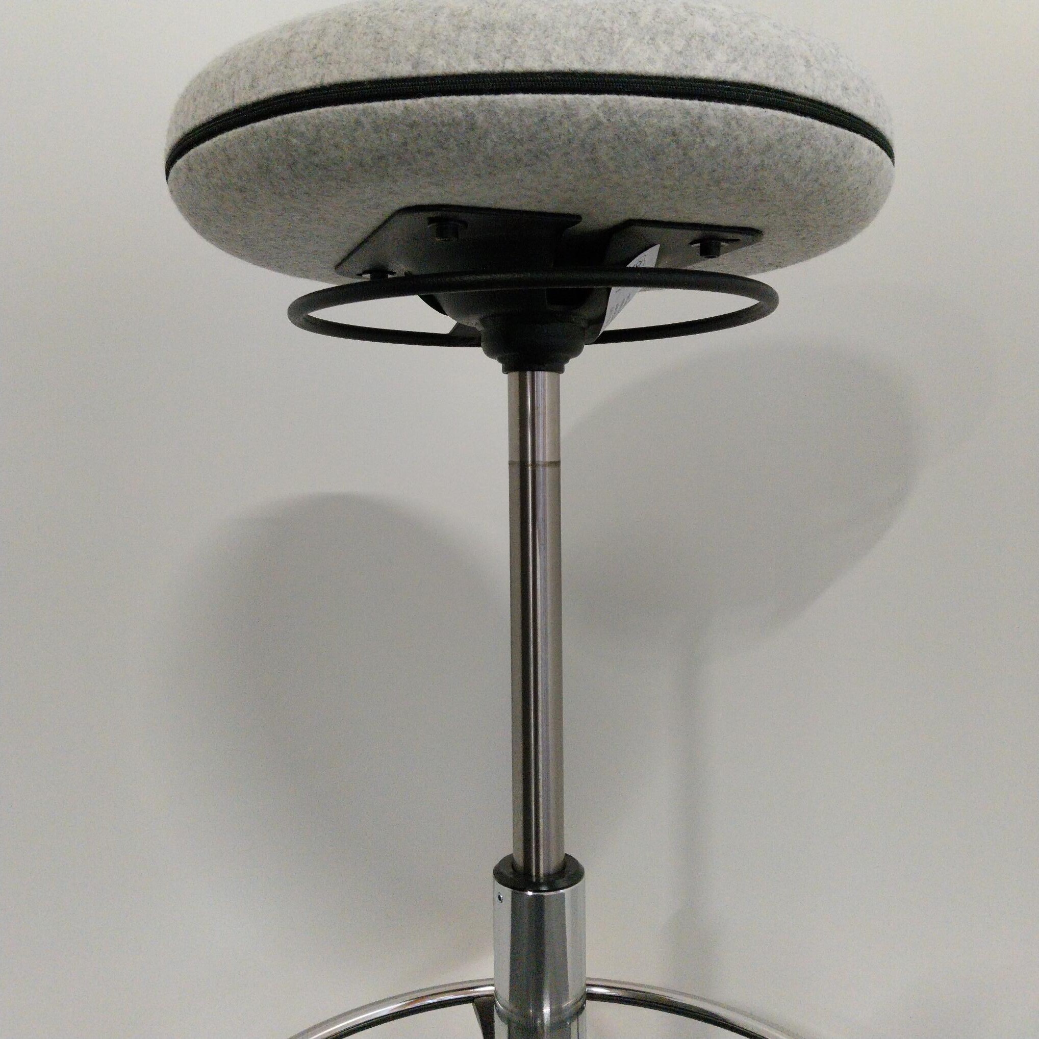 Sæde i stof (grå). Fodkryds i metal (aluminium). Højdejusterbar.