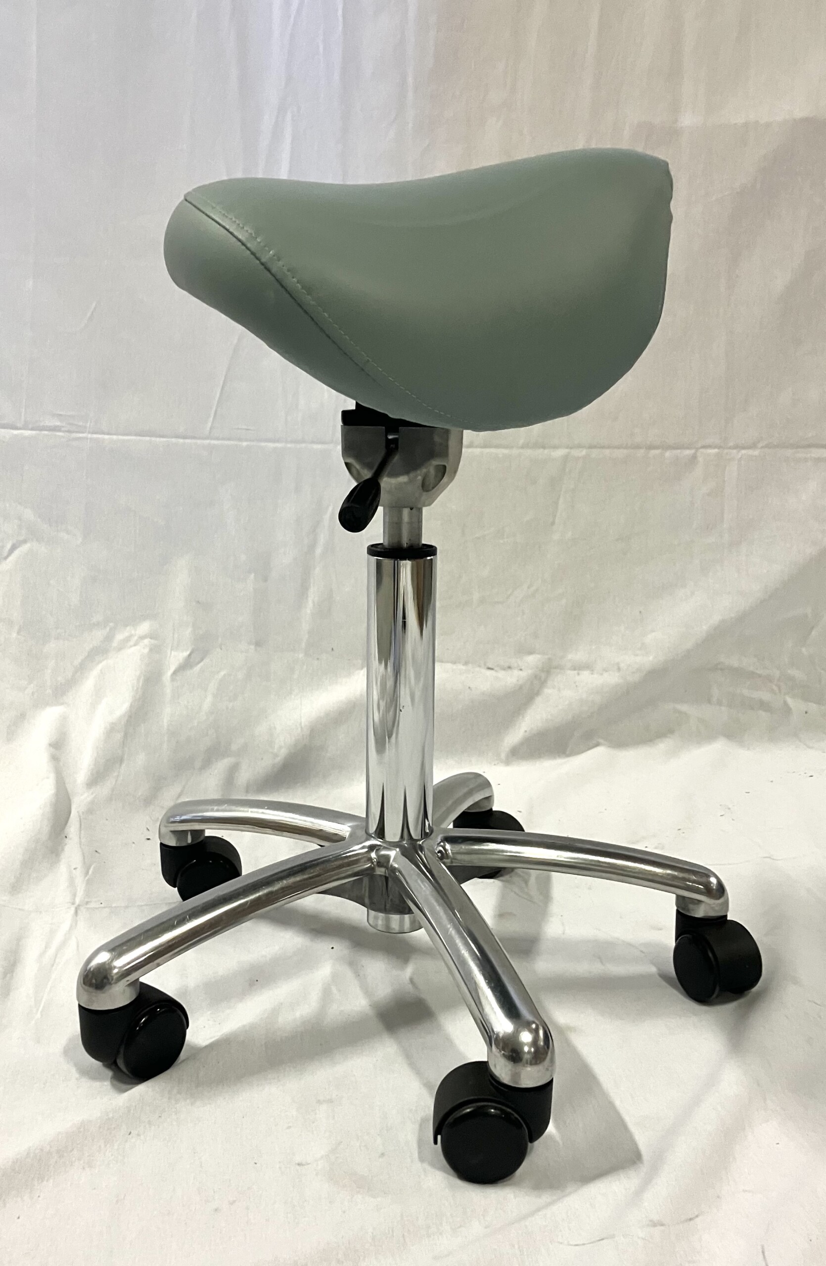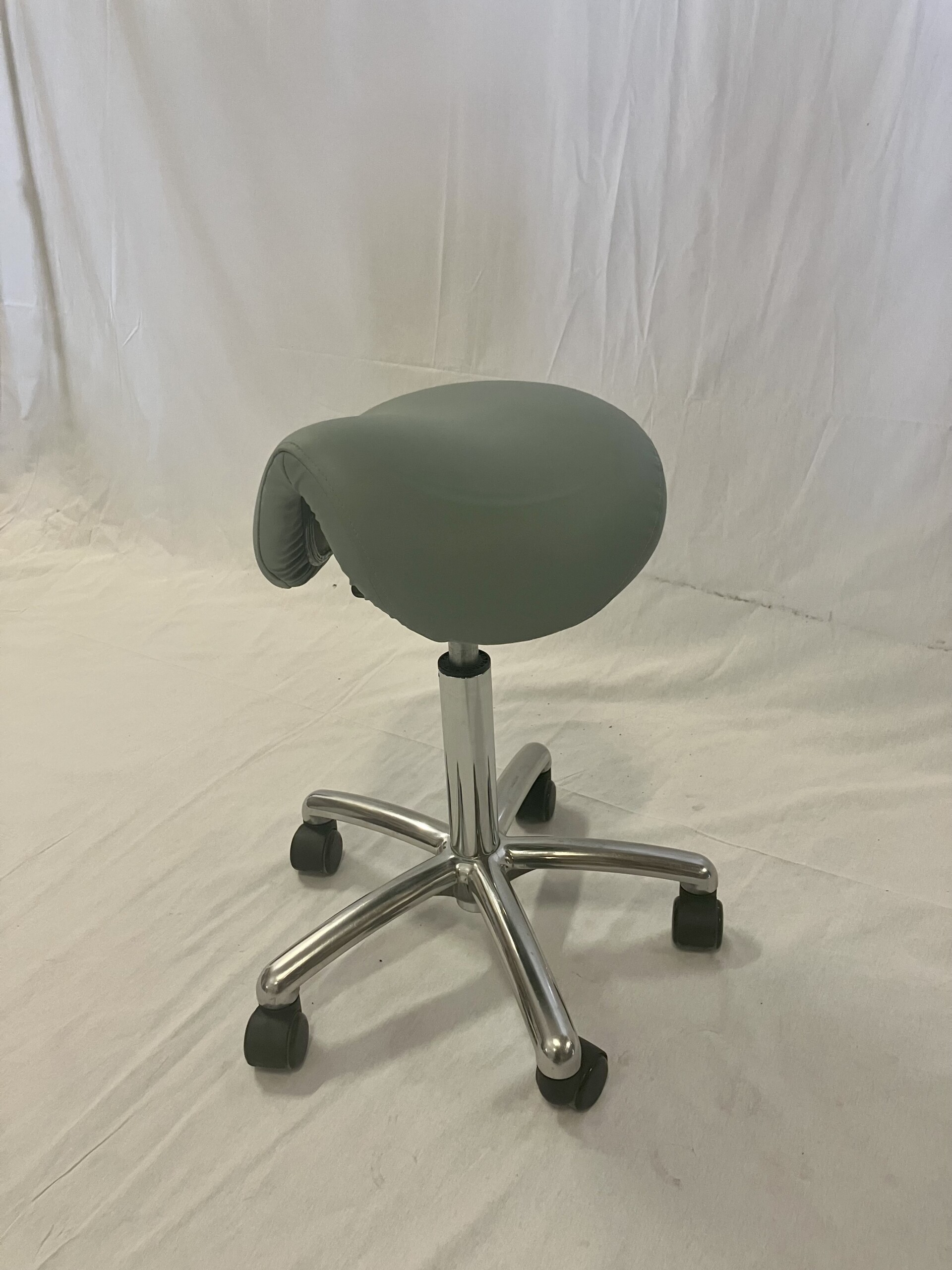 Sæde i kunstlæder (grøn). Fodkryds i metal (krom). Højdejusterbar.