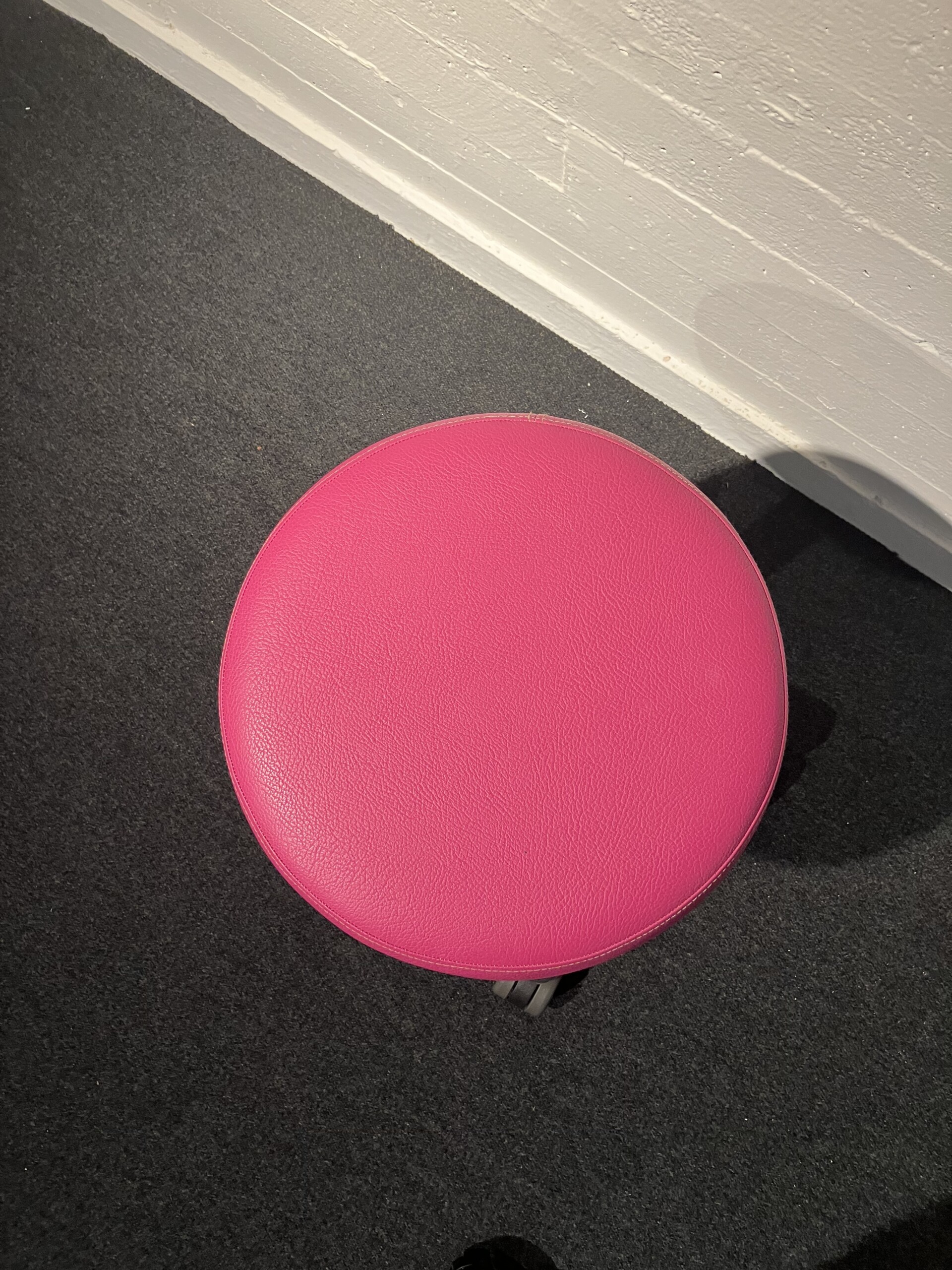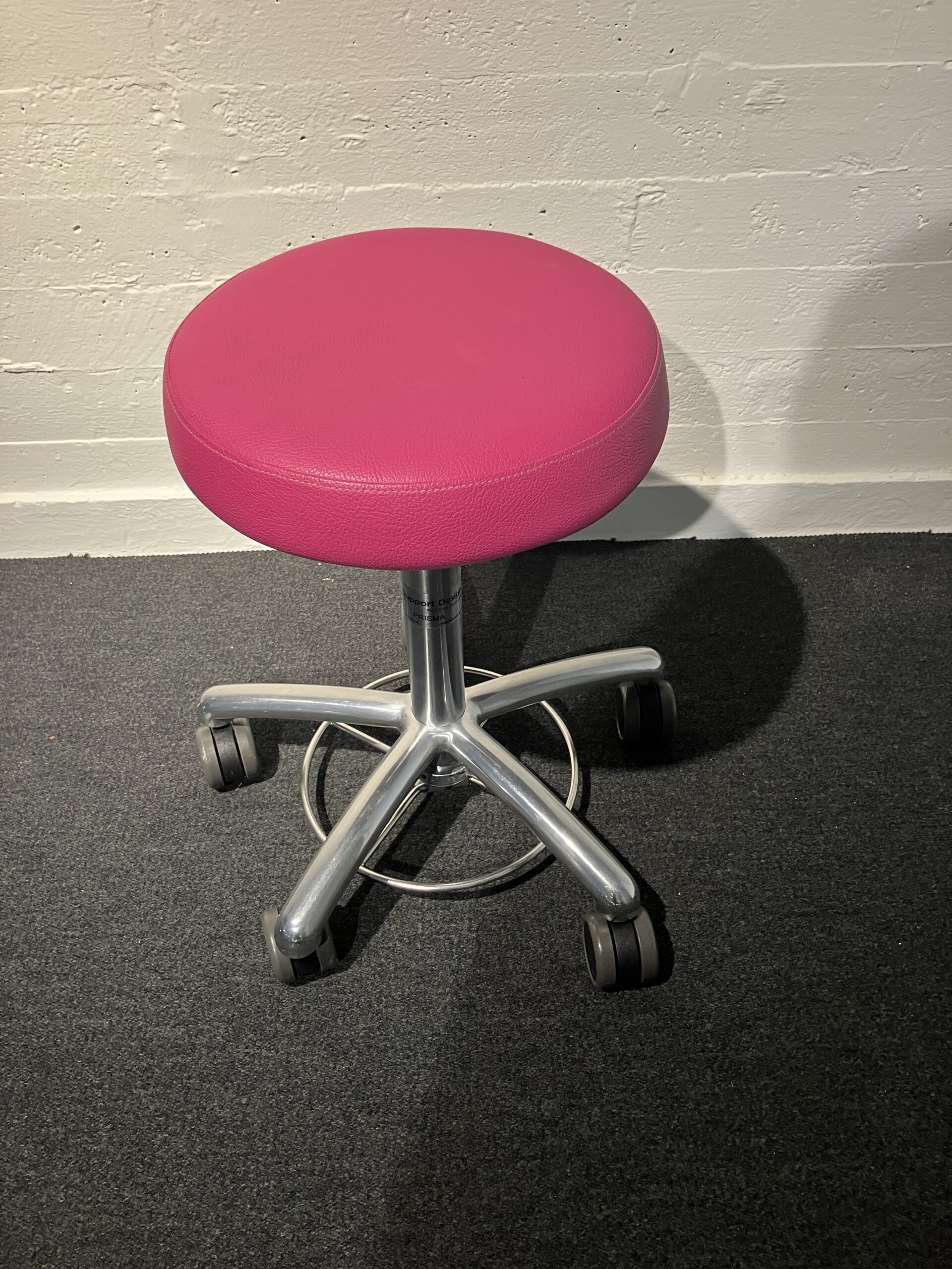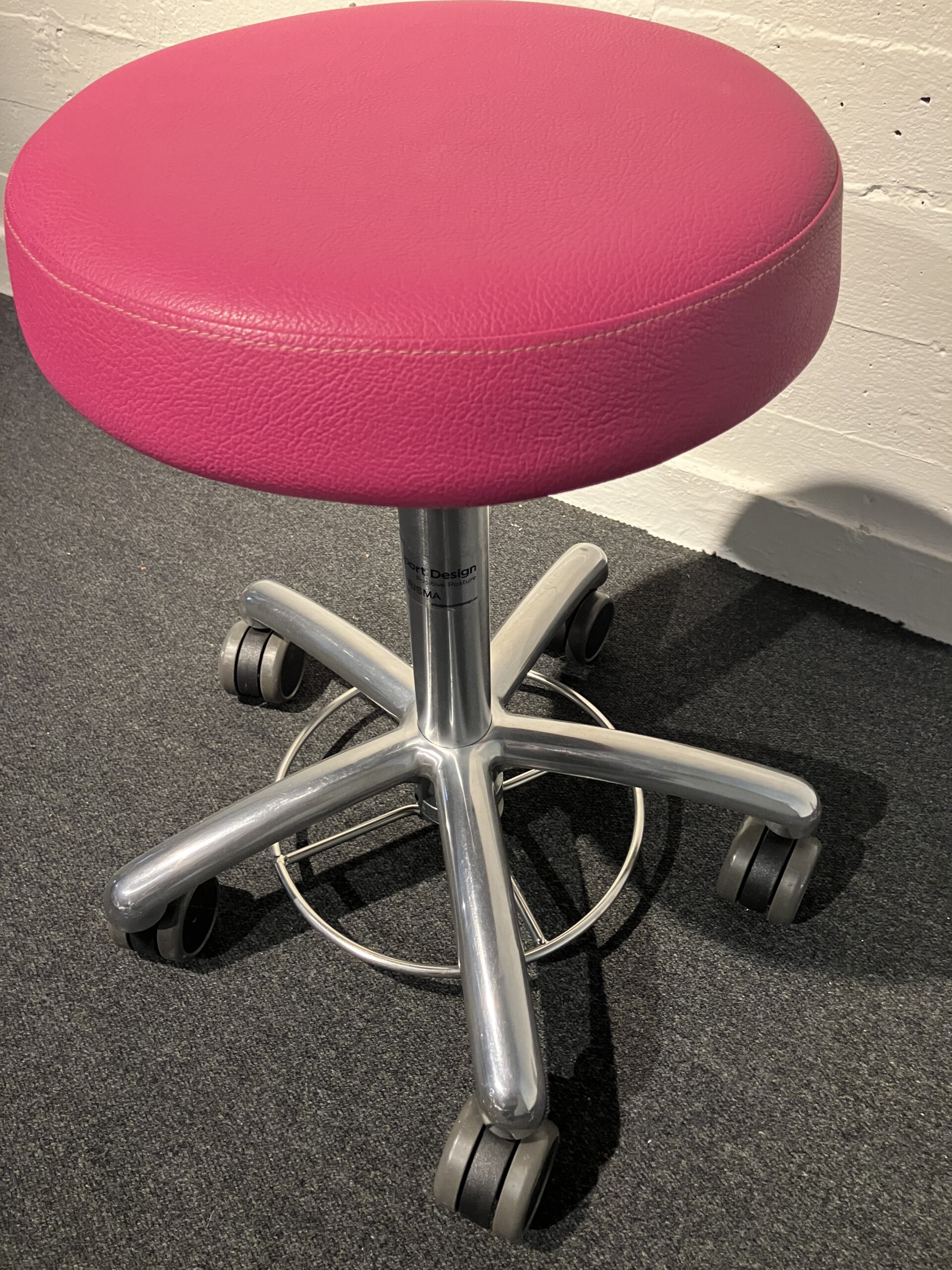 Sæde i kunstlæder (lyserød). Fodkryds i metal (krom). Højdejusterbar.