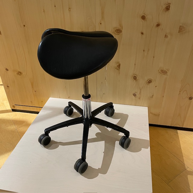 Sæde i læder (sort). Fodkryds i metal (sort). Højdejusterbar.