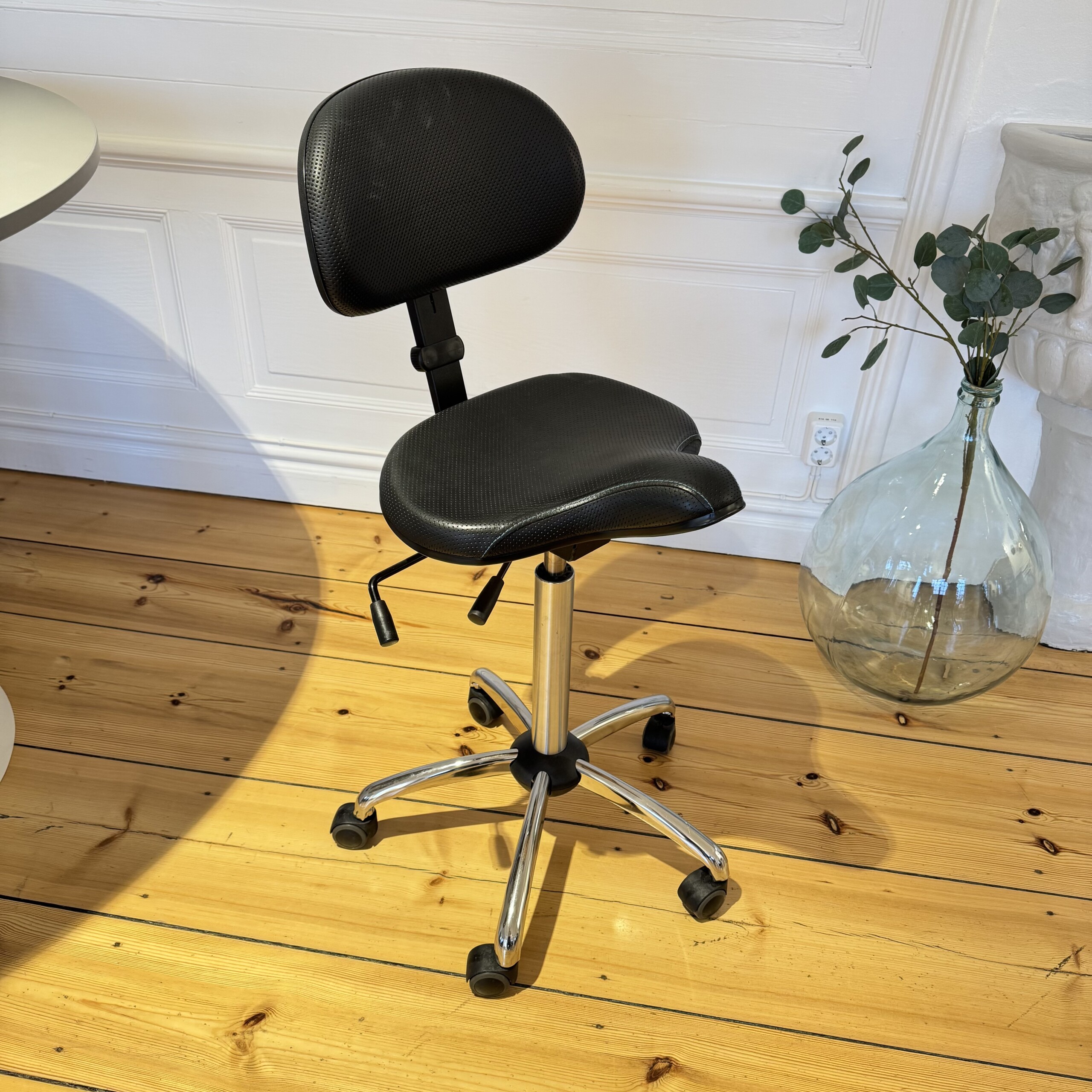 Sæde og ryg i læder (sort). Fodkryds i metal (krom). Højdejusterbar.
