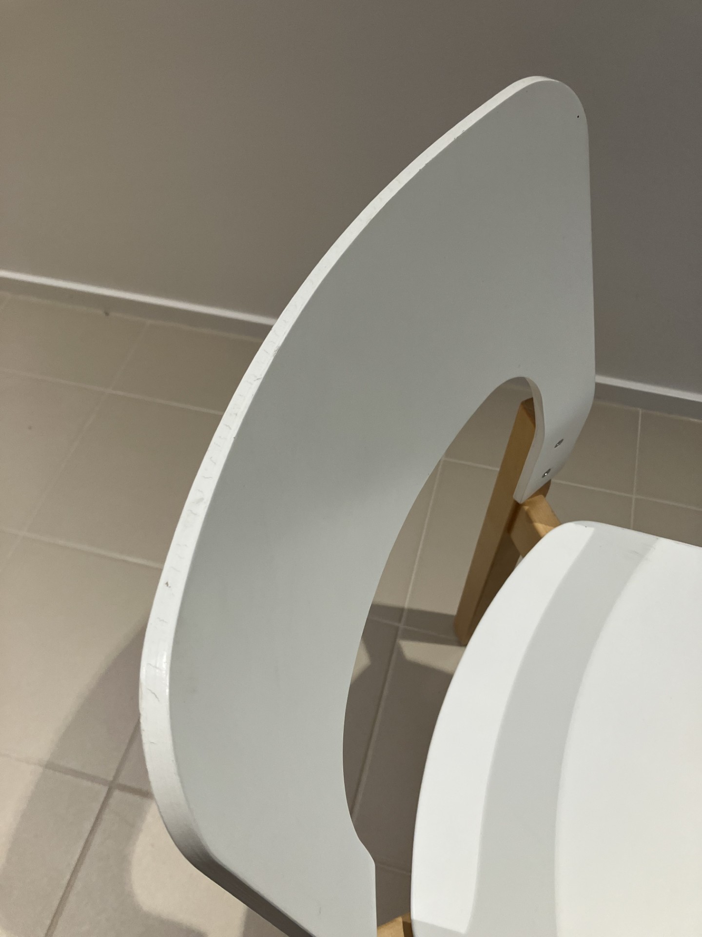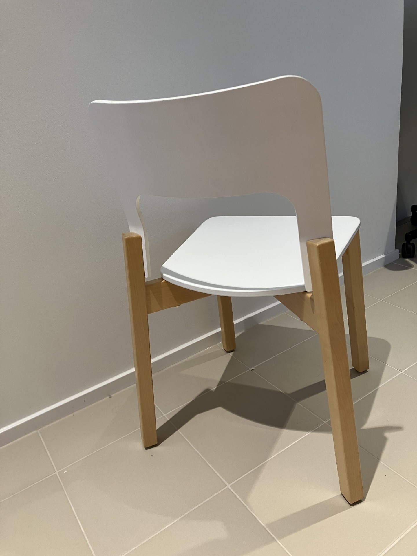 Sæde og ryg i laminat (hvid). 4-bensstel i træ (birk).