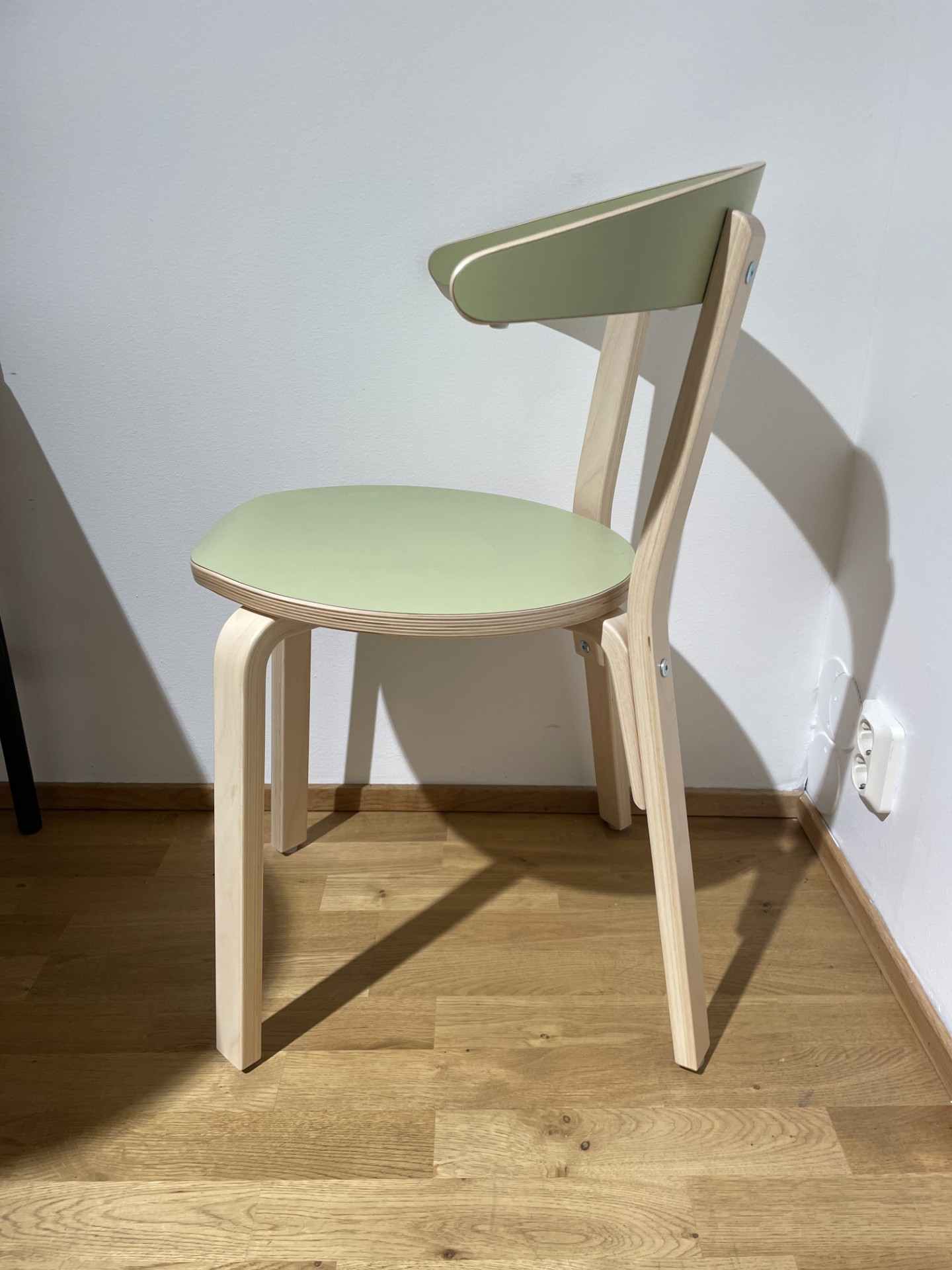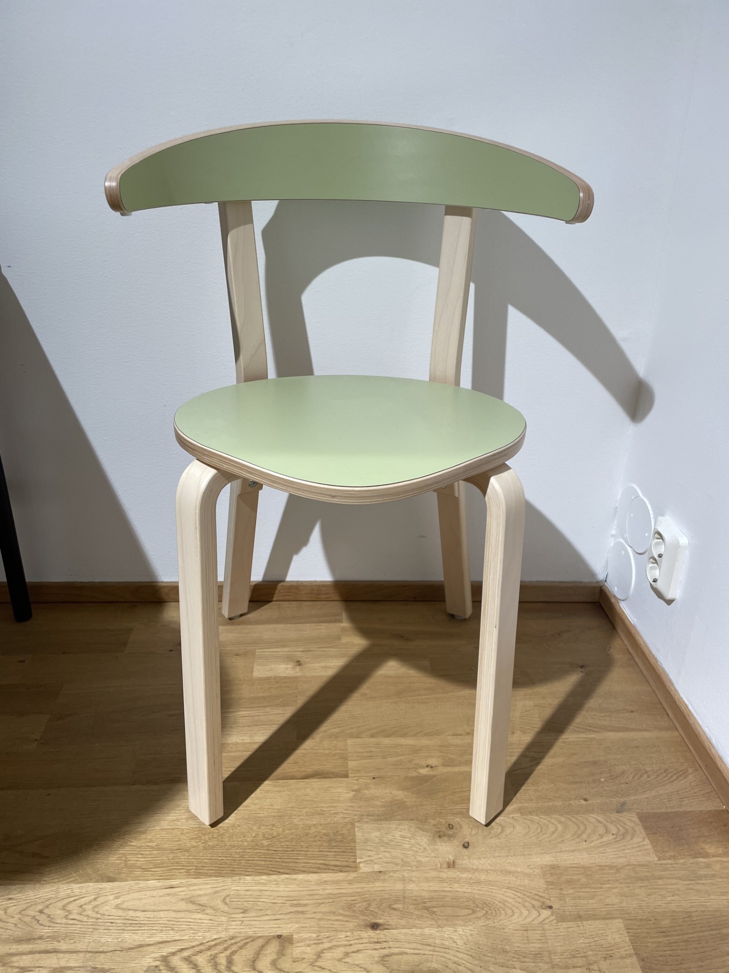 Sæde og ryg i træ (grøn). 4-bensstel i træ (birk).