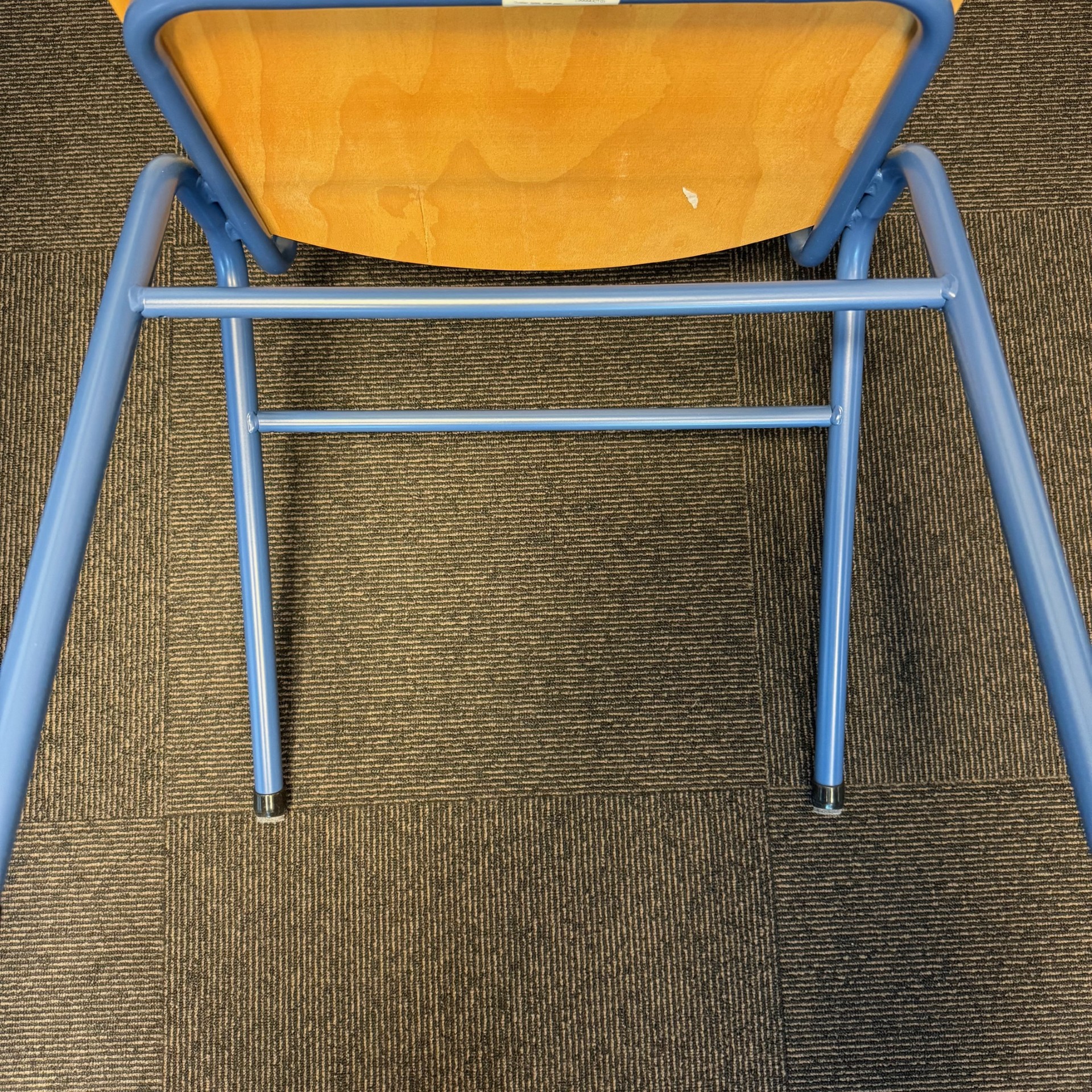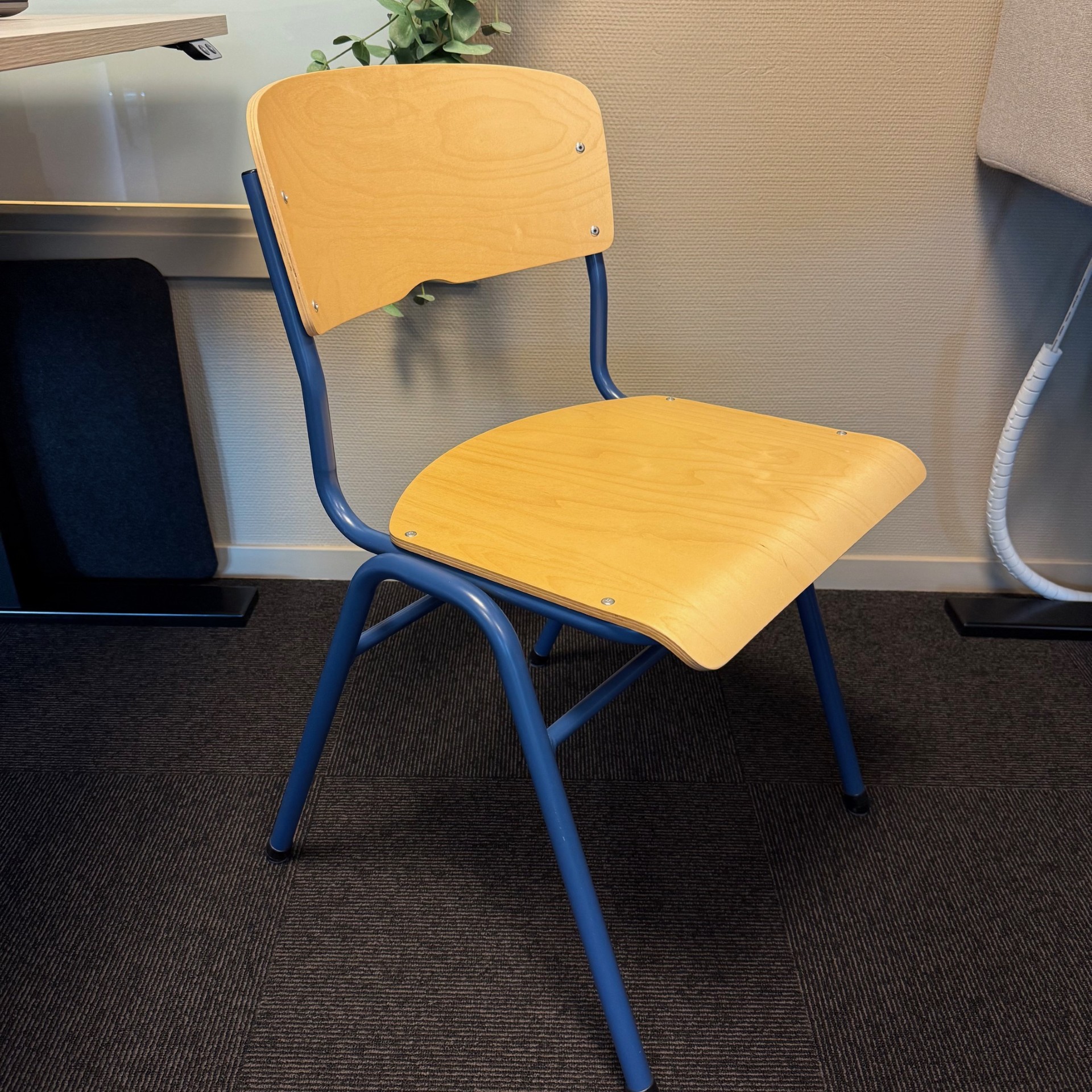 Sæde og ryg i træ (birk). 4-bensstel i metal (blå).