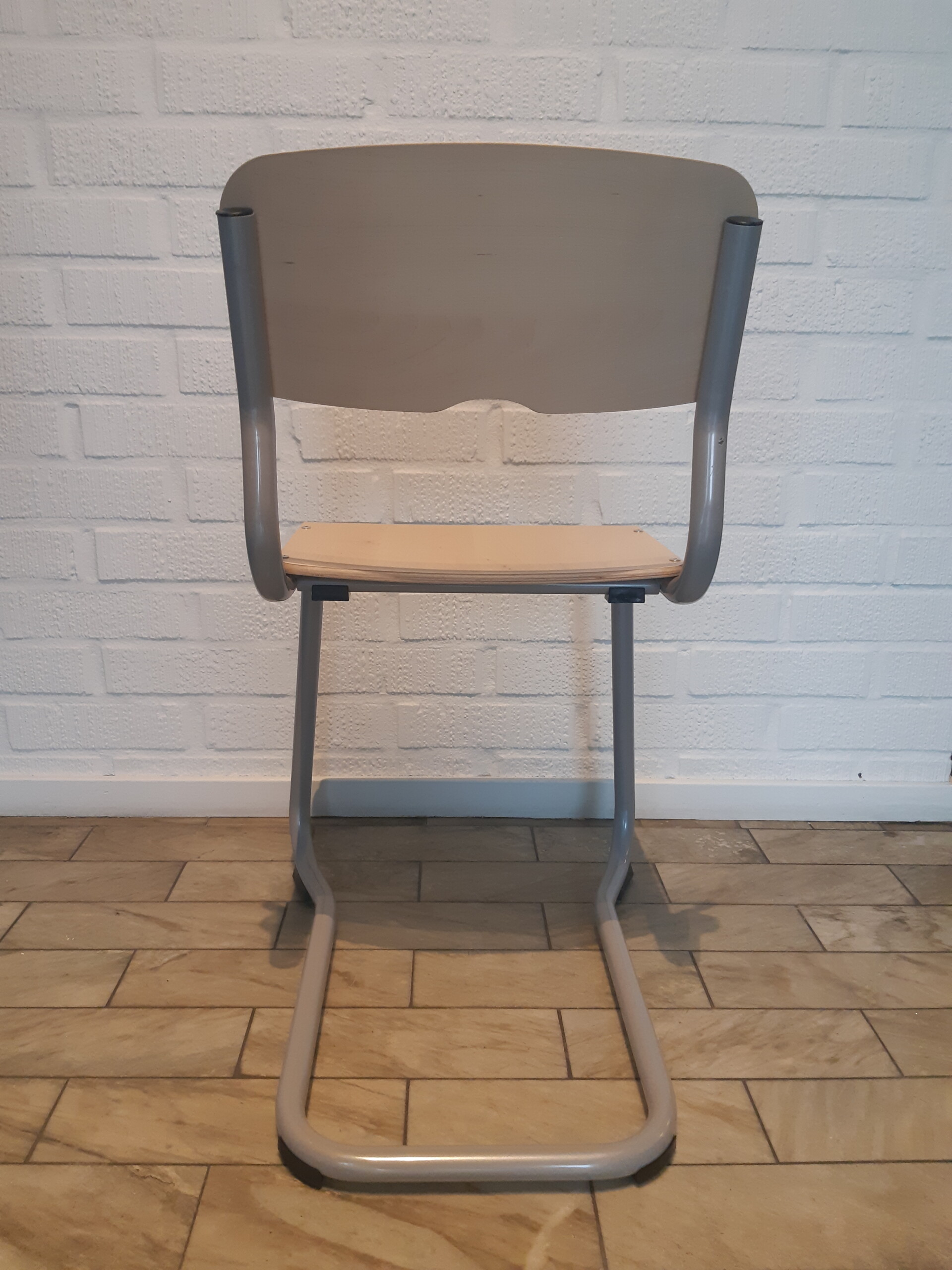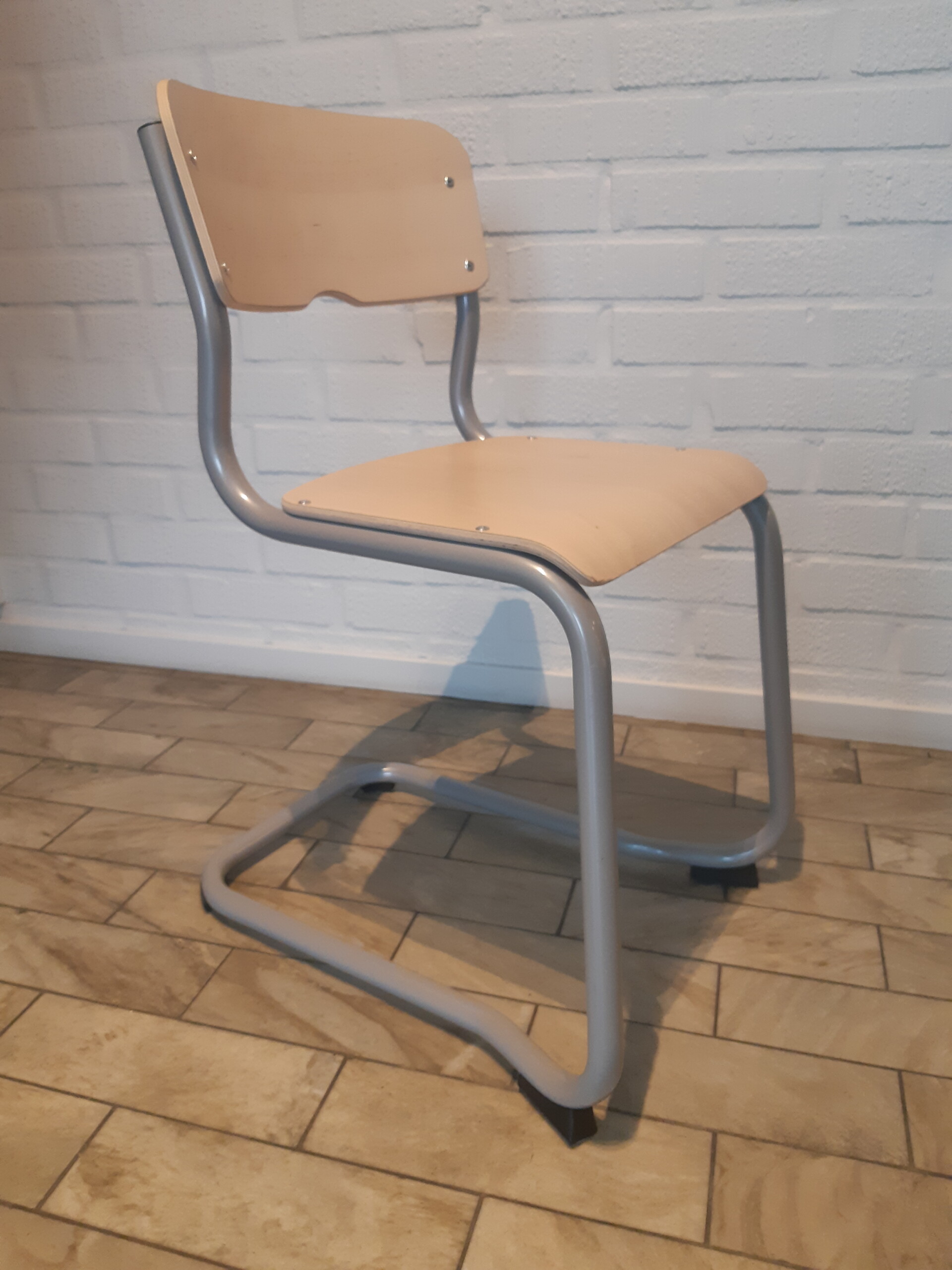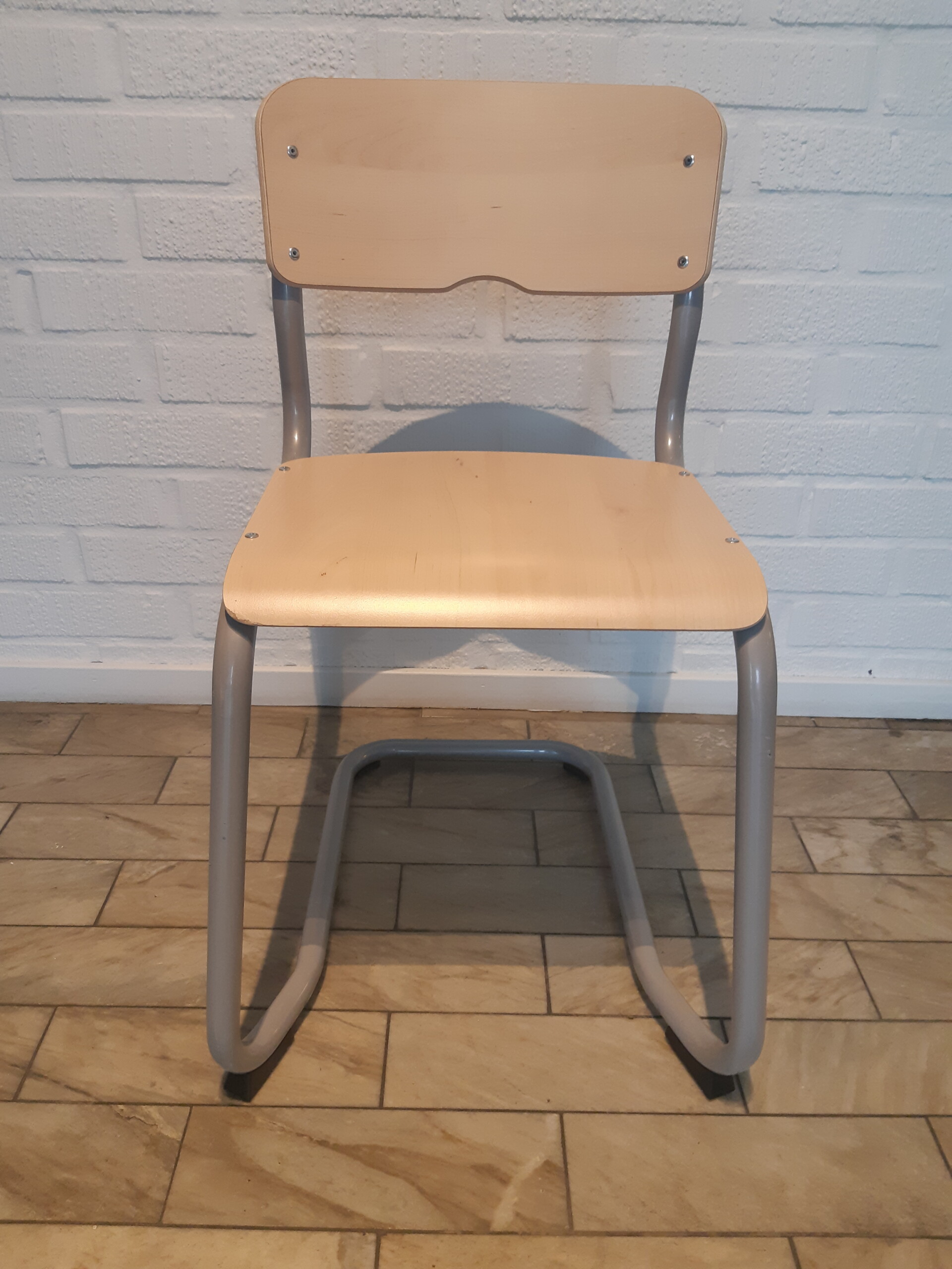 Sæde og ryg i laminat (birk). Medestel i metal (sølv).