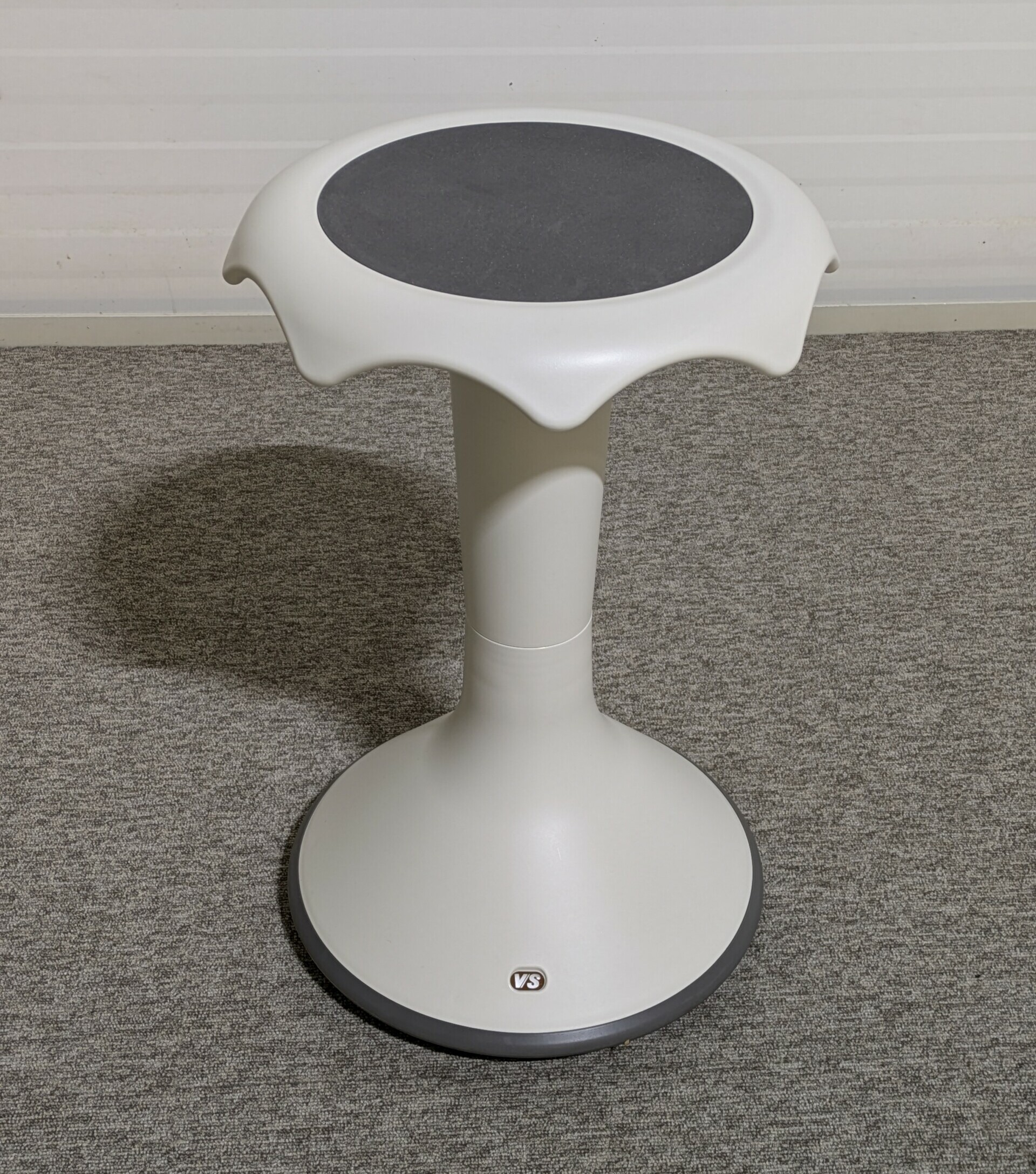 Sæde i plast (grå). Søjlefod i plast (hvid).