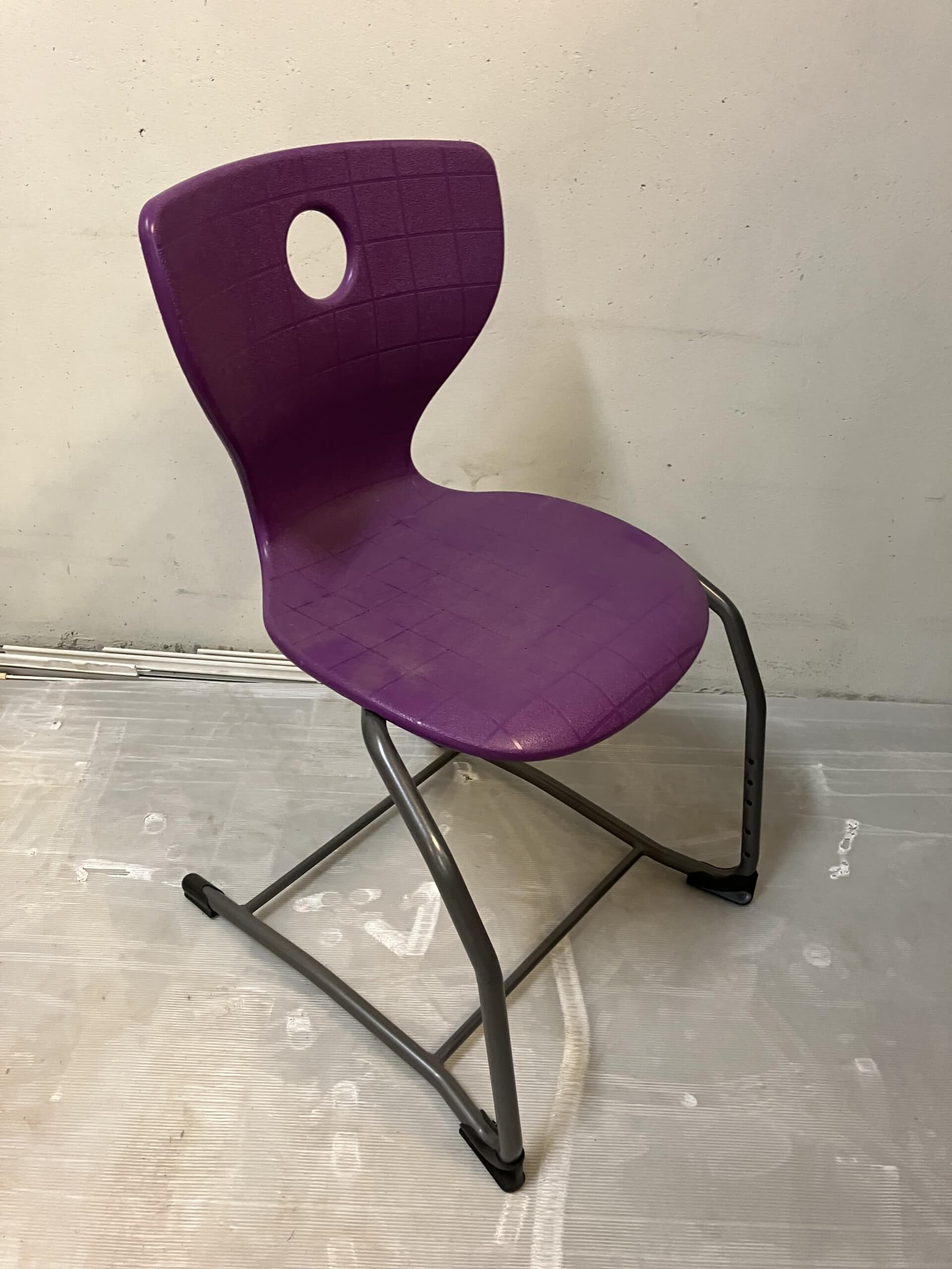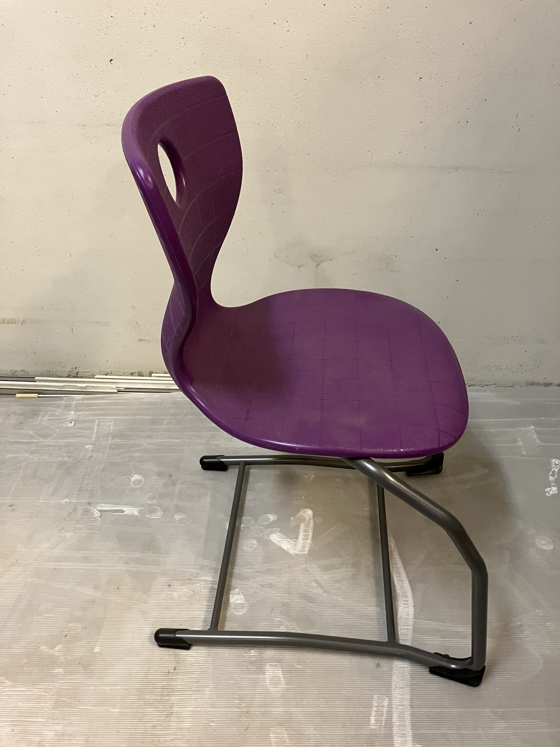 Sæde og ryg i plast (lilla). Medestel i metal (grå).