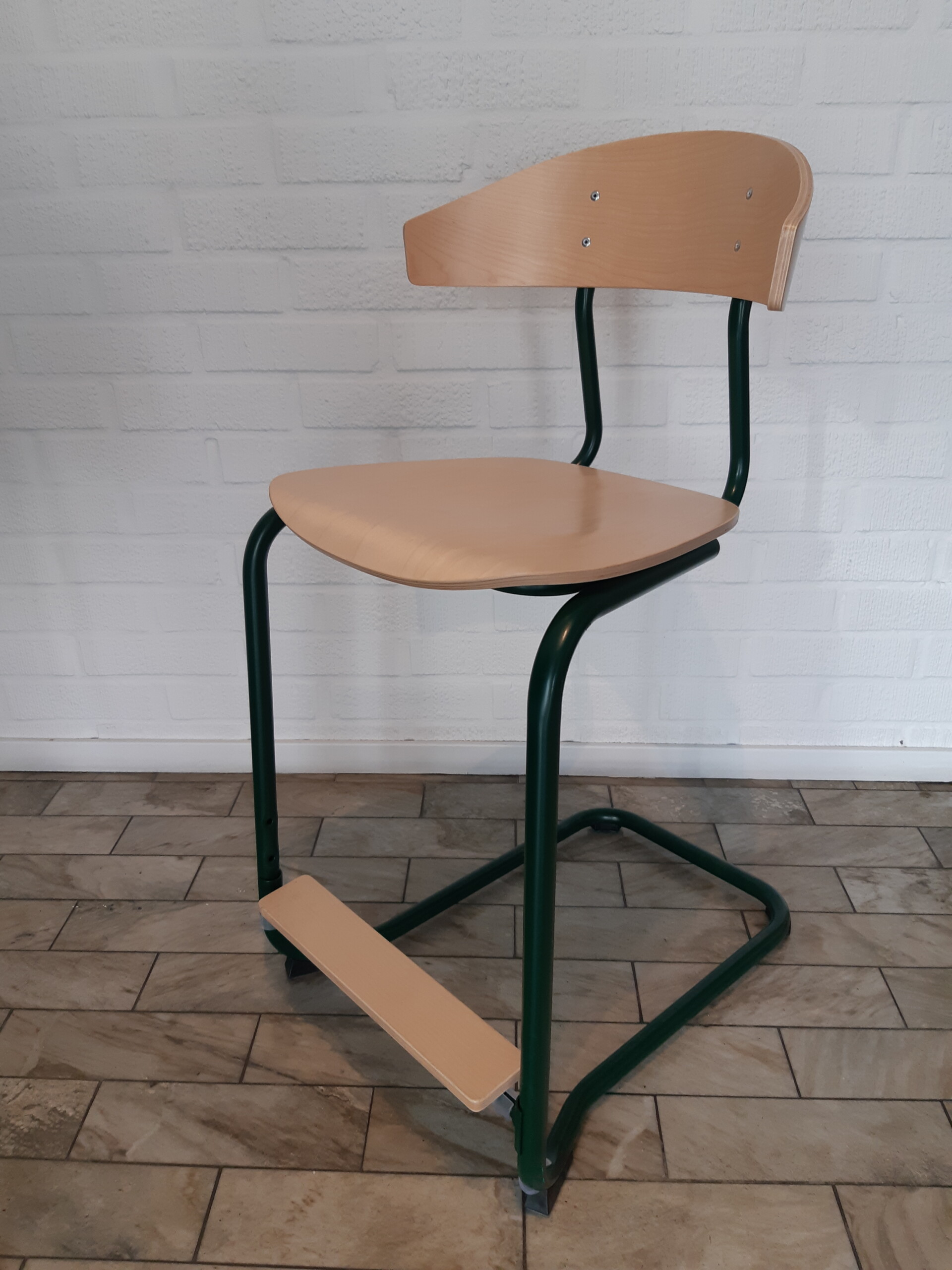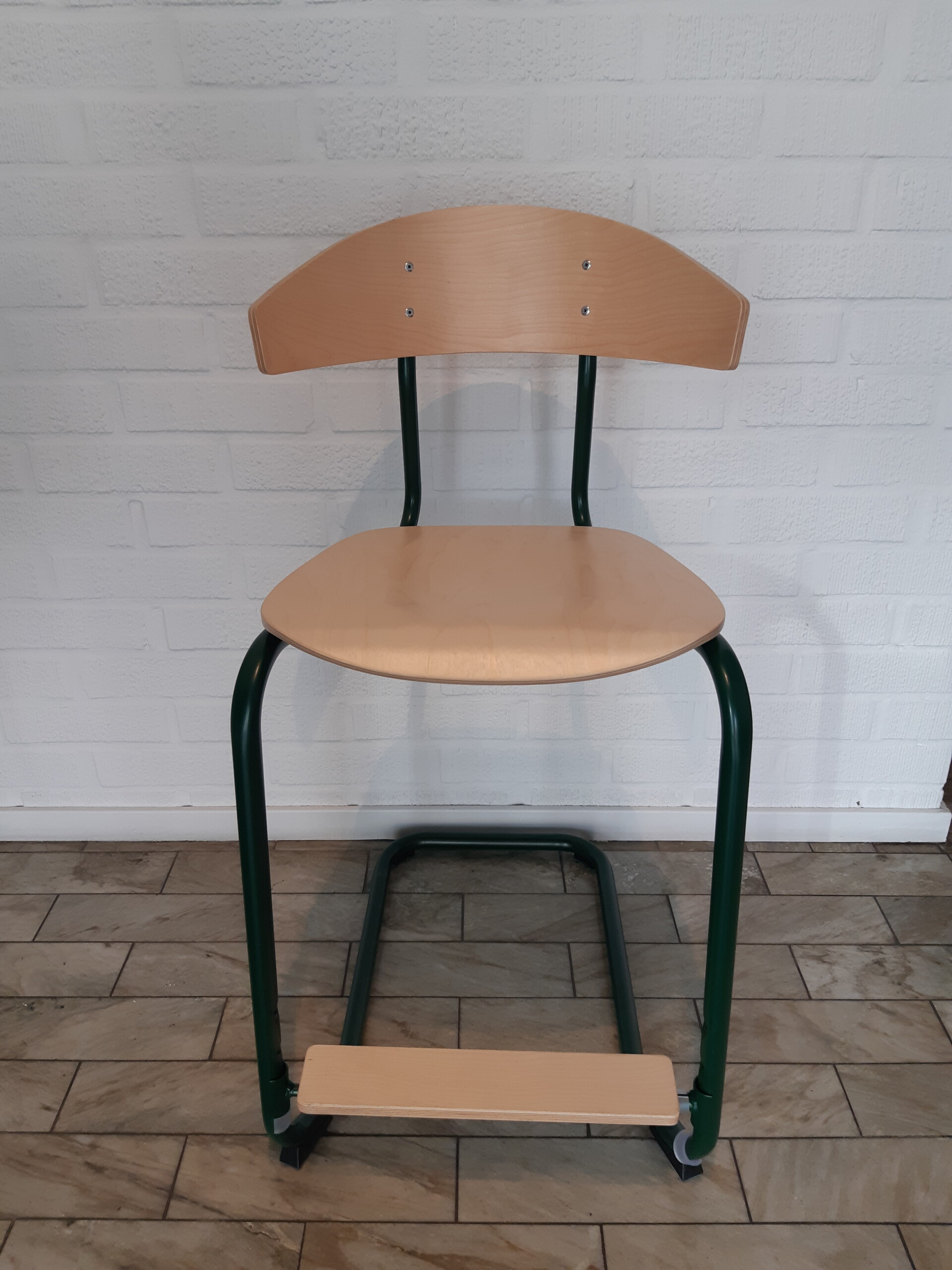 Sæde og ryg i træ (birk). Medestel i metal (grøn).