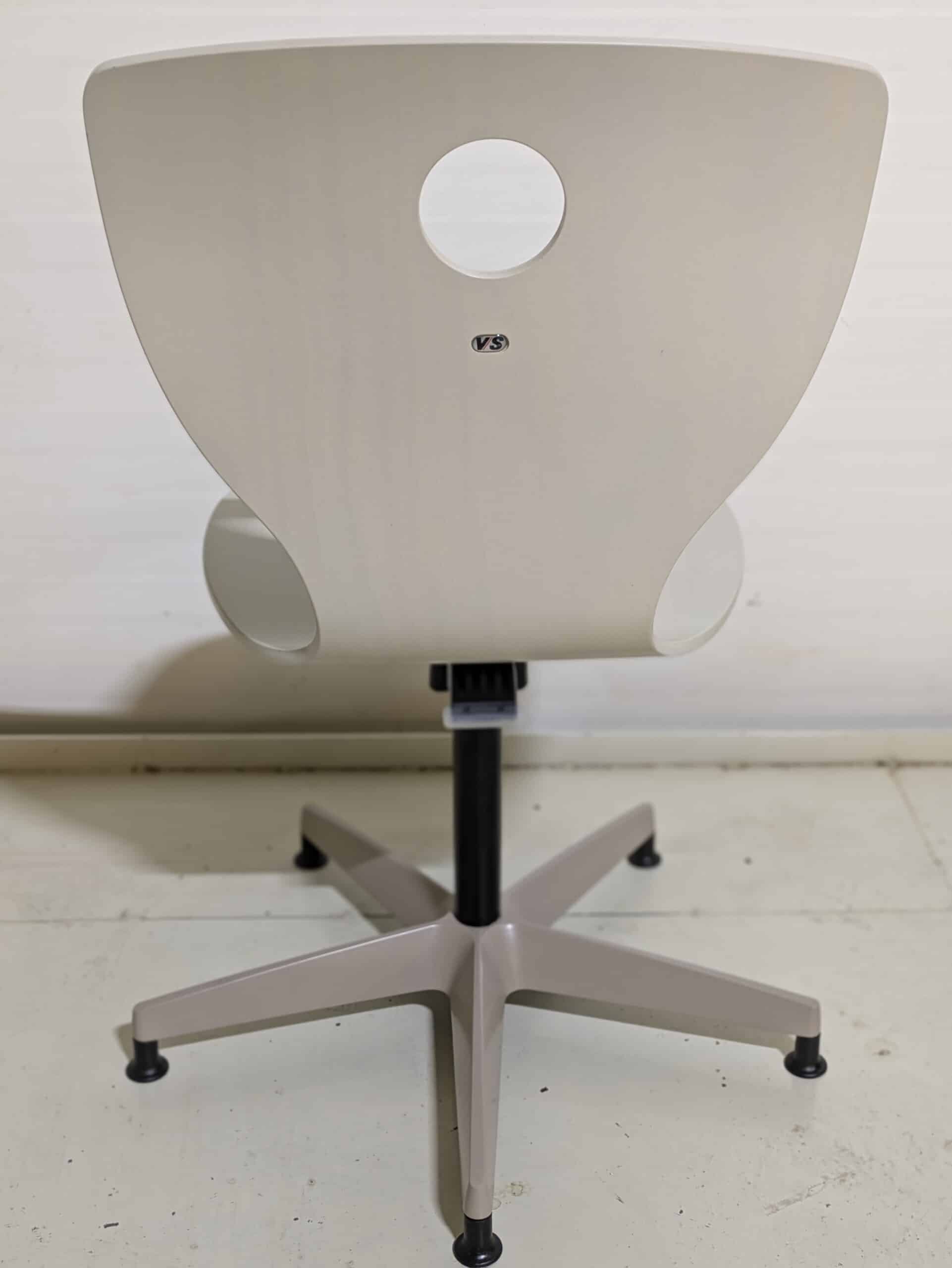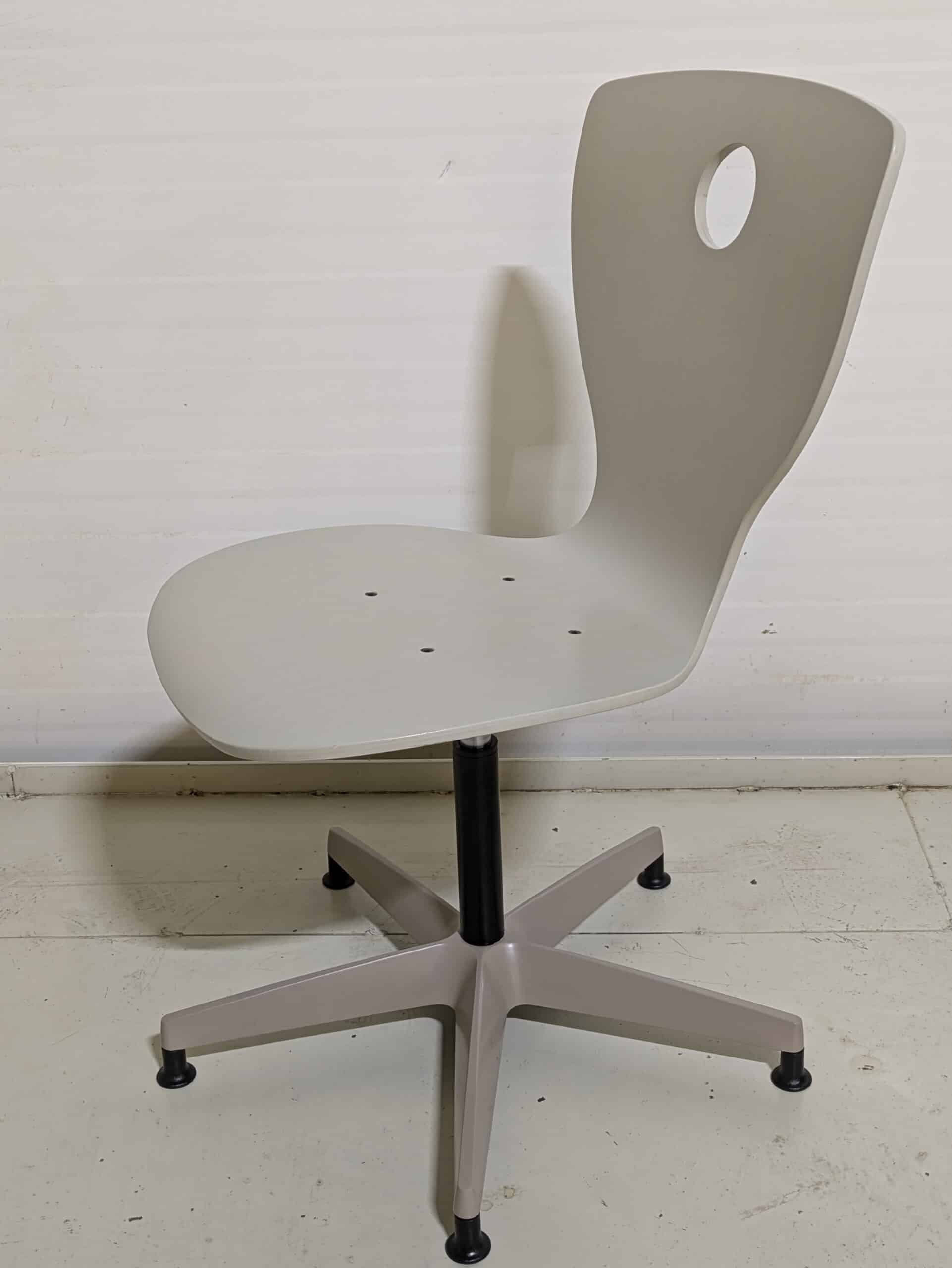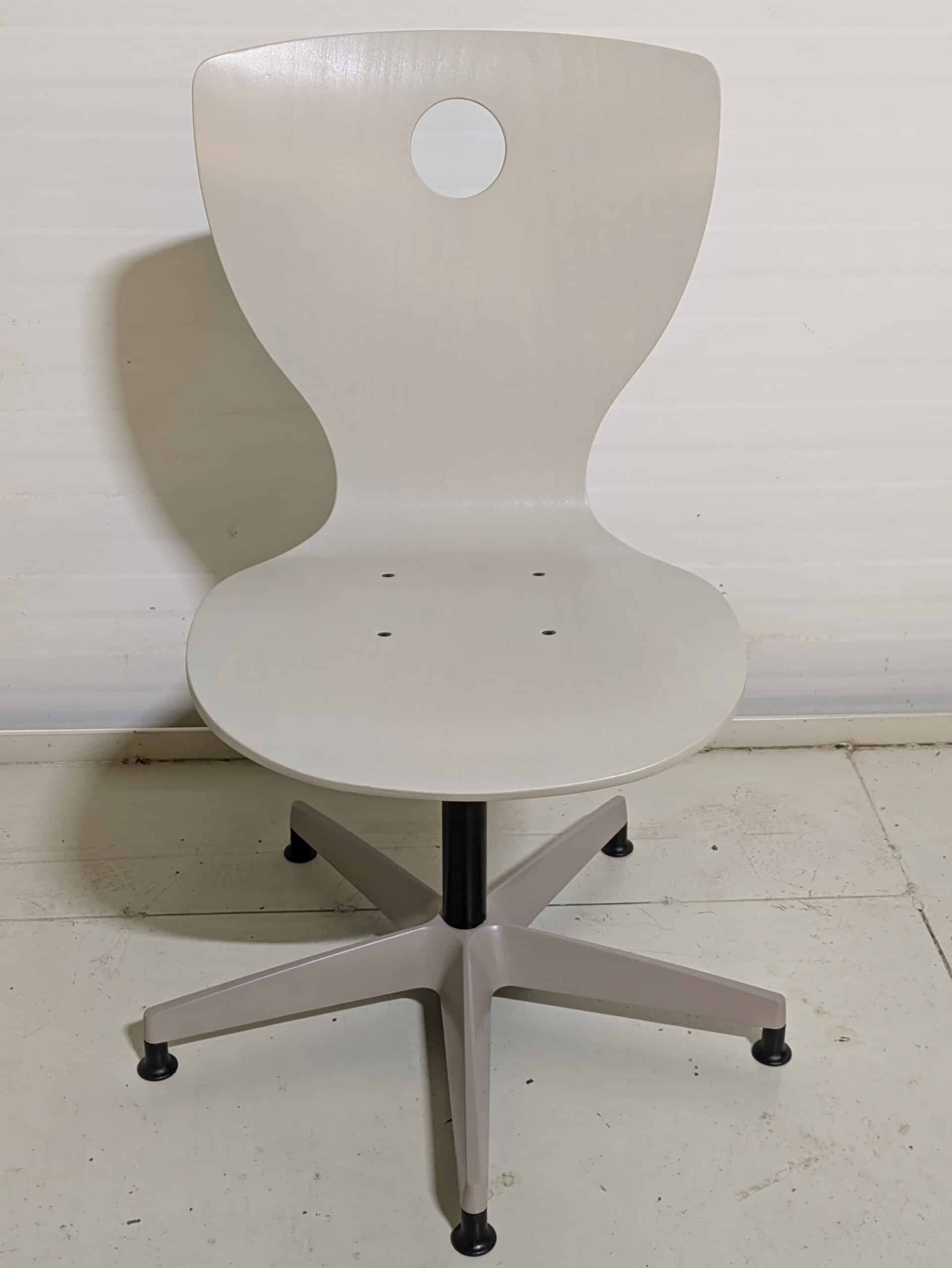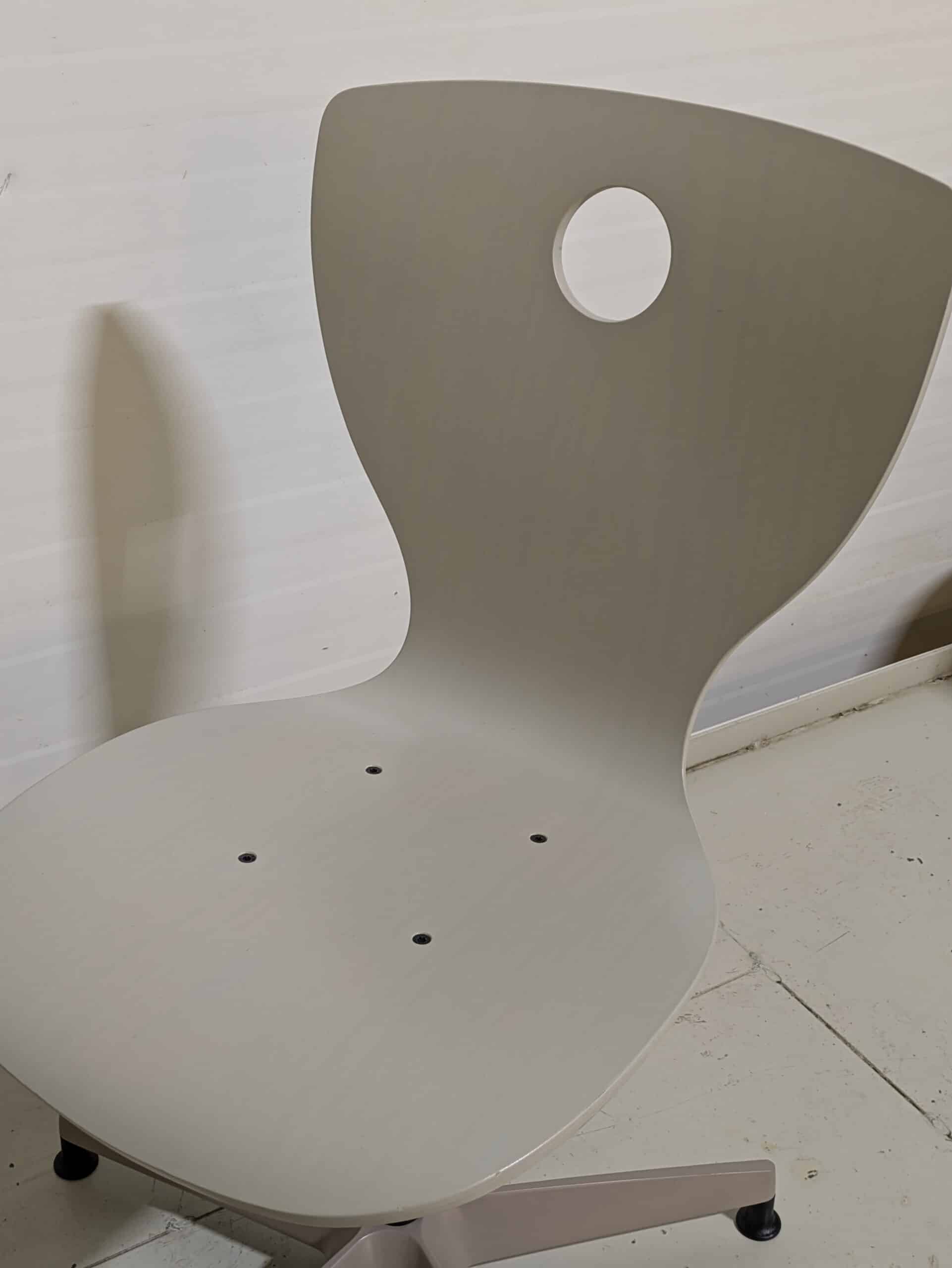 Sæde og ryg i træ (hvid). Fodkryds i metal (grå).
