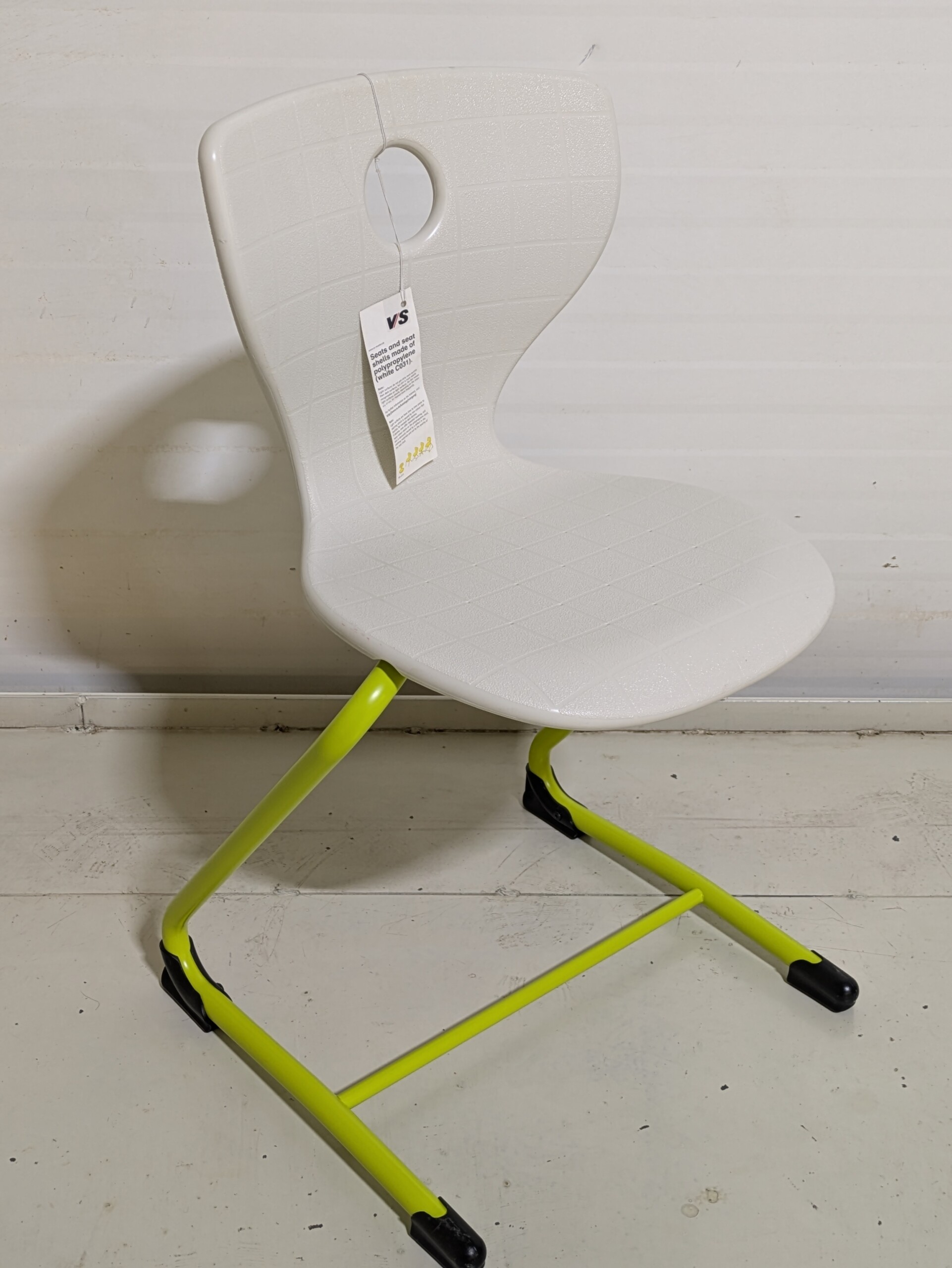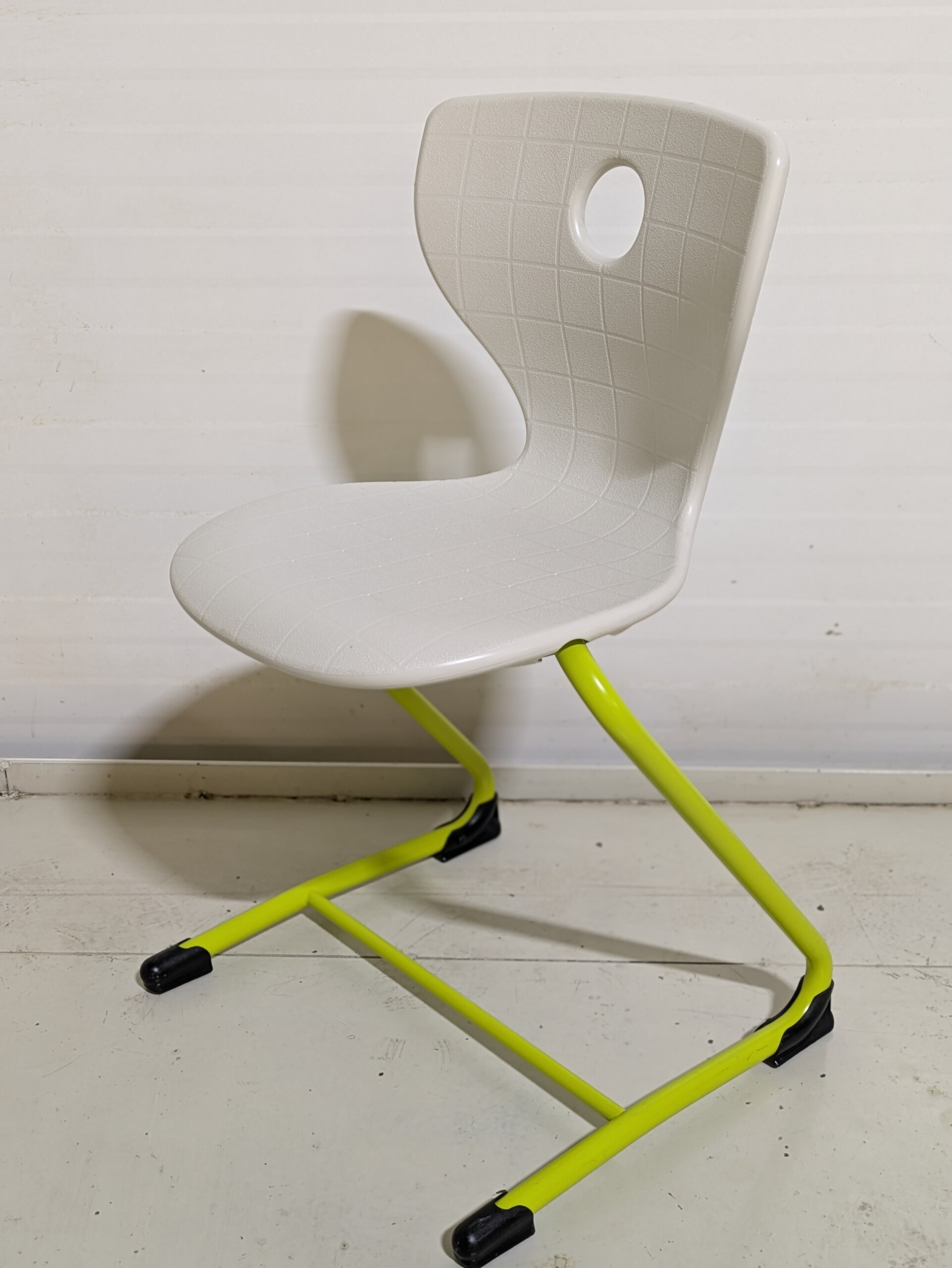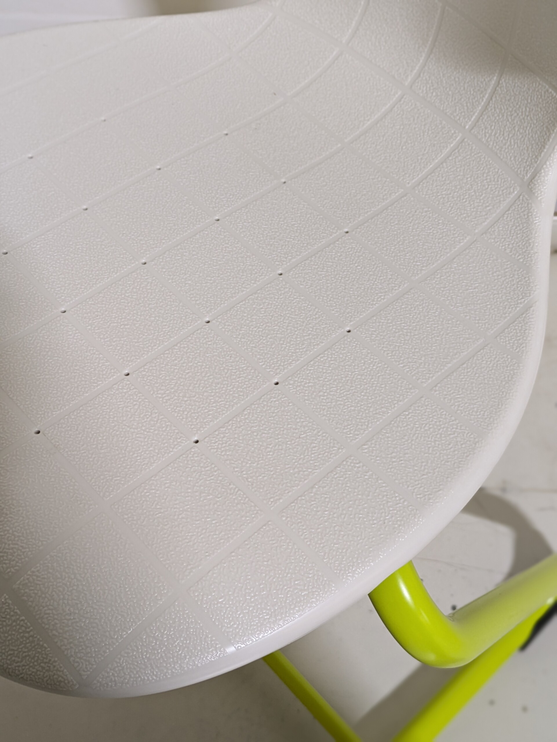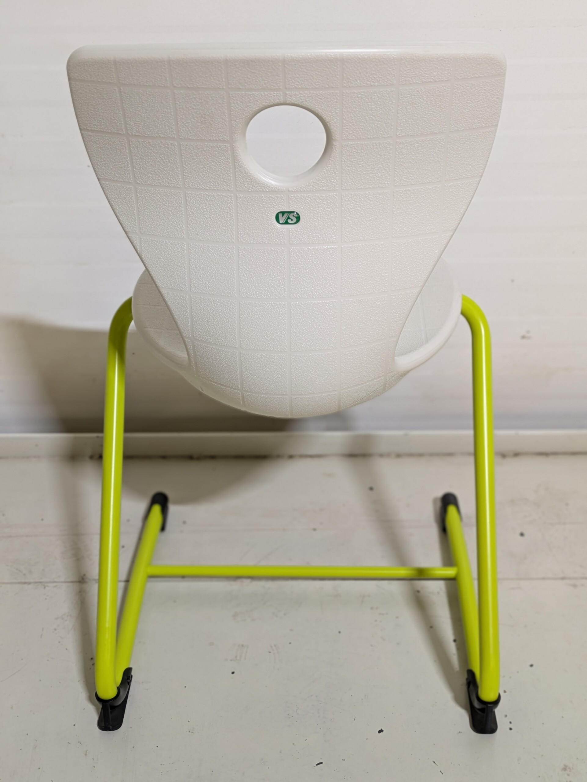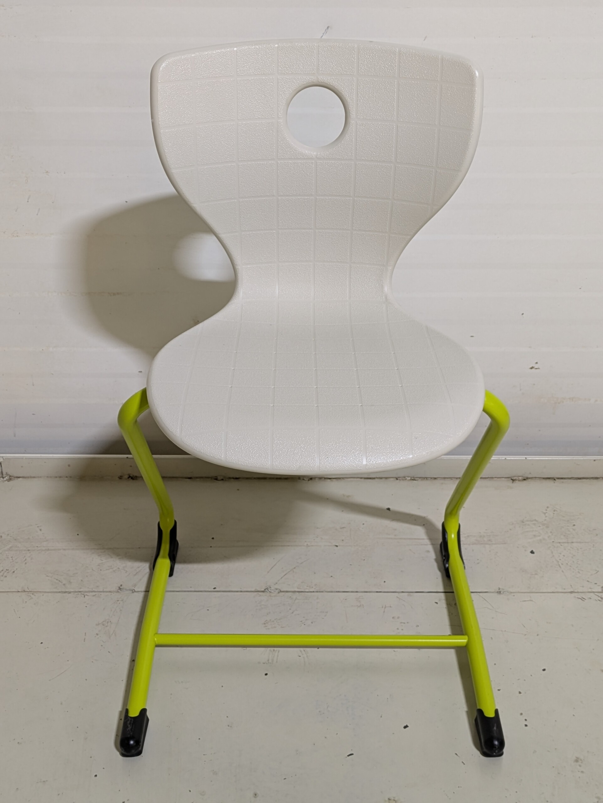Sæde og ryg i plast (hvid). 4-bensstel i metal (grøn).