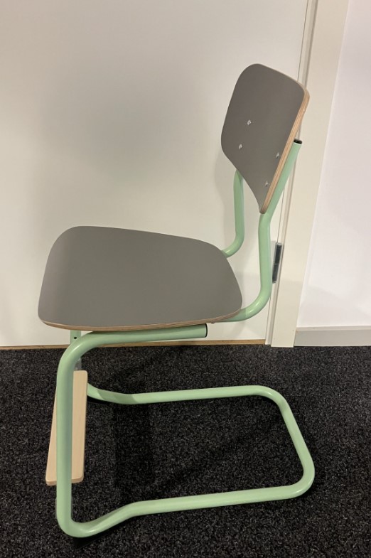 Sæde og ryg i laminat (grå). Medestel i metal (grøn).
