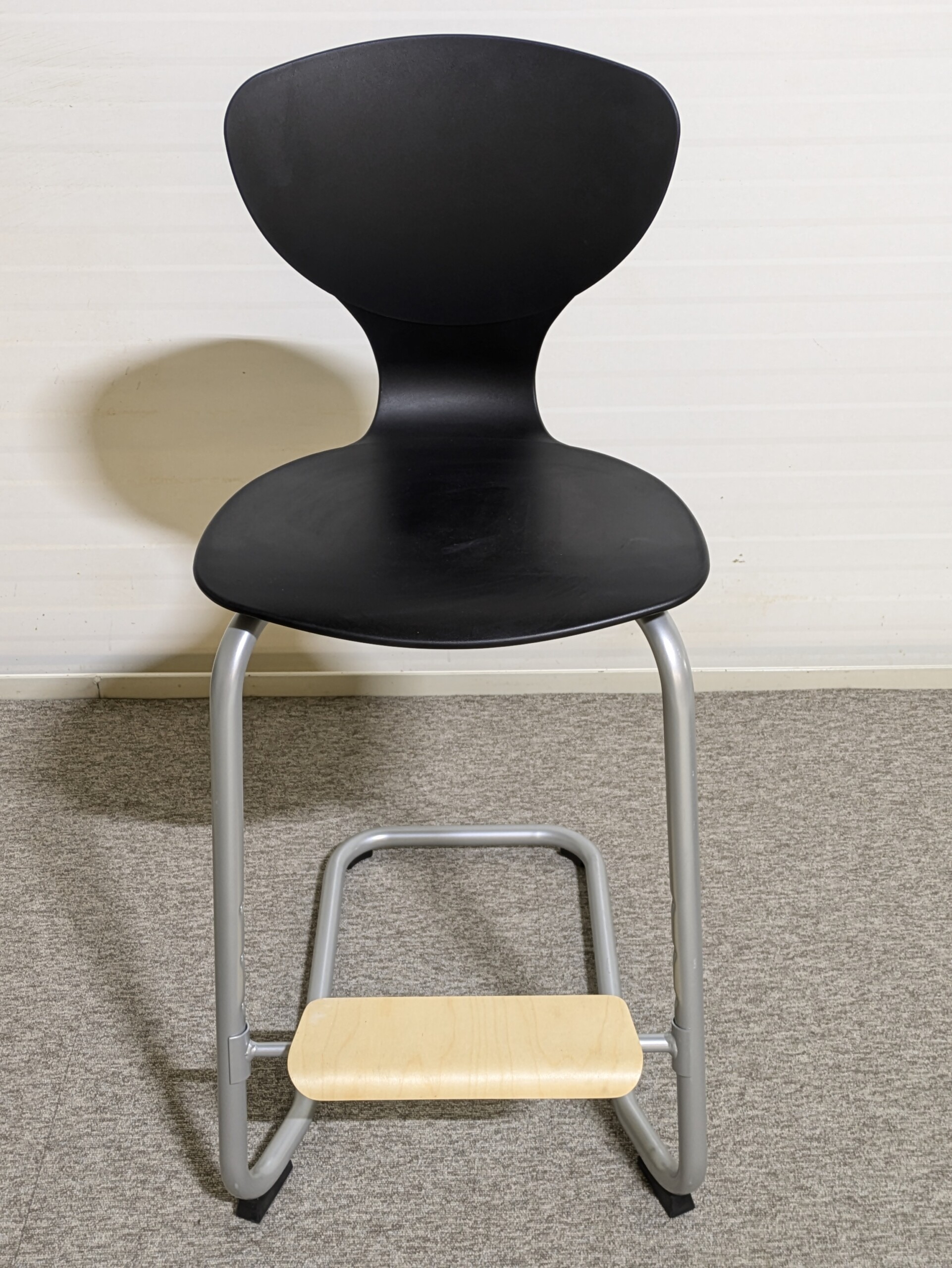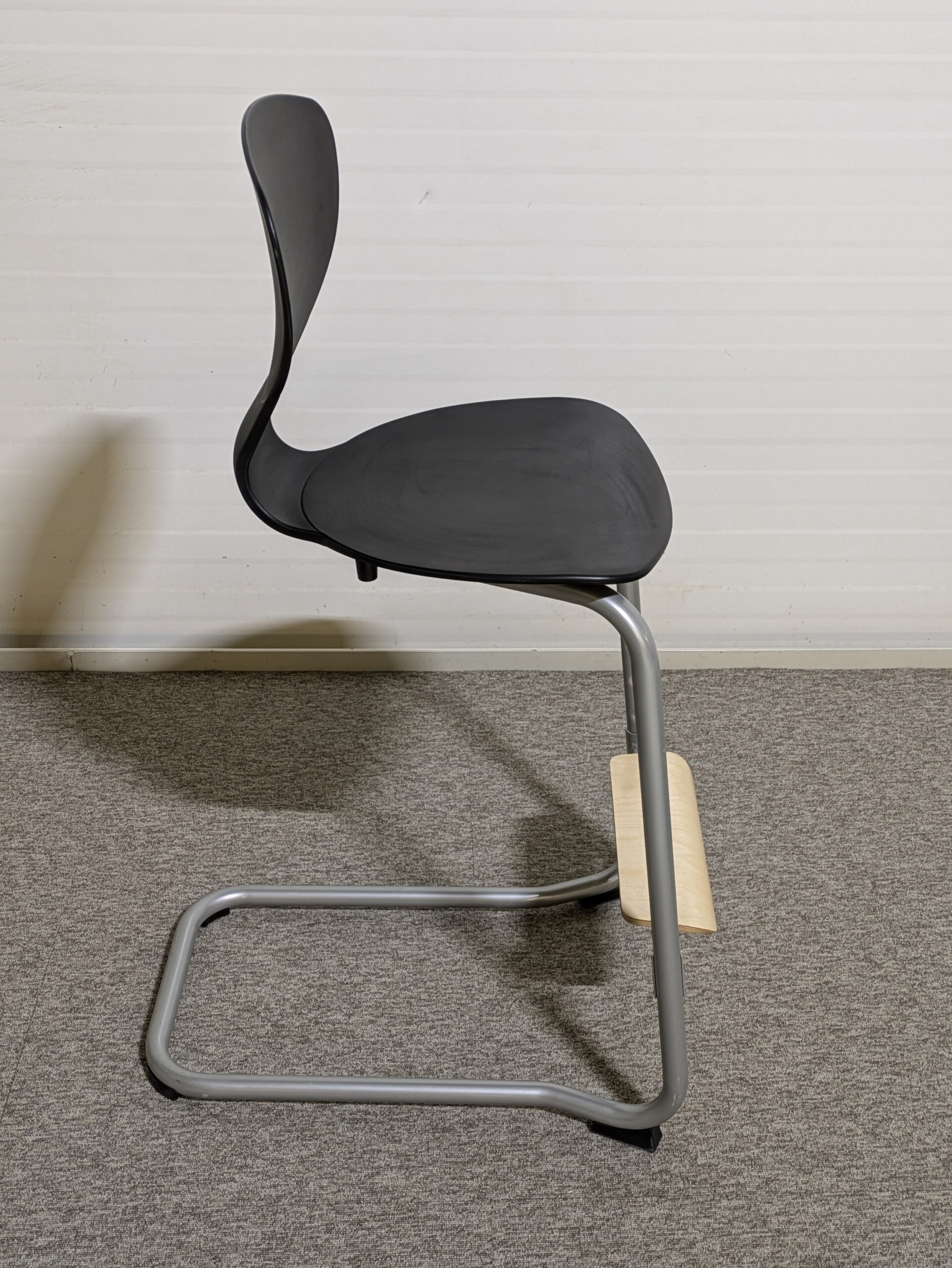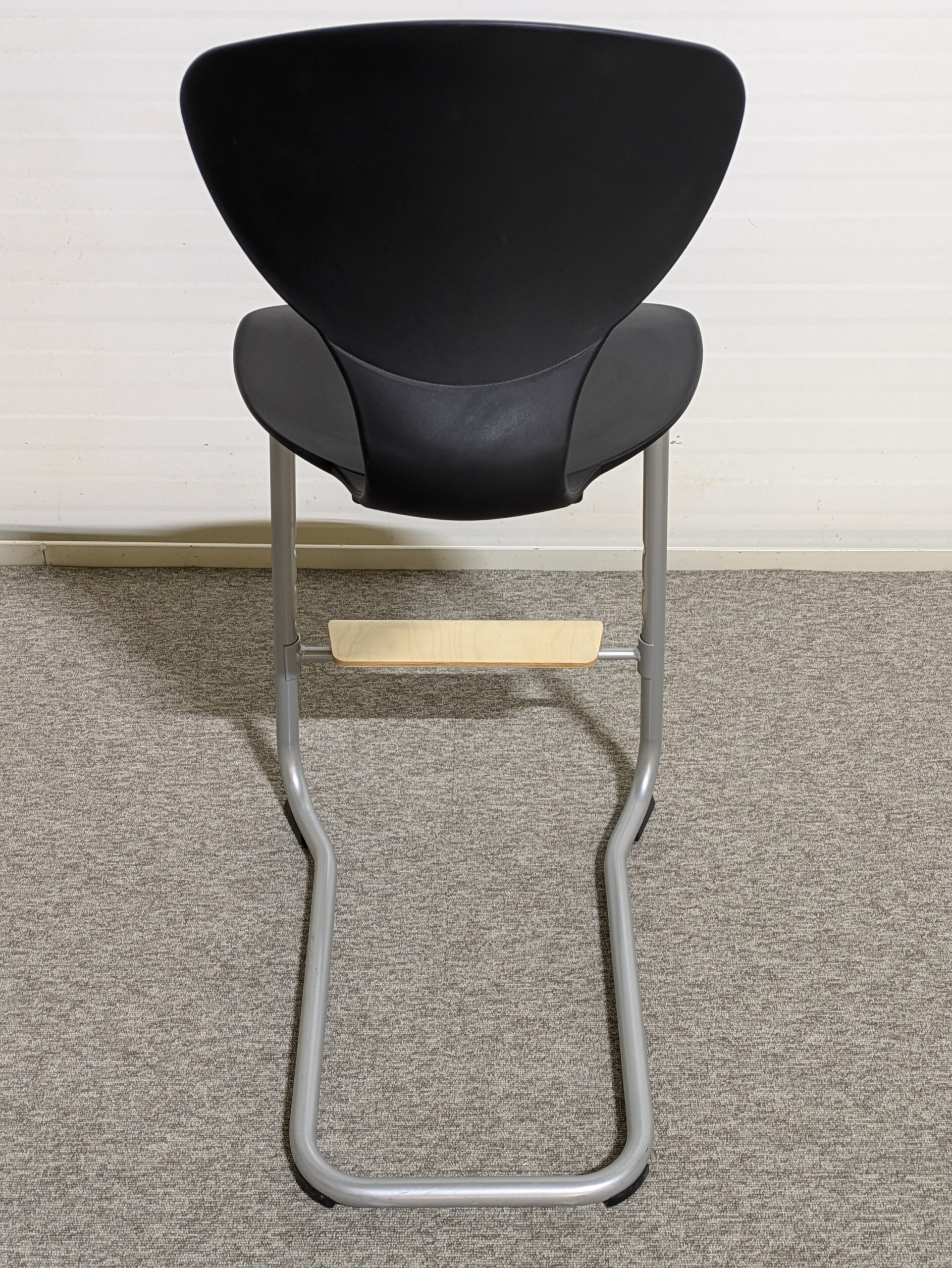 Sæde og ryg i plast (sort). Medestel i metal (grå).