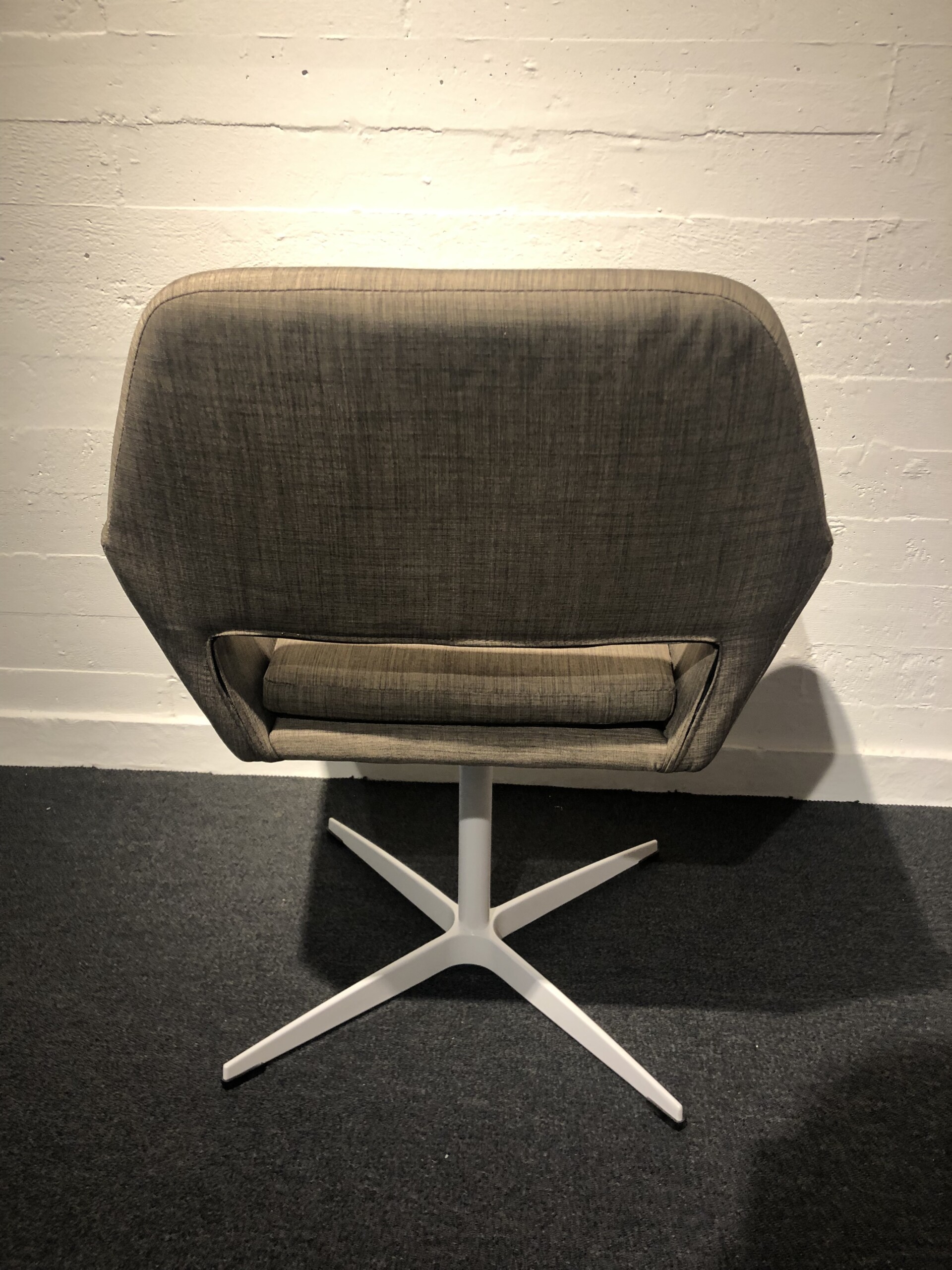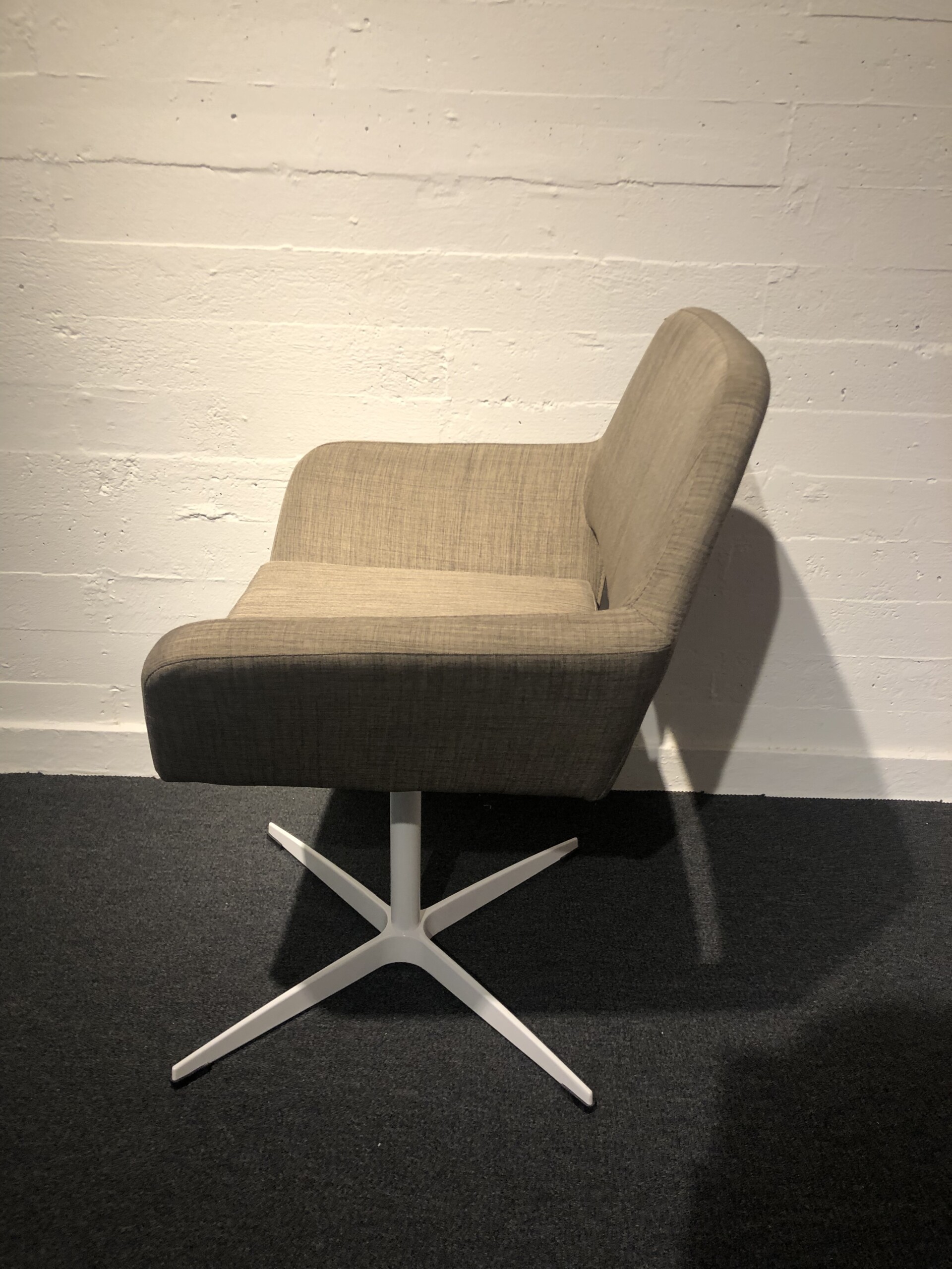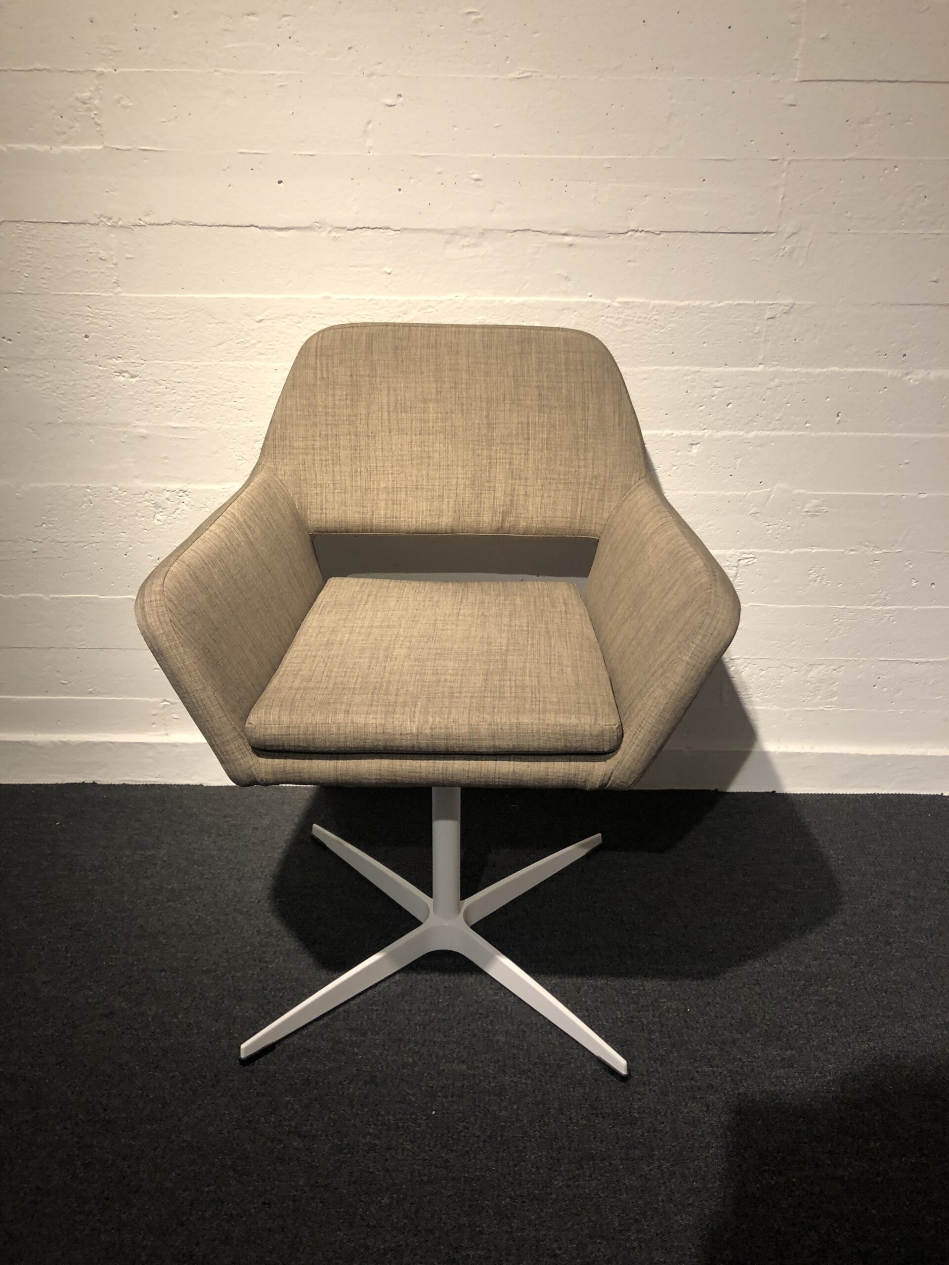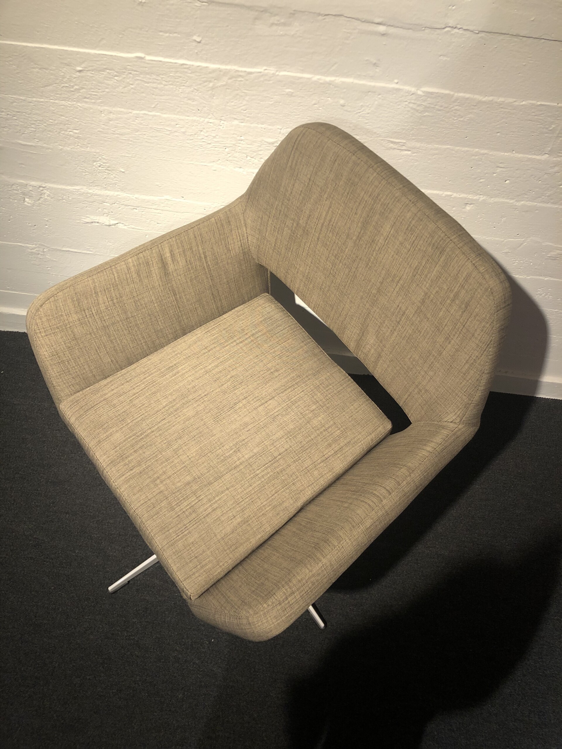 Sæde og ryg i stof (beige). Fodkryds i metal (hvid).