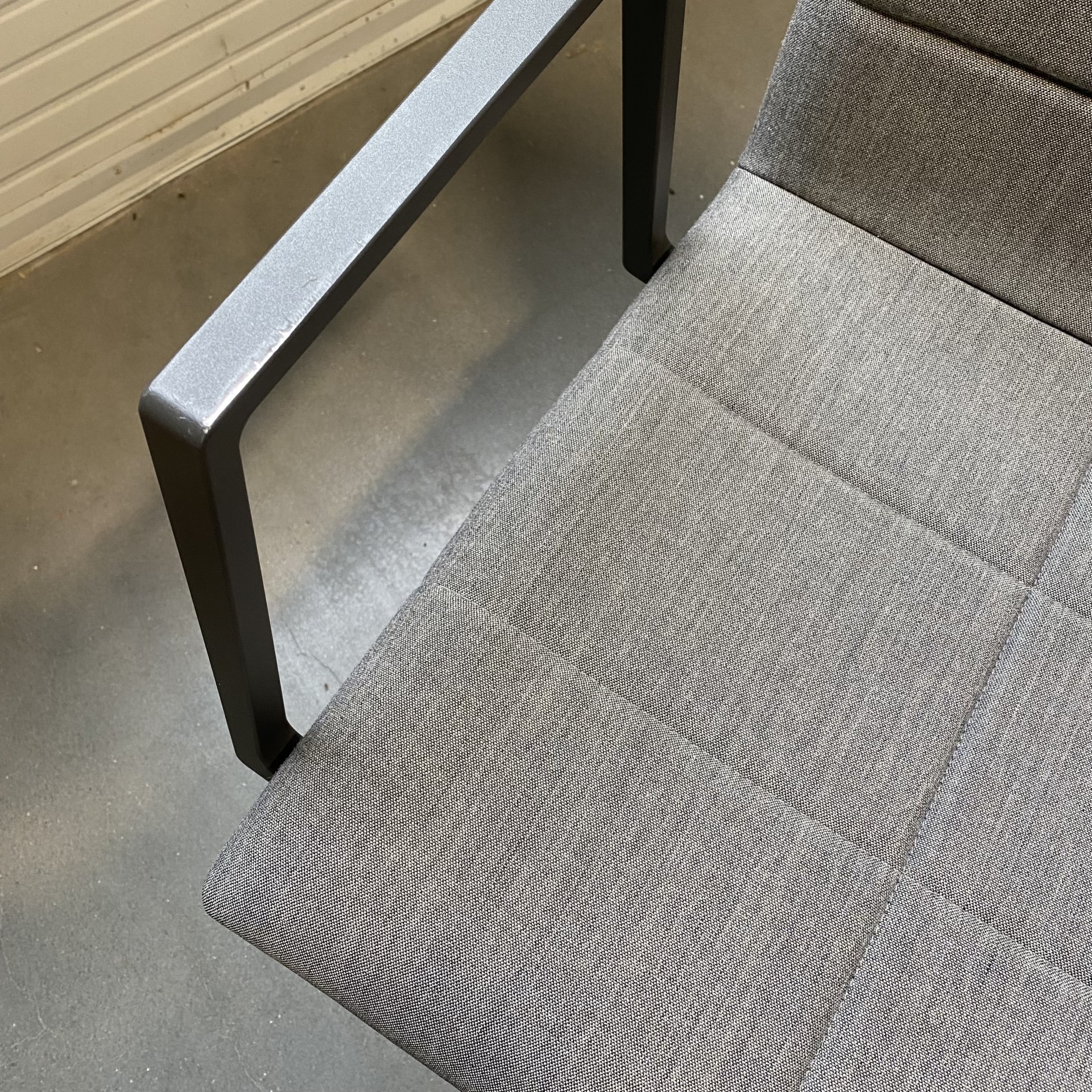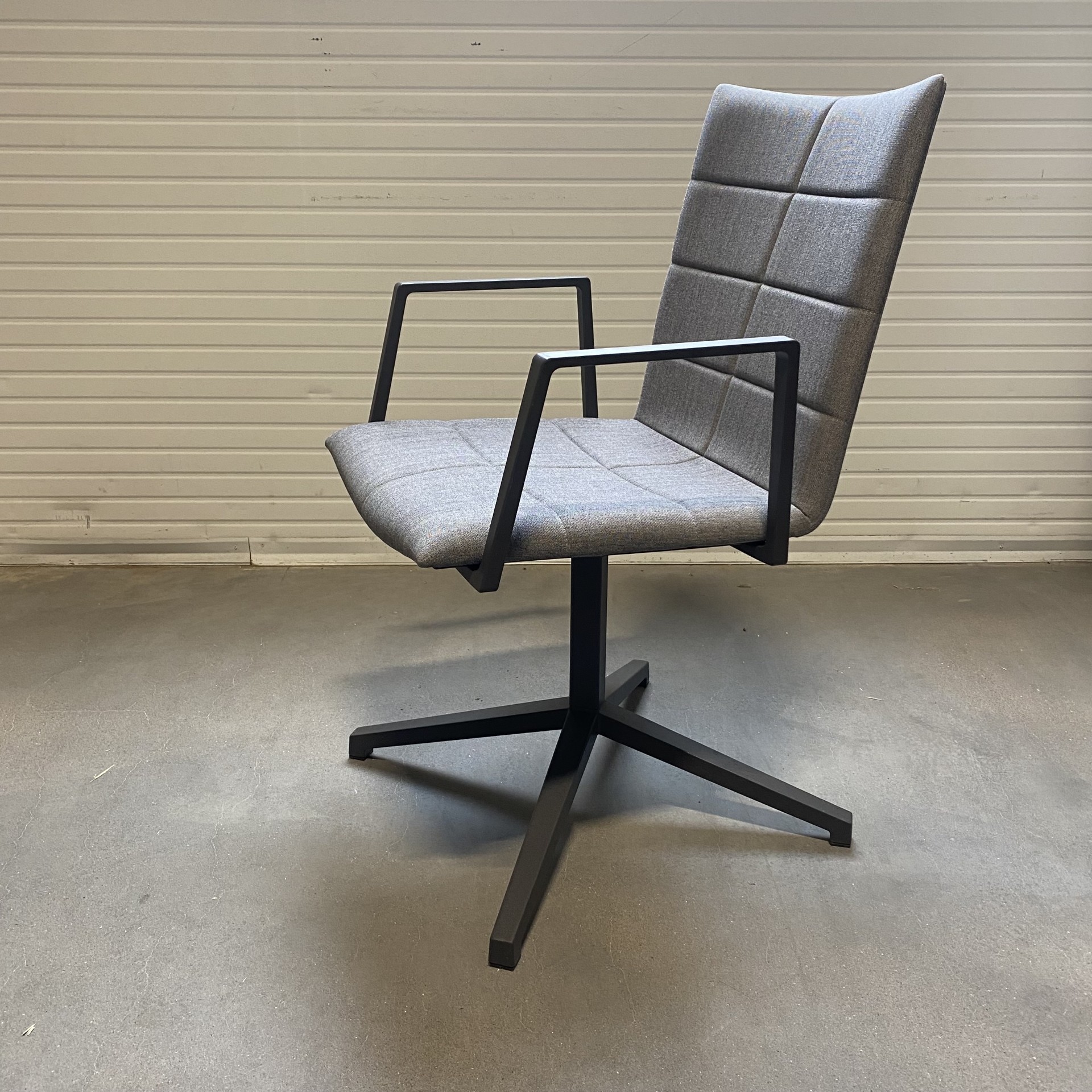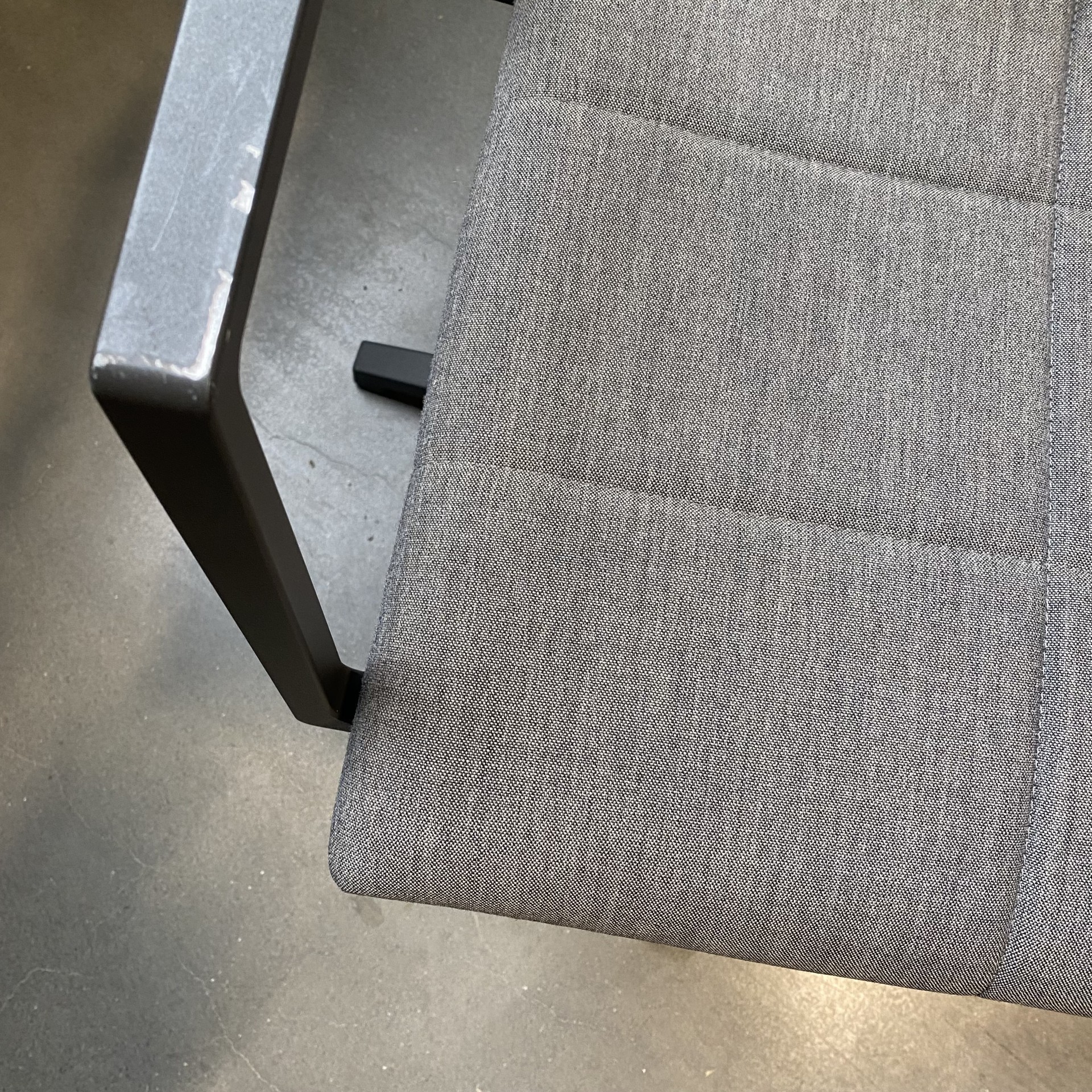 Sæde og ryg i stof (grå). Fodkryds i metal (sort).