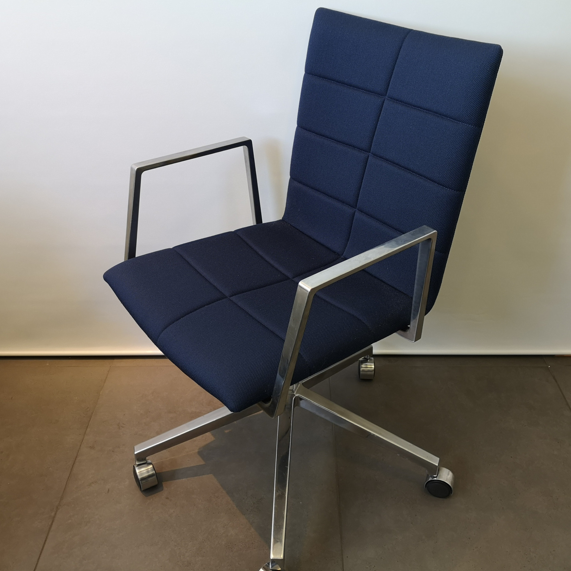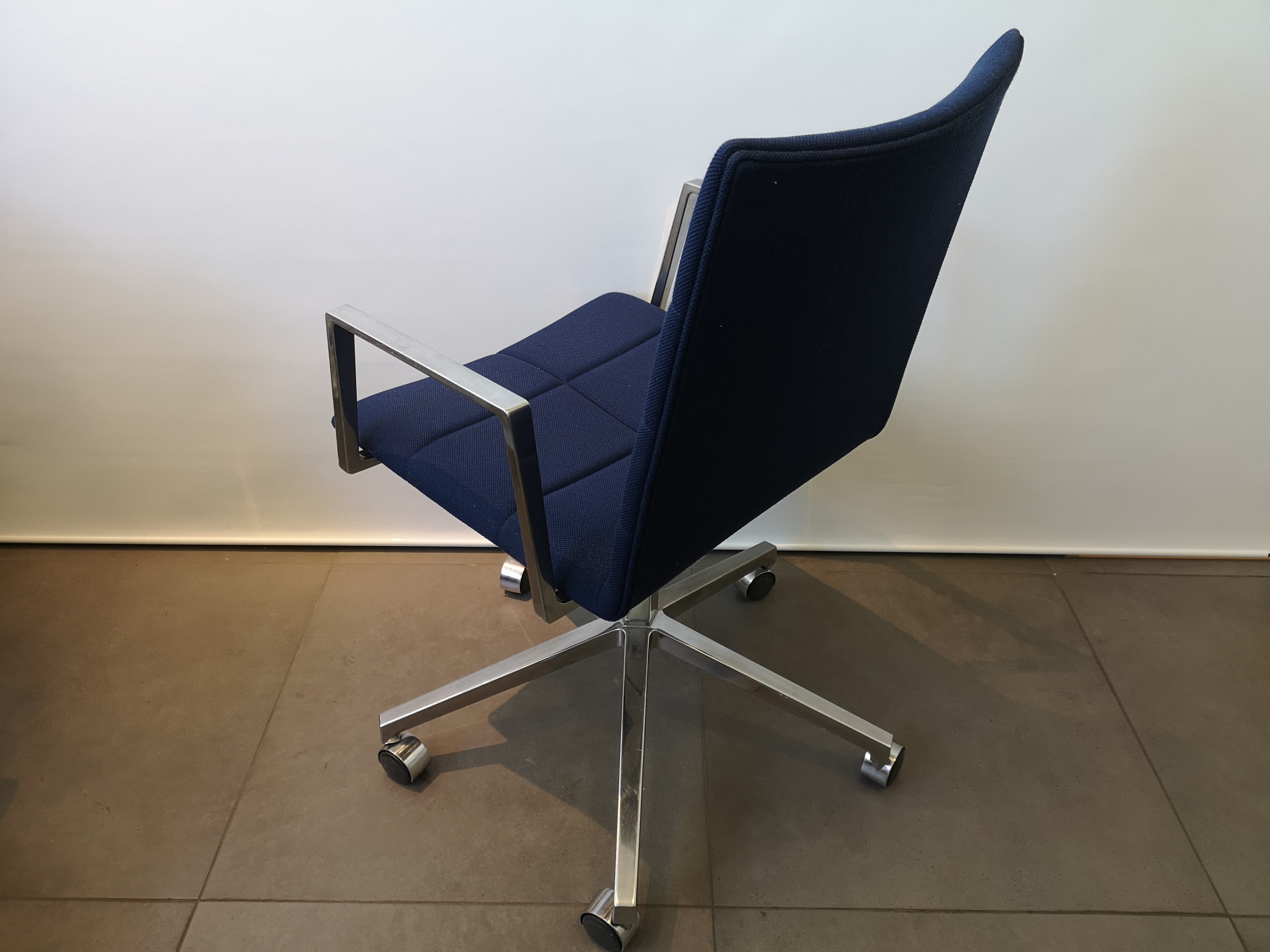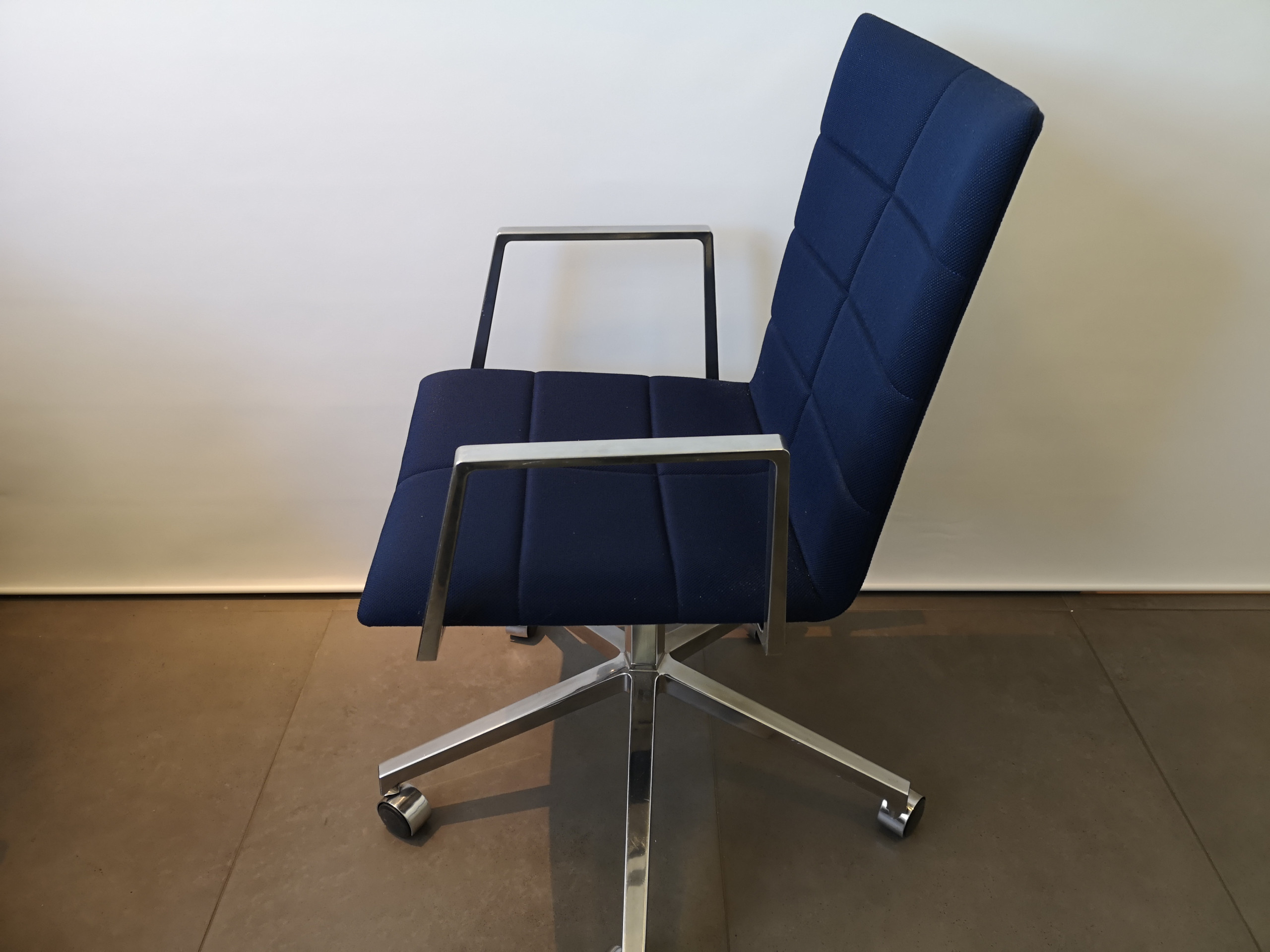 Sæde og ryg i stof (blå). Fodkryds i metal (krom). Højdejusterbar.