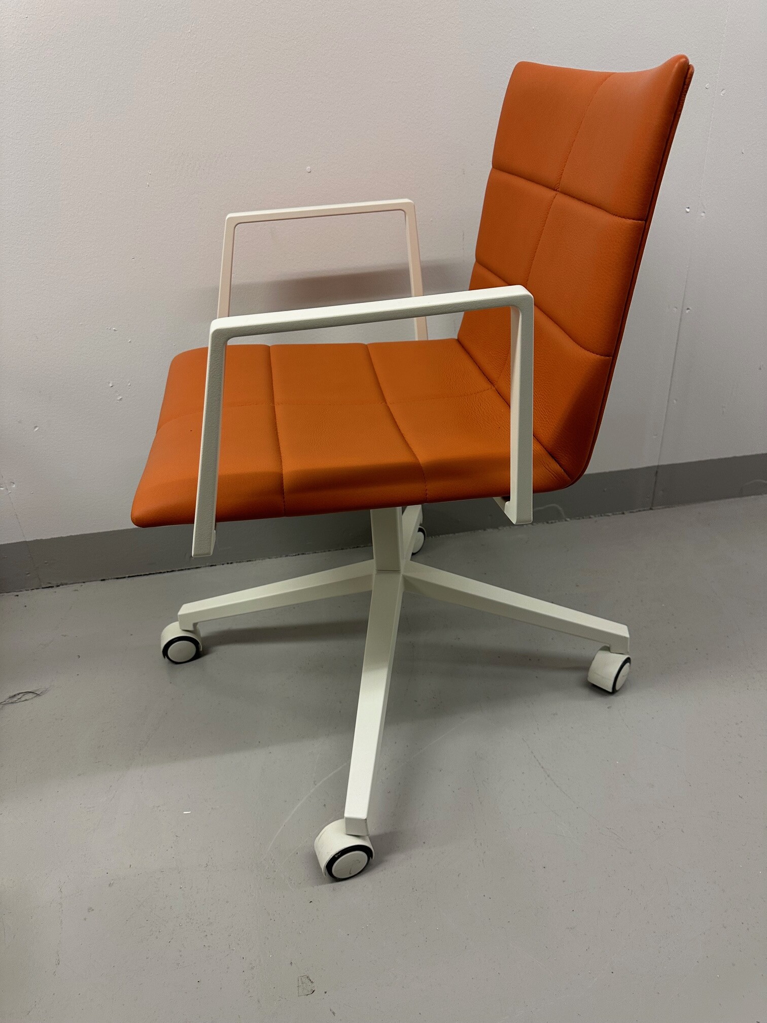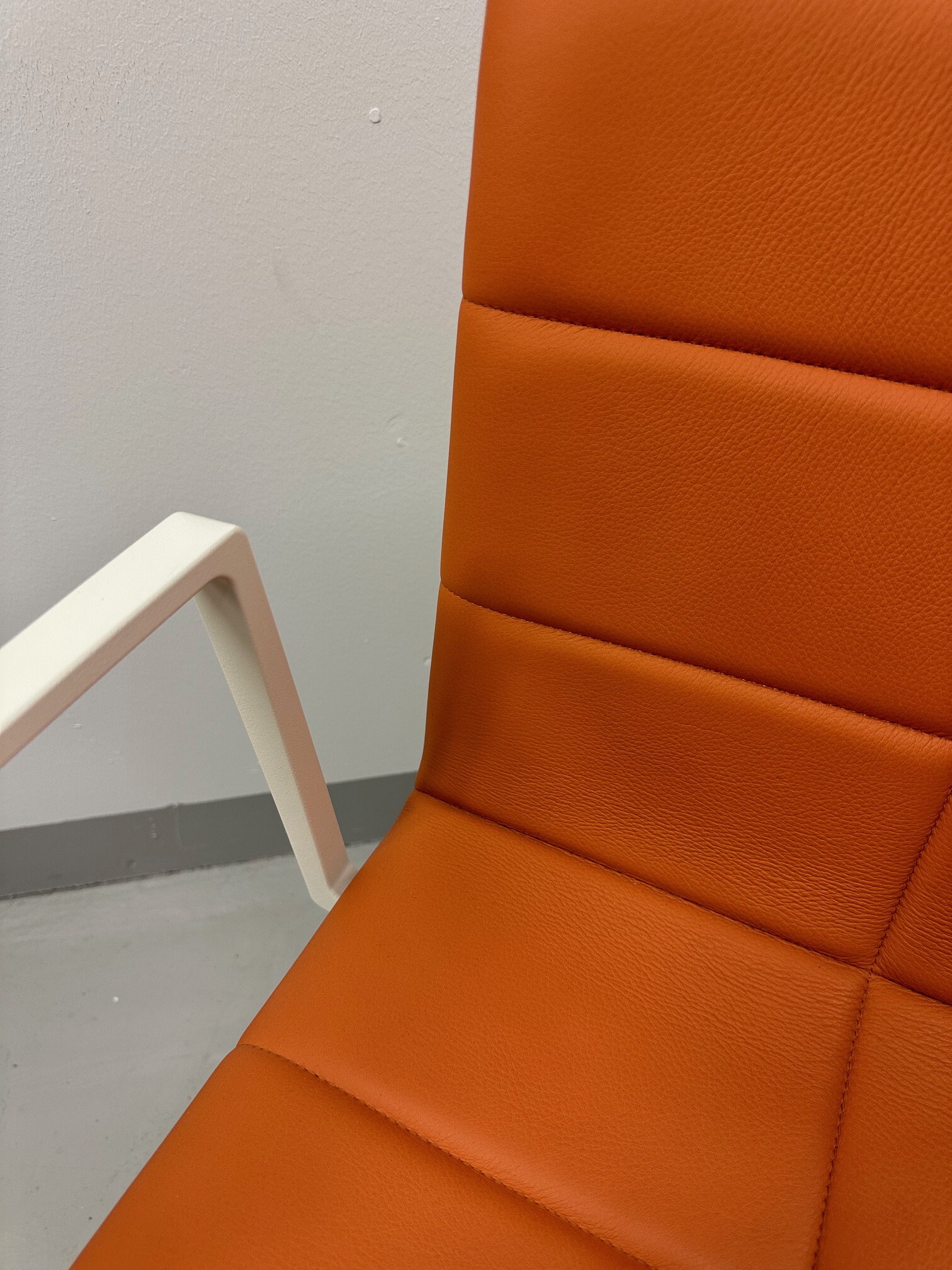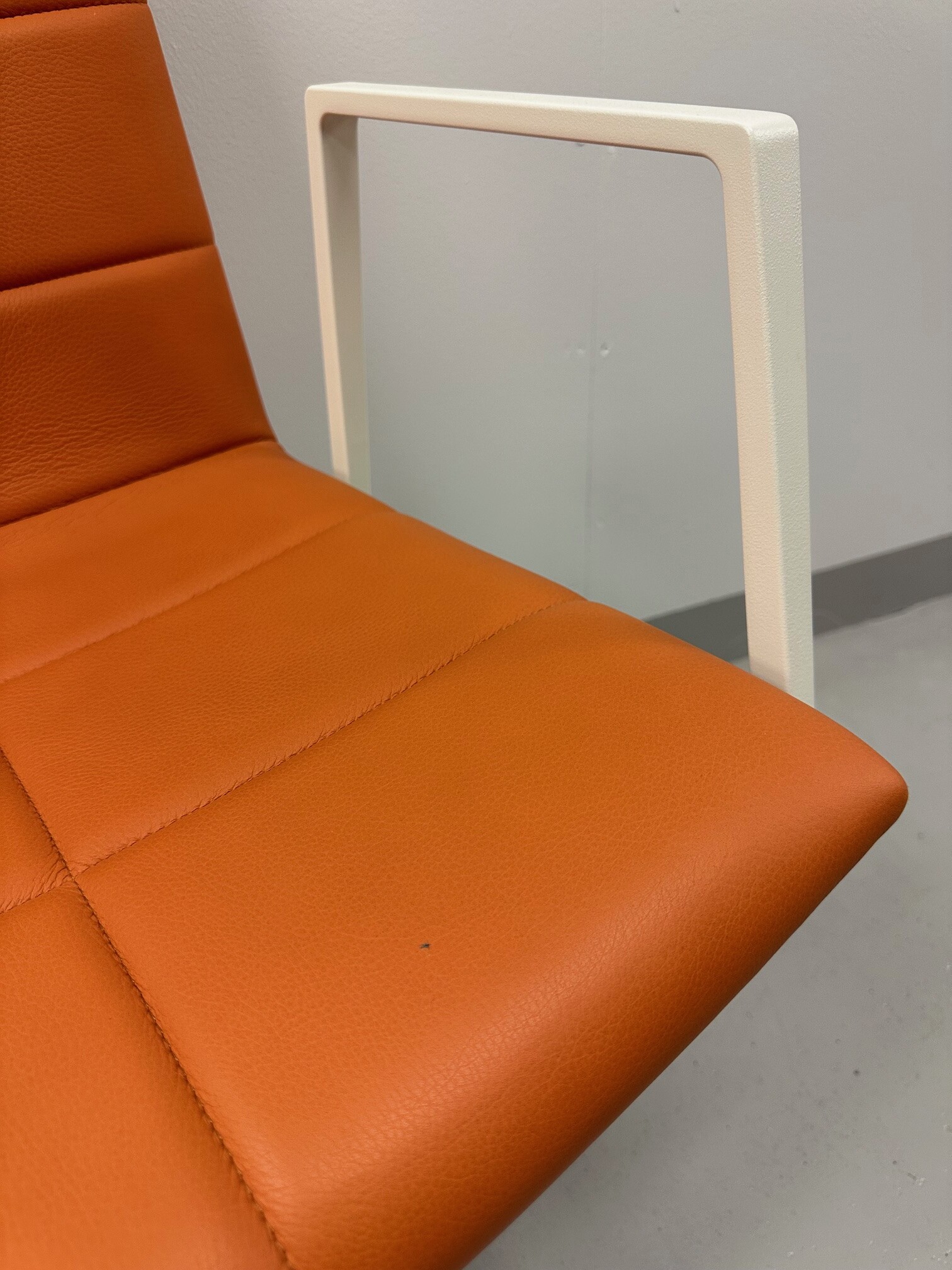 Sæde og ryg i læder (orange). Fodkryds i metal (hvid).