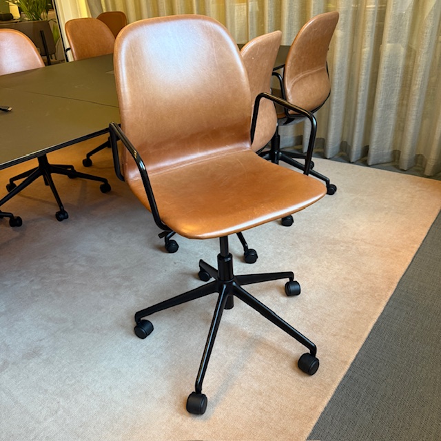 Sæde og ryg i læder (brun). Fodkryds i metal (sort). Højdejusterbar.