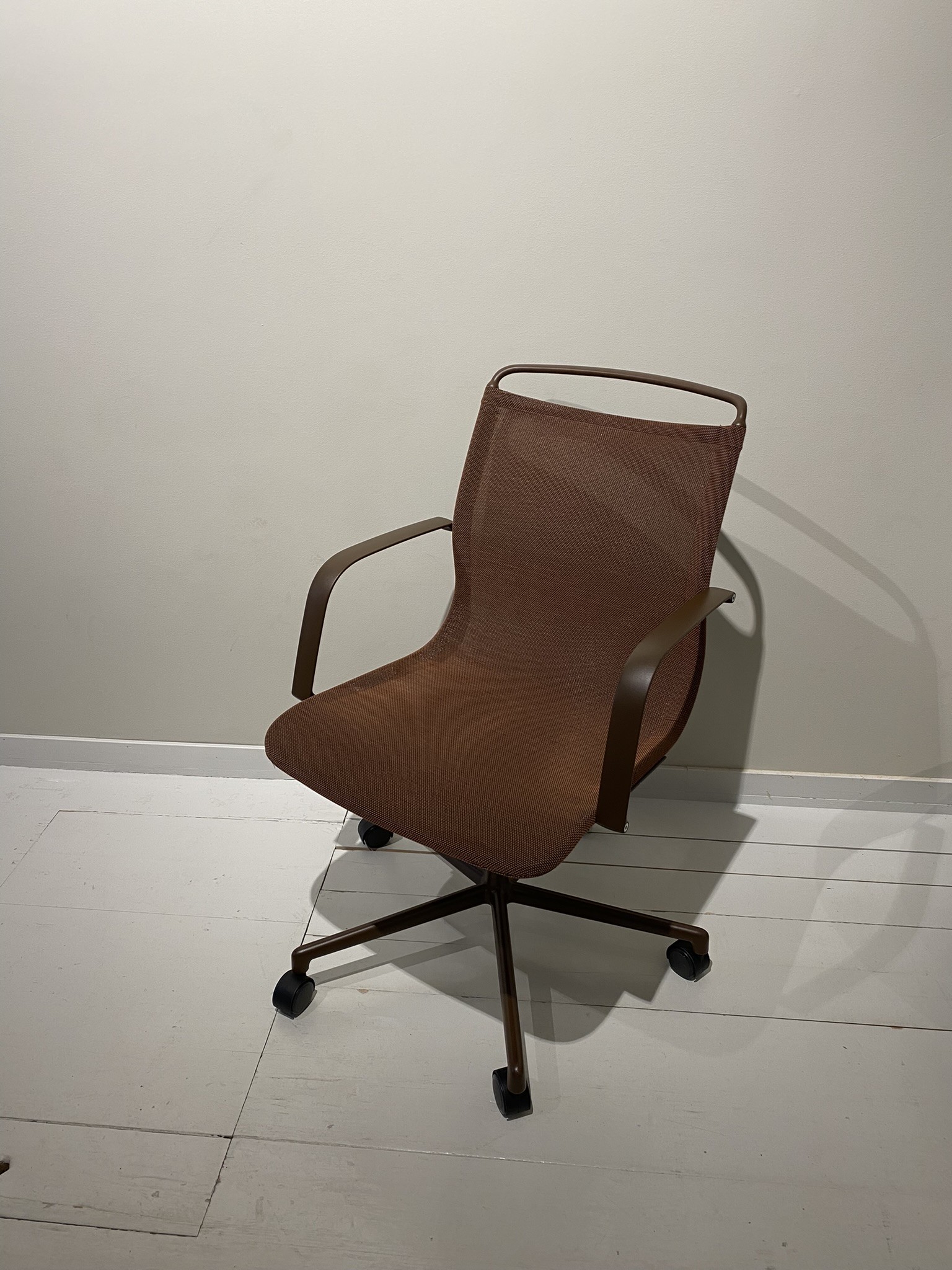 Sæde og ryg i mesh (brun). Fodkryds i metal (brun).