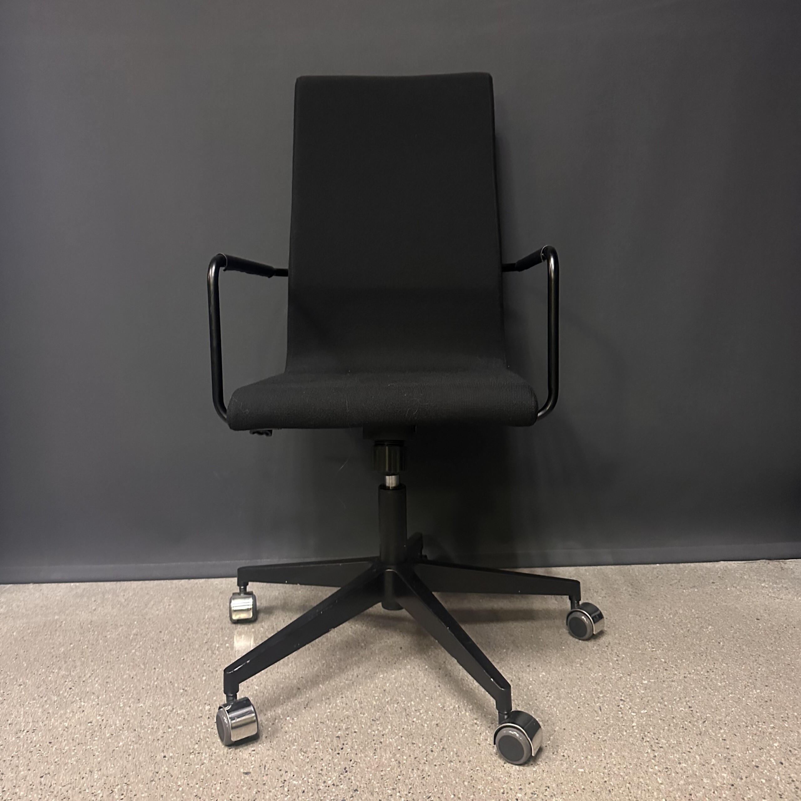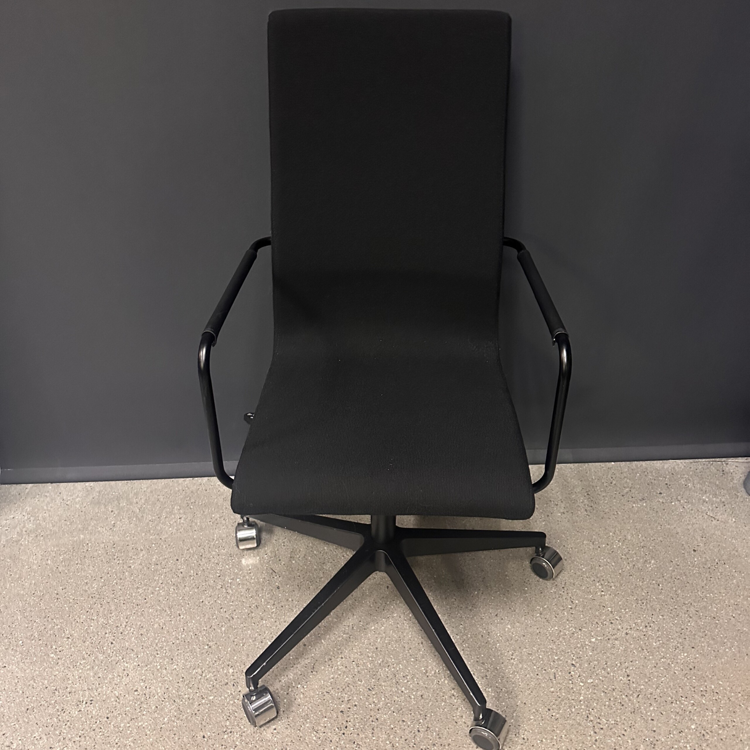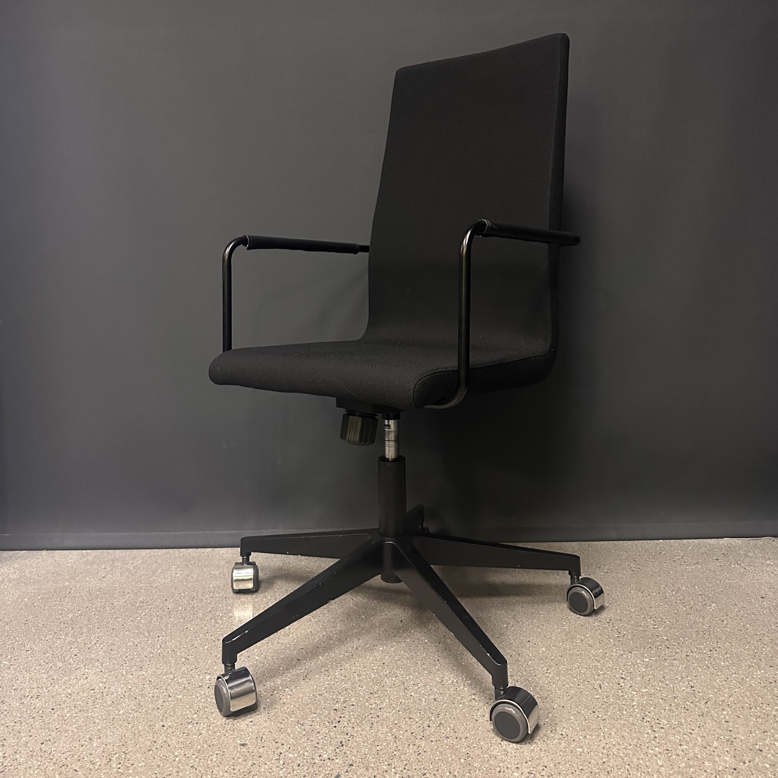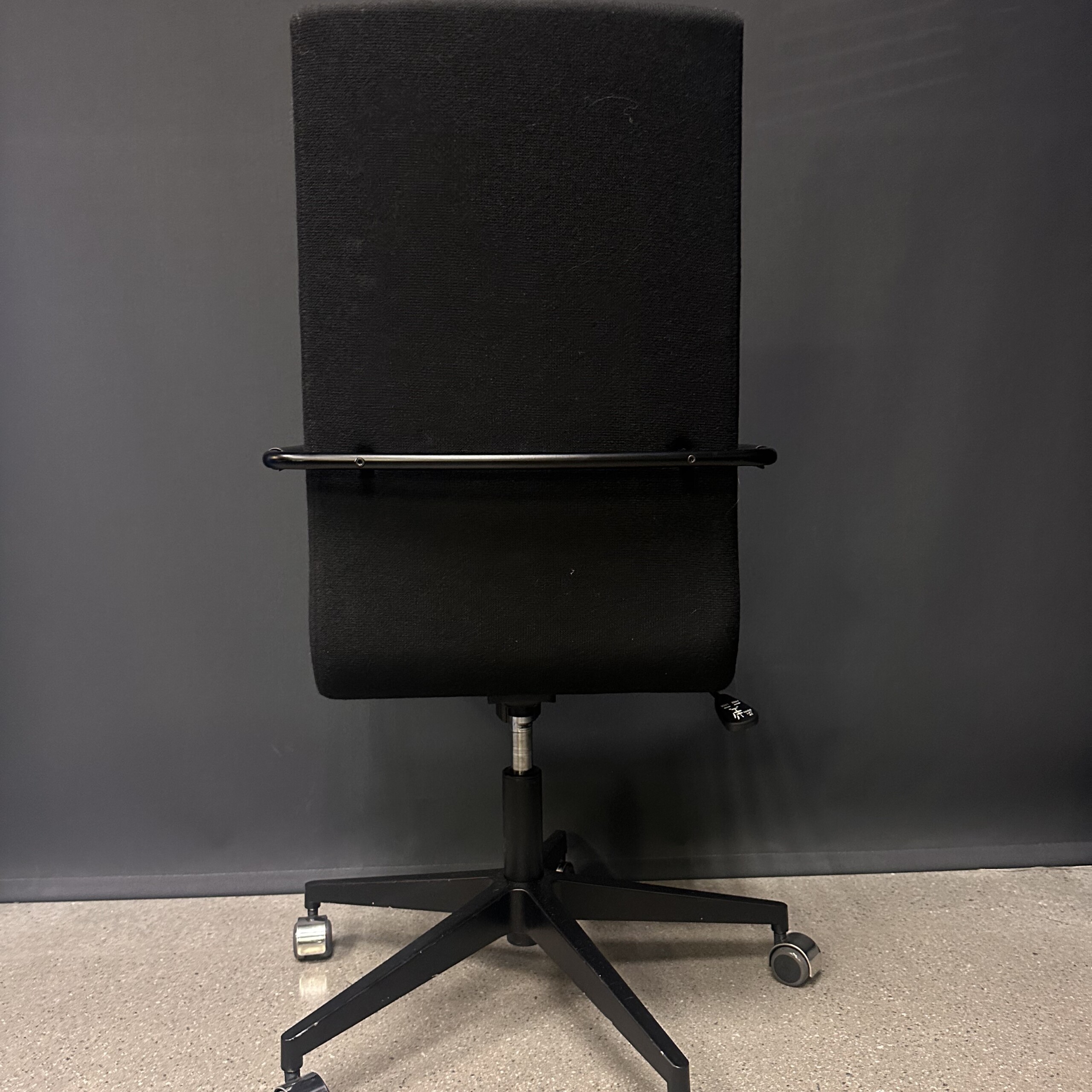 Sæde og ryg i stof (sort). Fodkryds i metal (sort). Højdejusterbar.