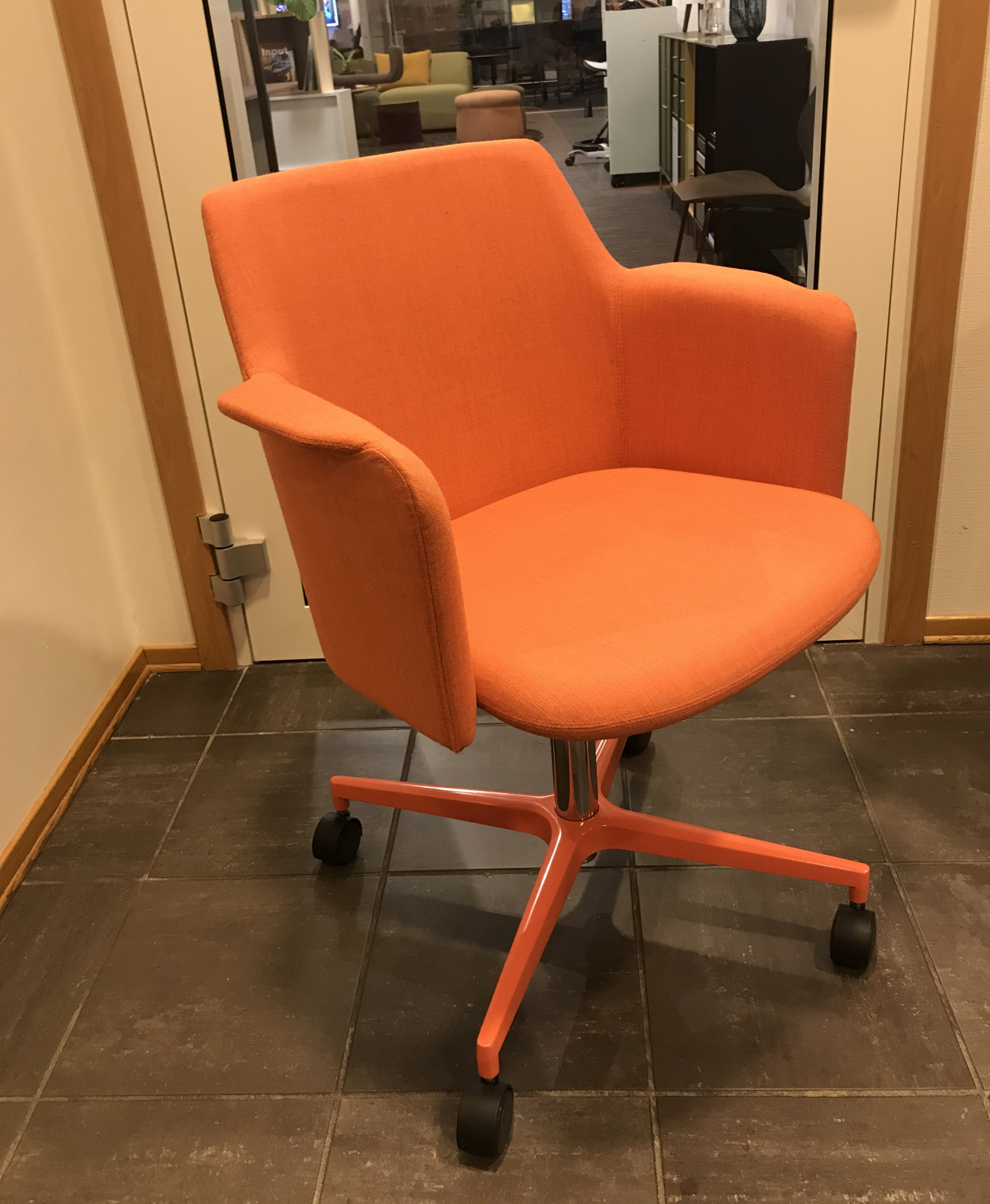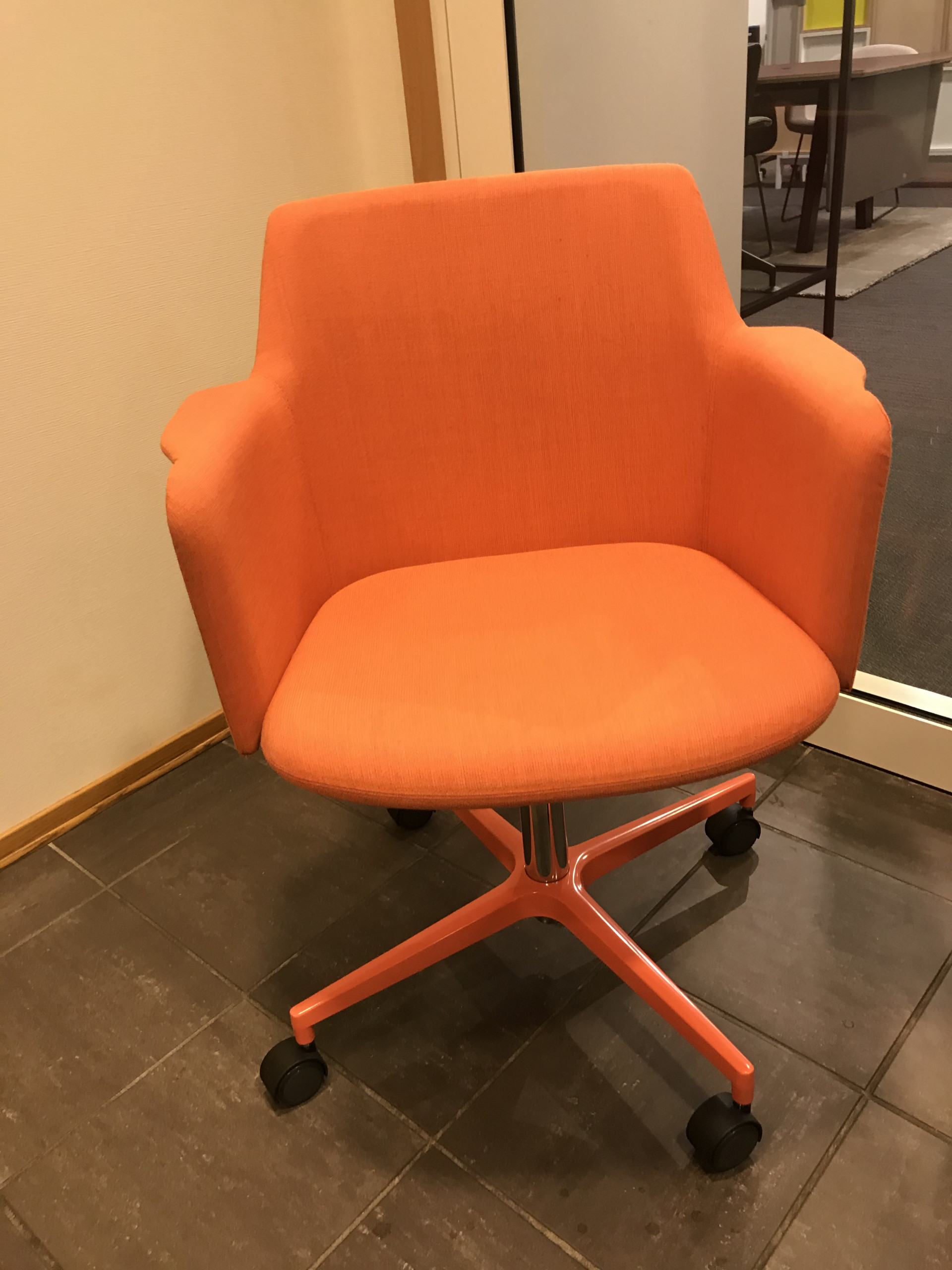 Sæde og ryg i stof (orange). Fodkryds i metal (orange). Højdejusterbar.