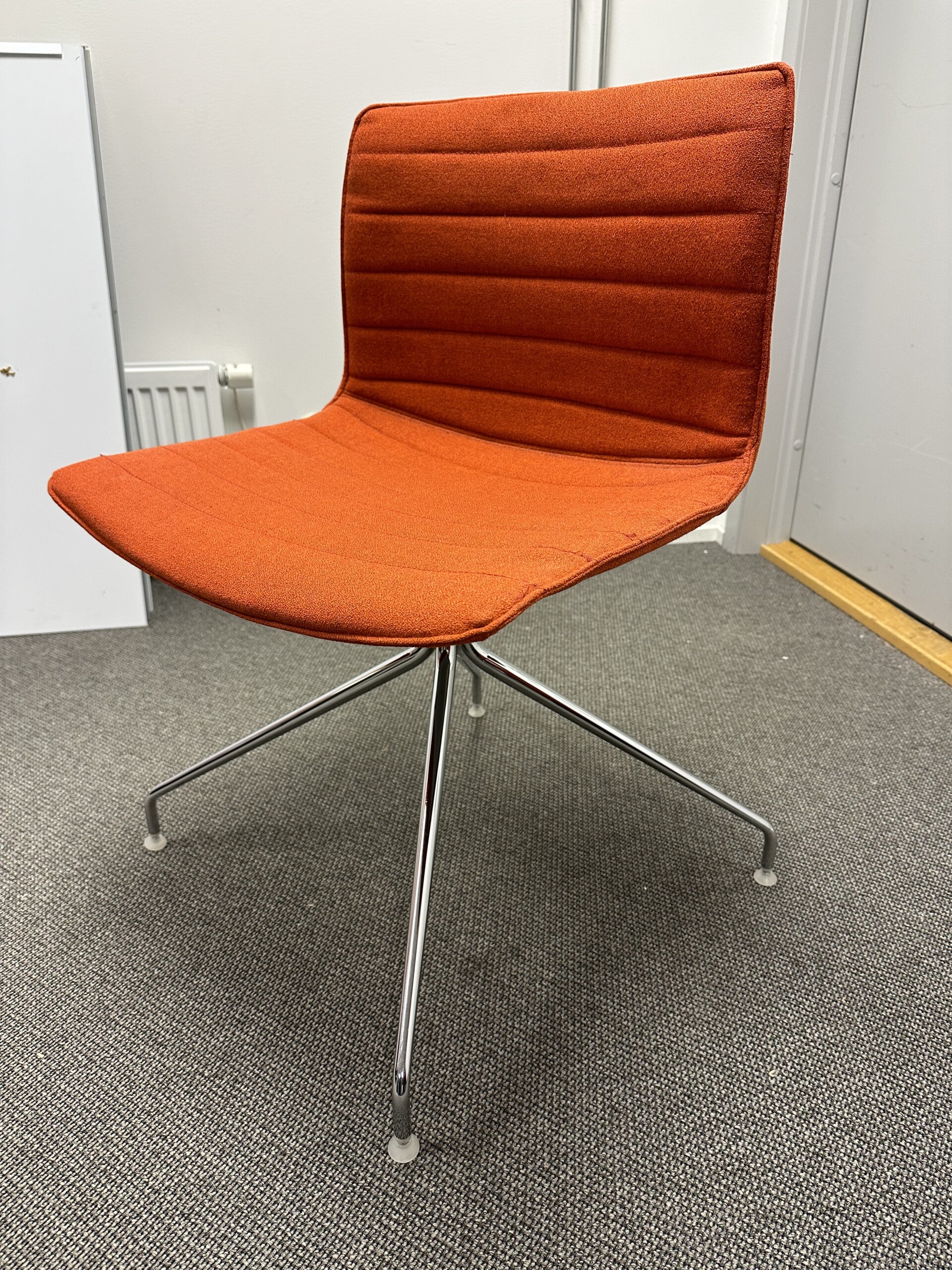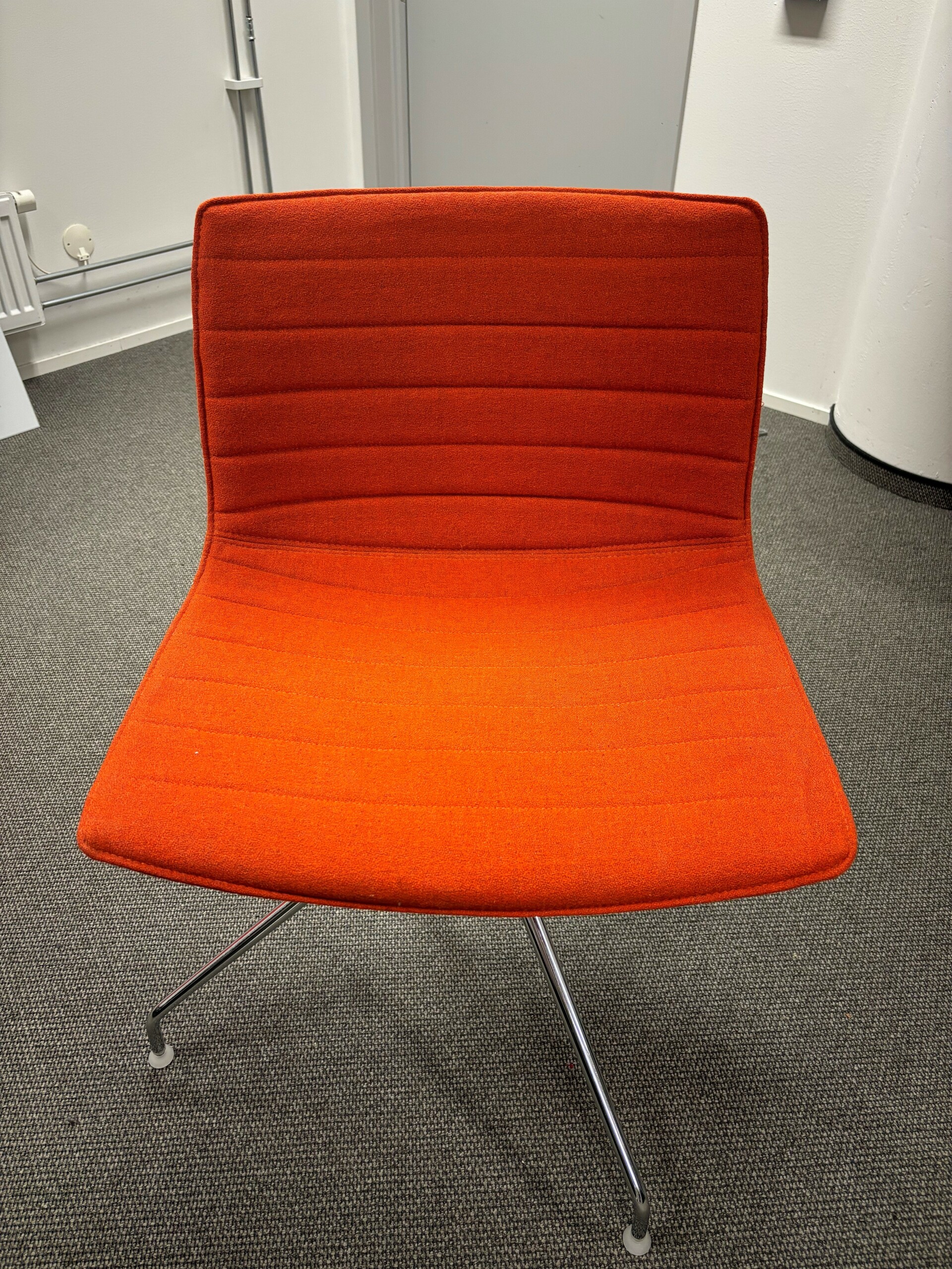 Sæde og ryg i stof (orange). Fodkryds i metal (krom).