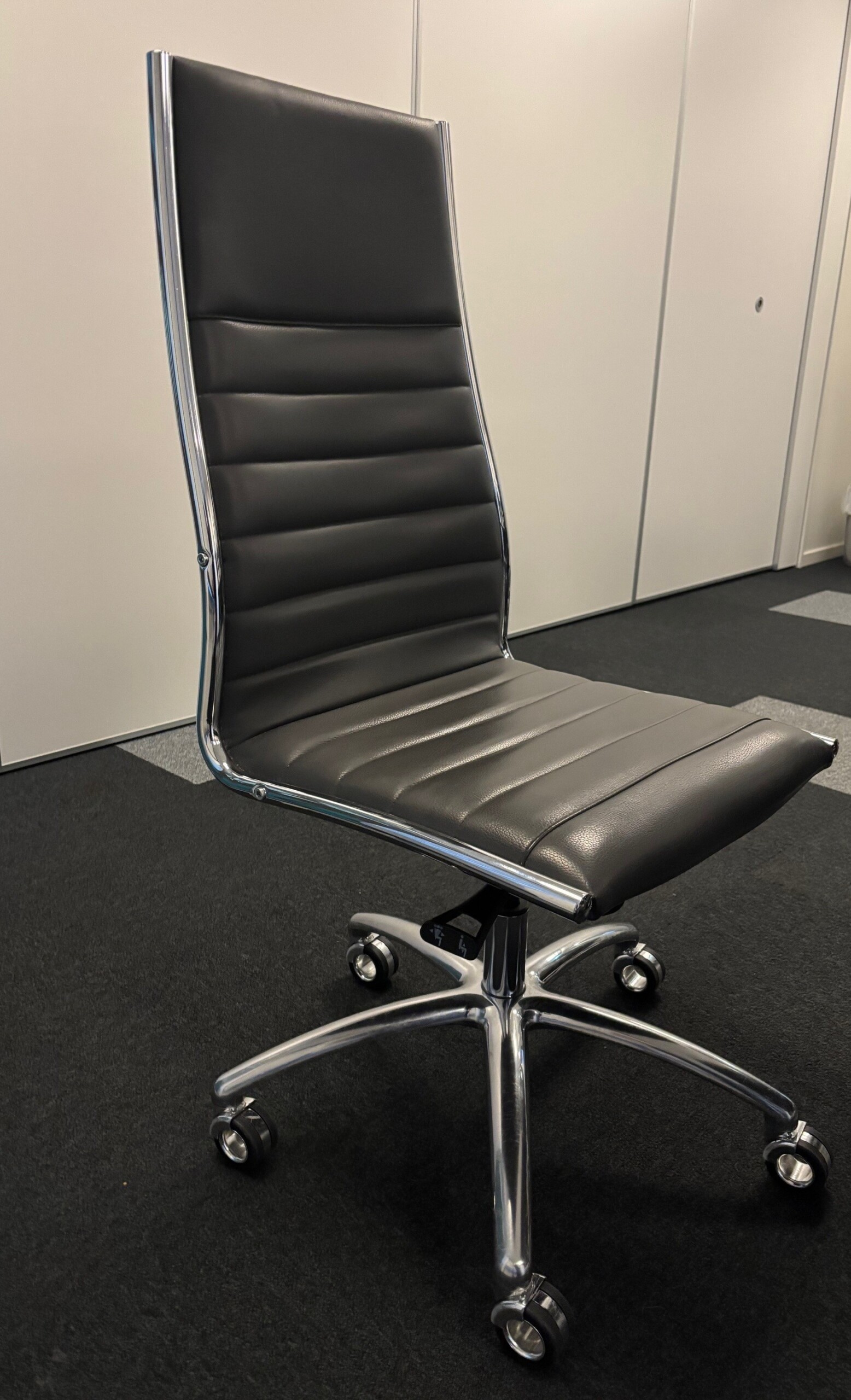 Sæde og ryg i læder (sort). Fodkryds i metal (krom). Højdejusterbar.