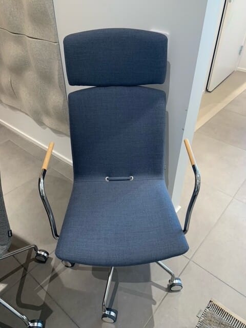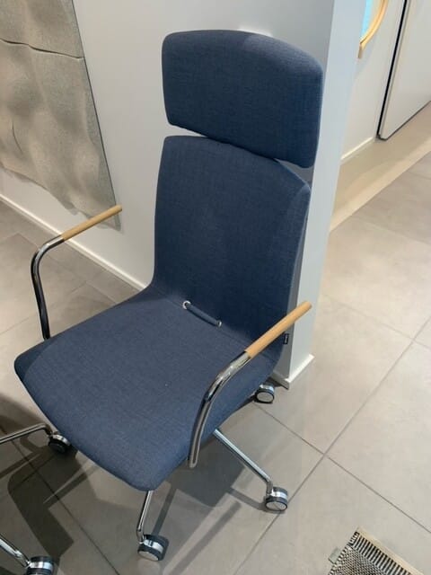 Sæde og ryg i stof (blå). Fodkryds i metal (krom). Højdejusterbar.