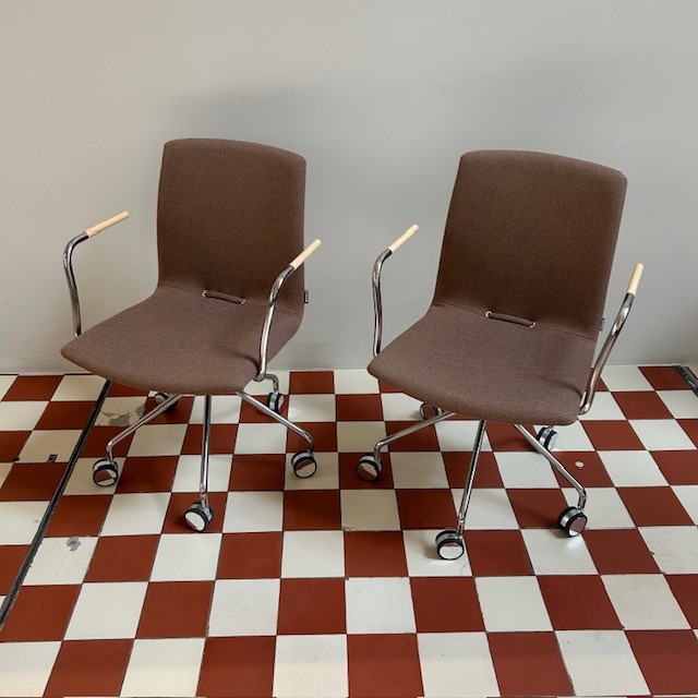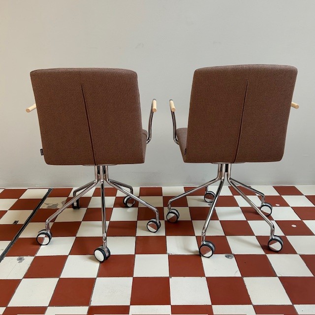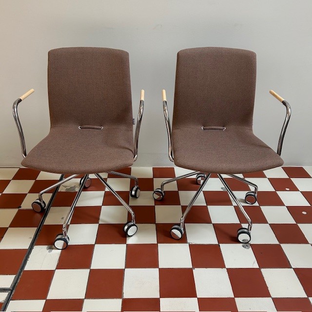 Sæde og ryg i stof (brun). Fodkryds i metal (krom).