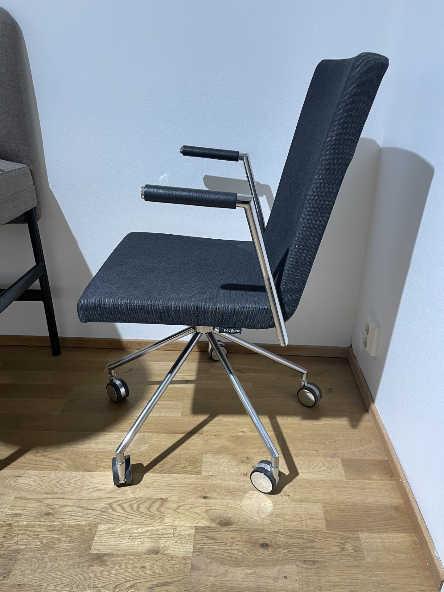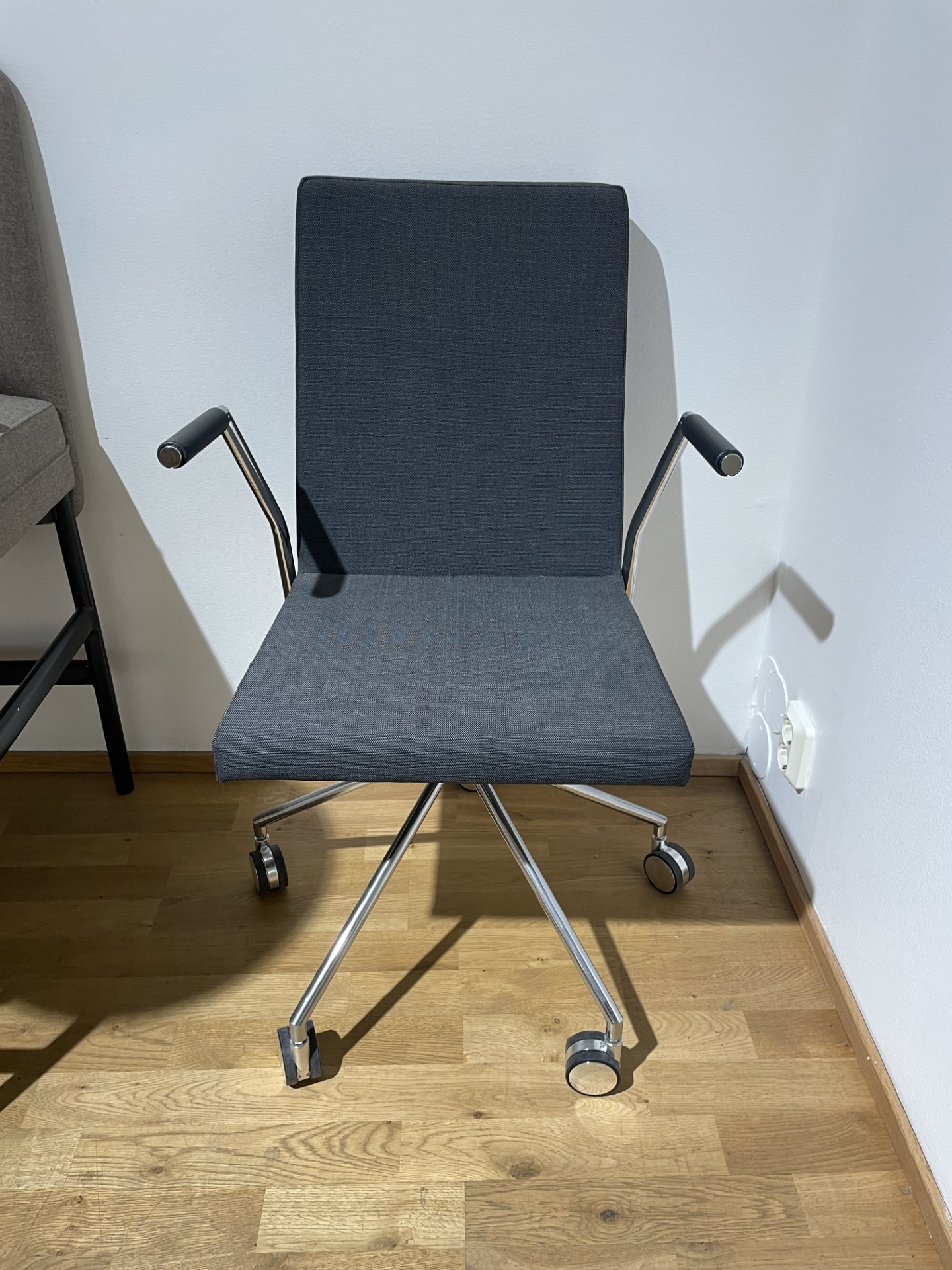 Sæde og ryg i stof (blå). Fodkryds i metal (sølv).