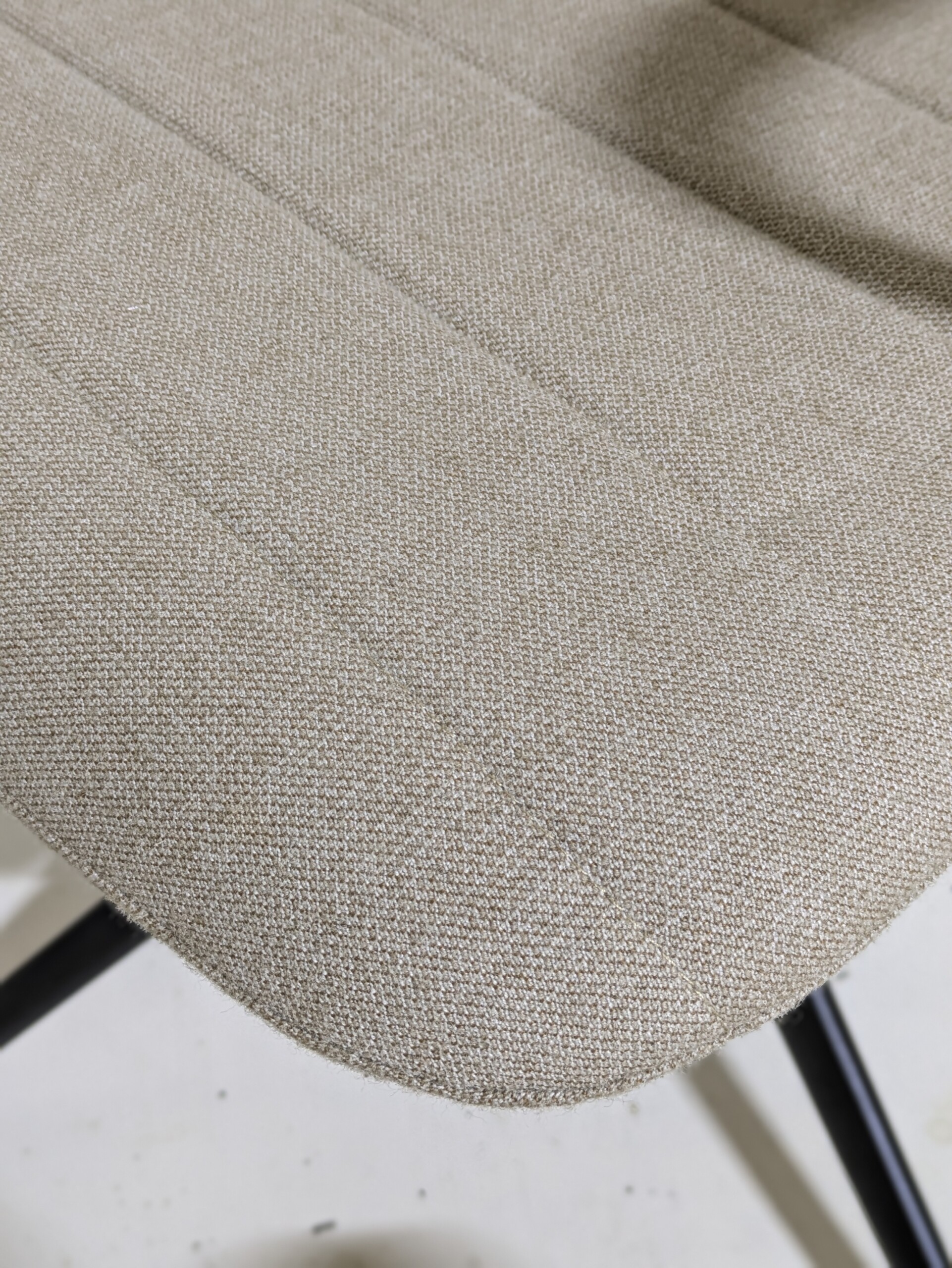Sæde og ryg i stof (beige). Fodkryds i metal (sort).