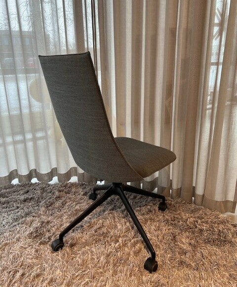 Sæde og ryg i stof (grå). Fodkryds i metal (sort).