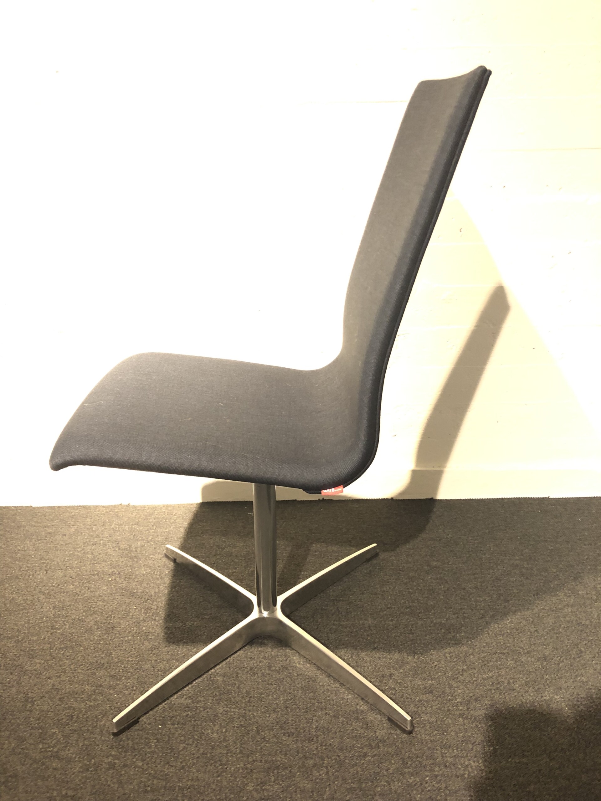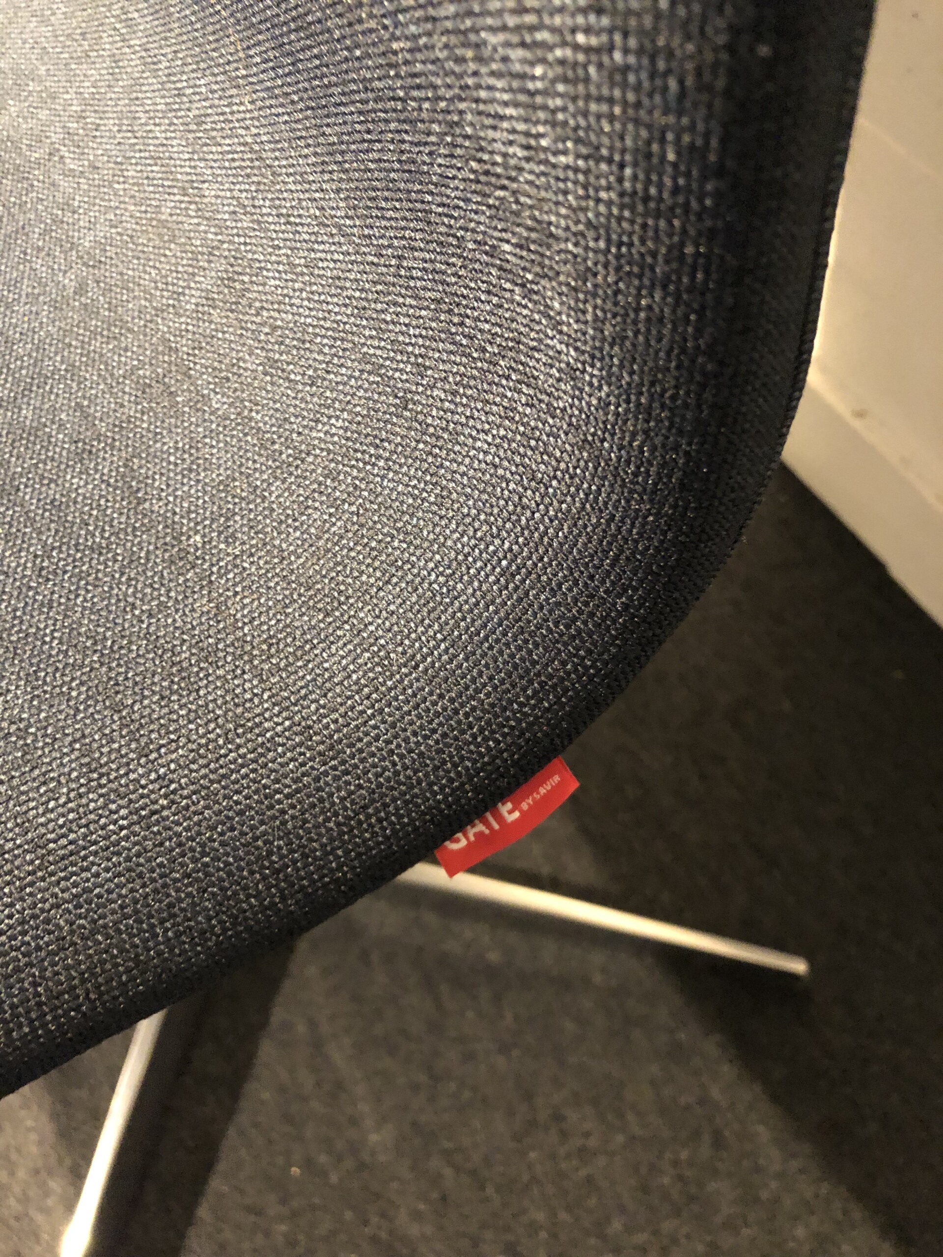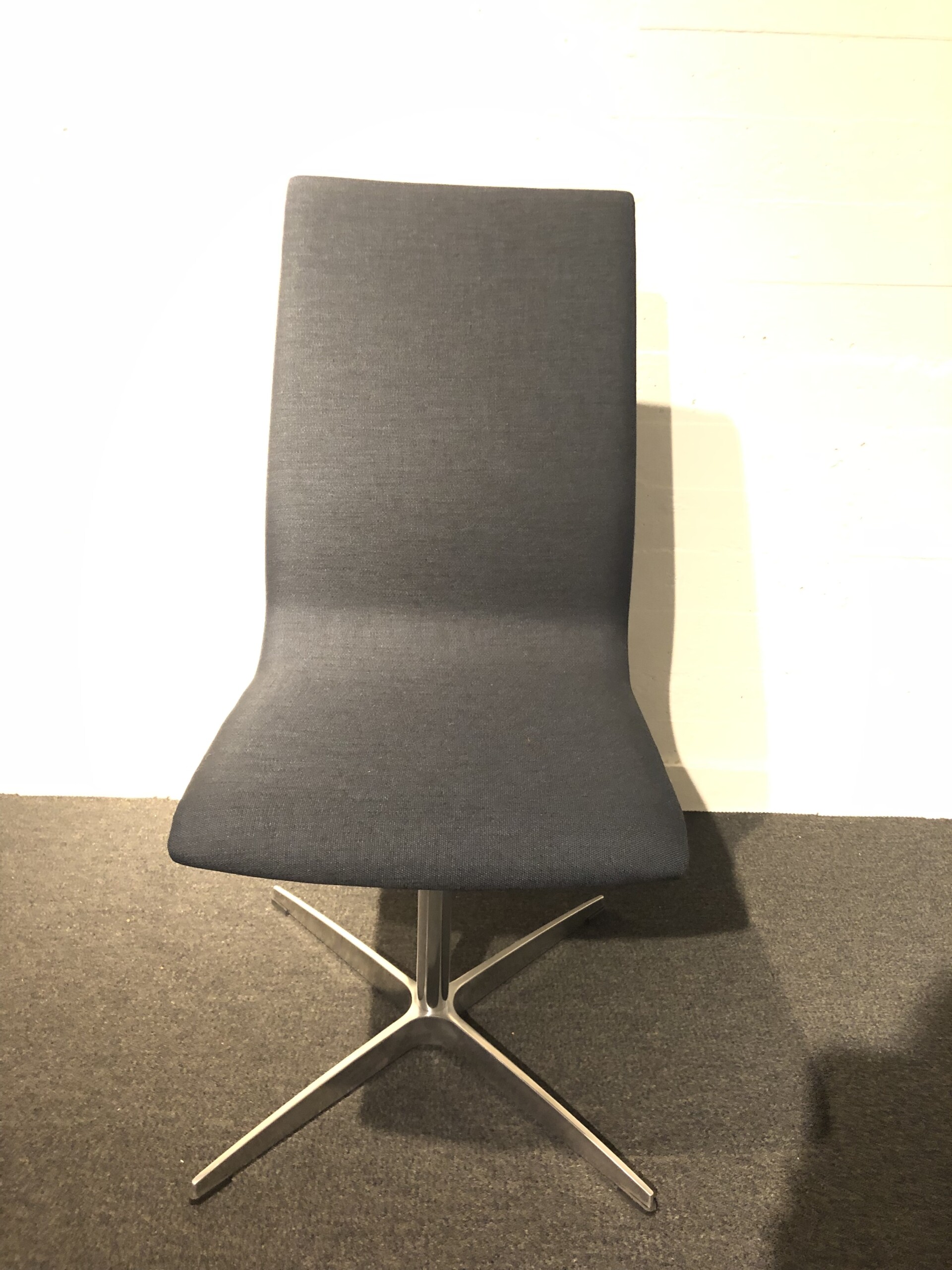 Sæde og ryg i stof (blå). Fodkryds i metal (aluminium).