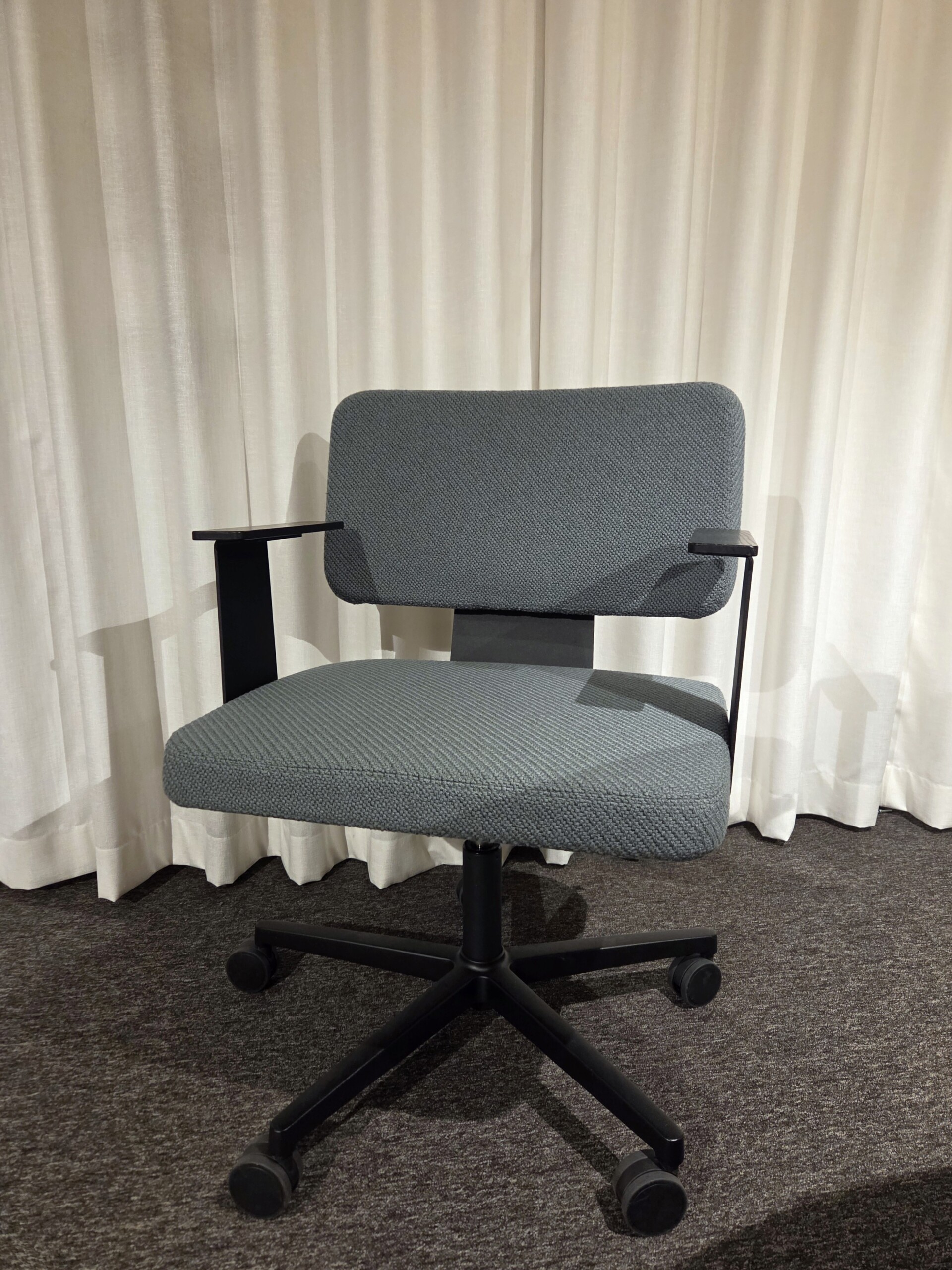 Sæde og ryg i stof (blå). Fodkryds i metal (sort). Højdejusterbar.