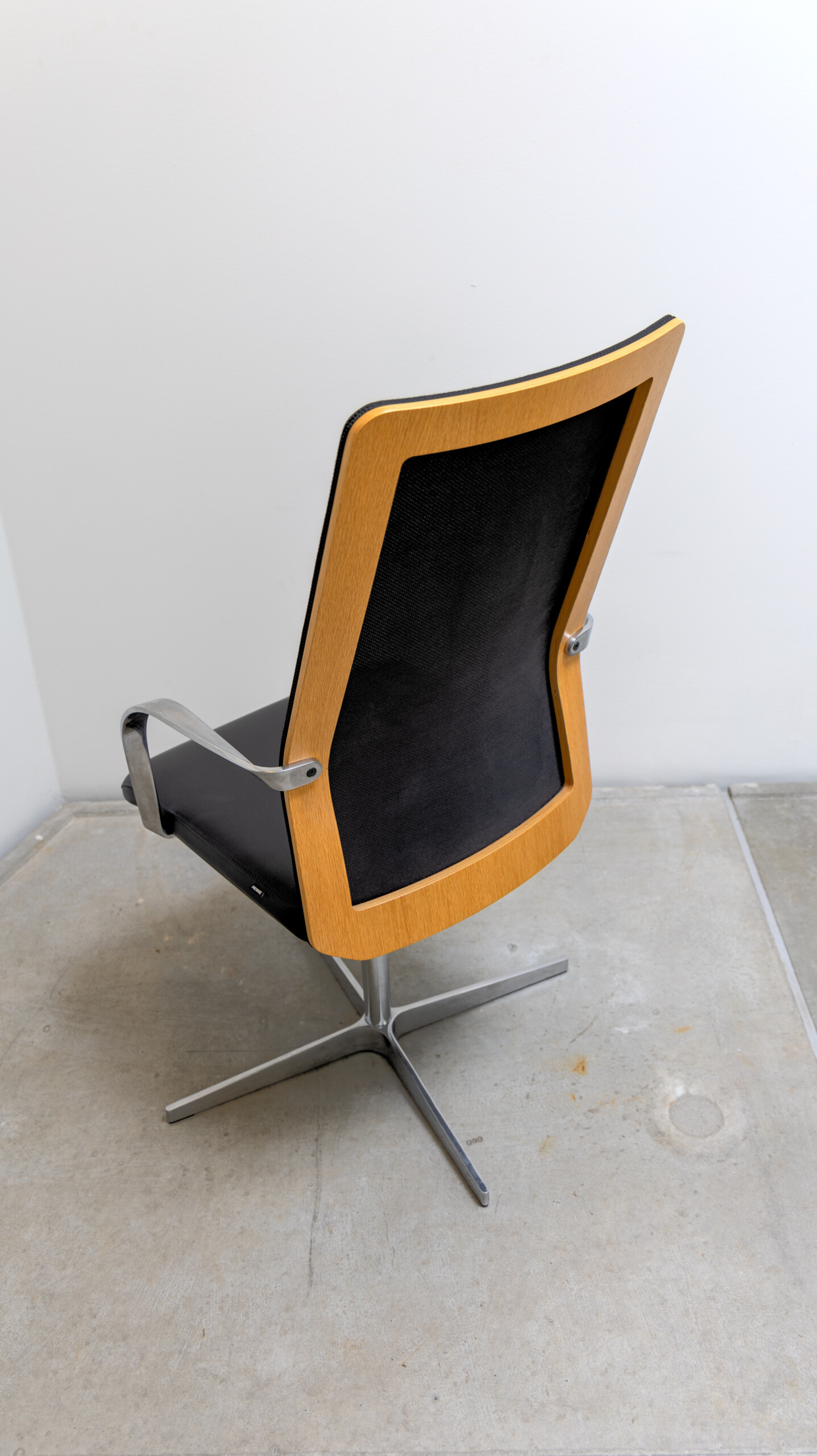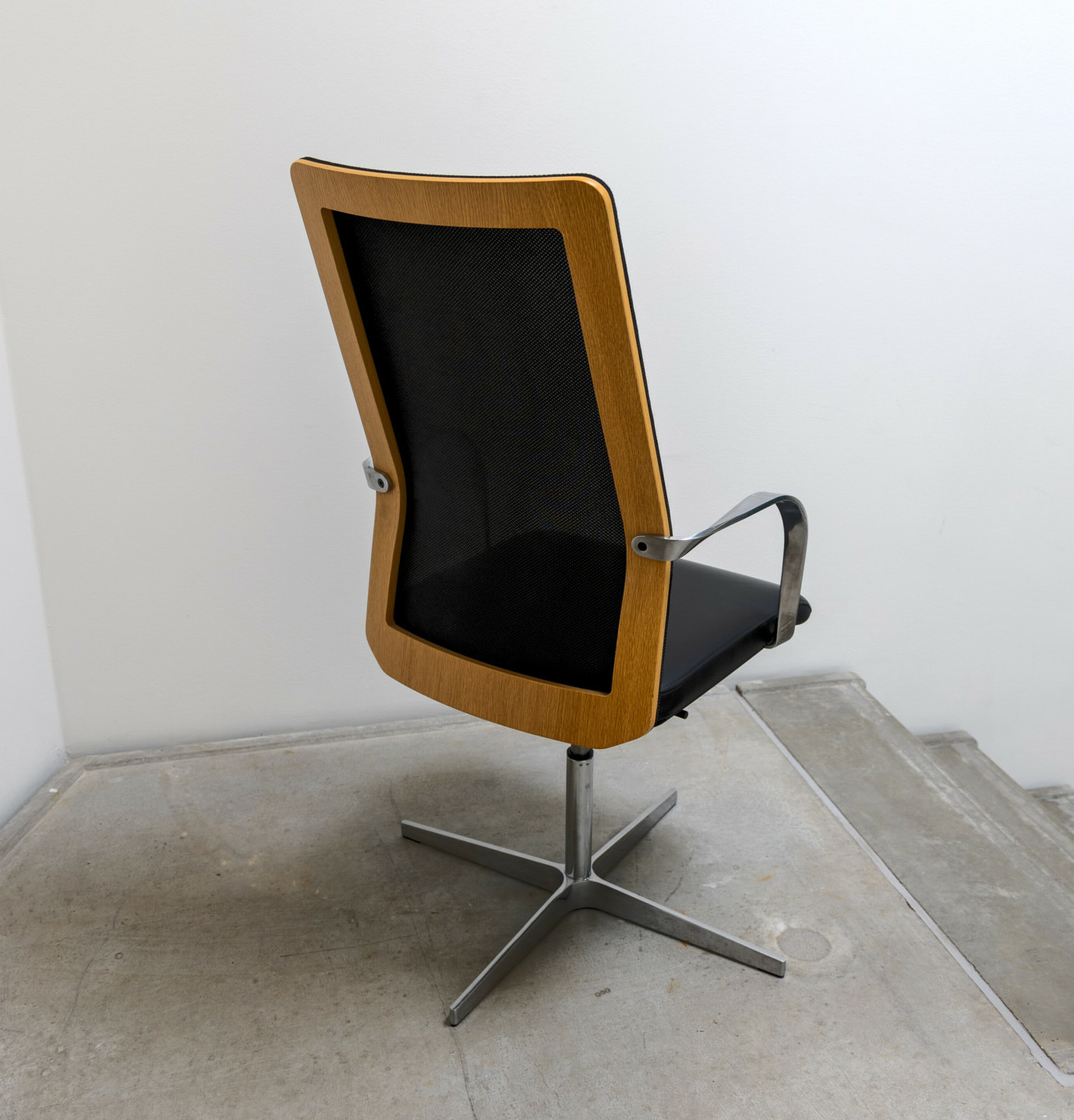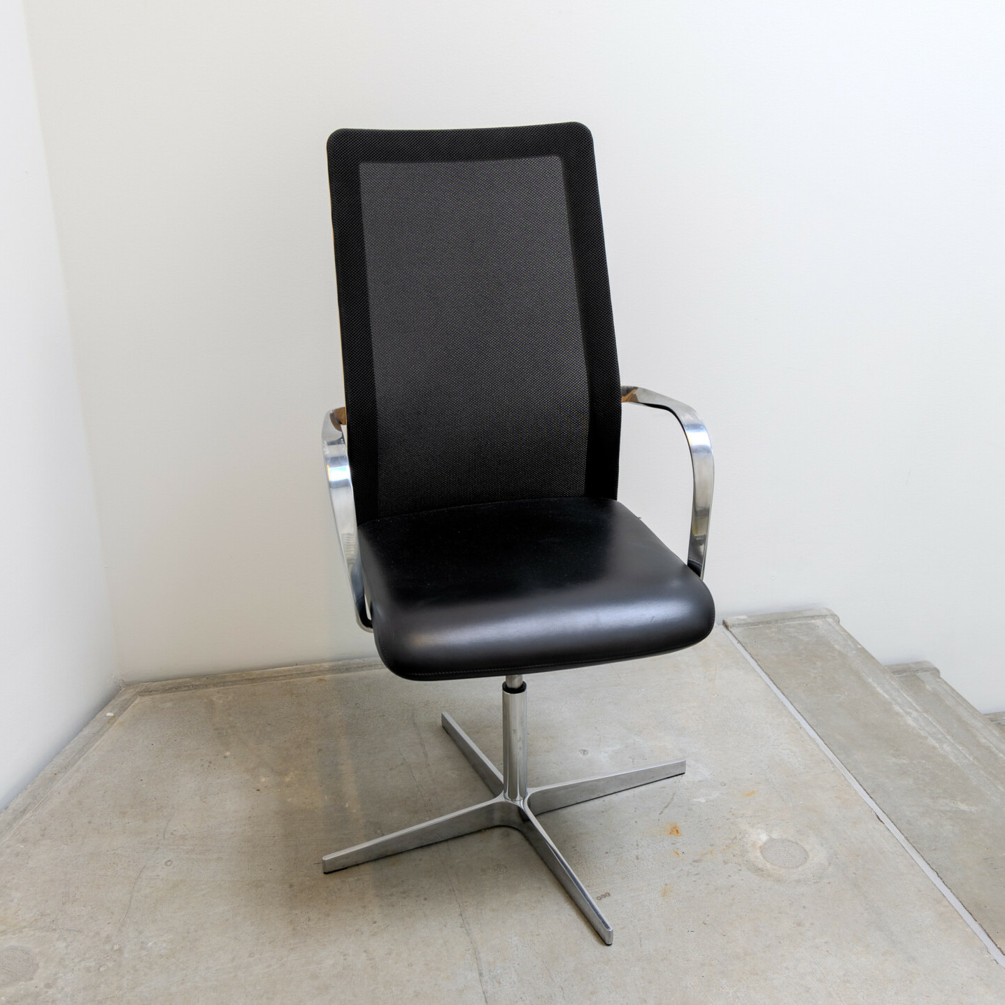 Sæde i læder (sort). Ryg i mesh (sort). Fodkryds i metal (aluminium). Højdejusterbar.