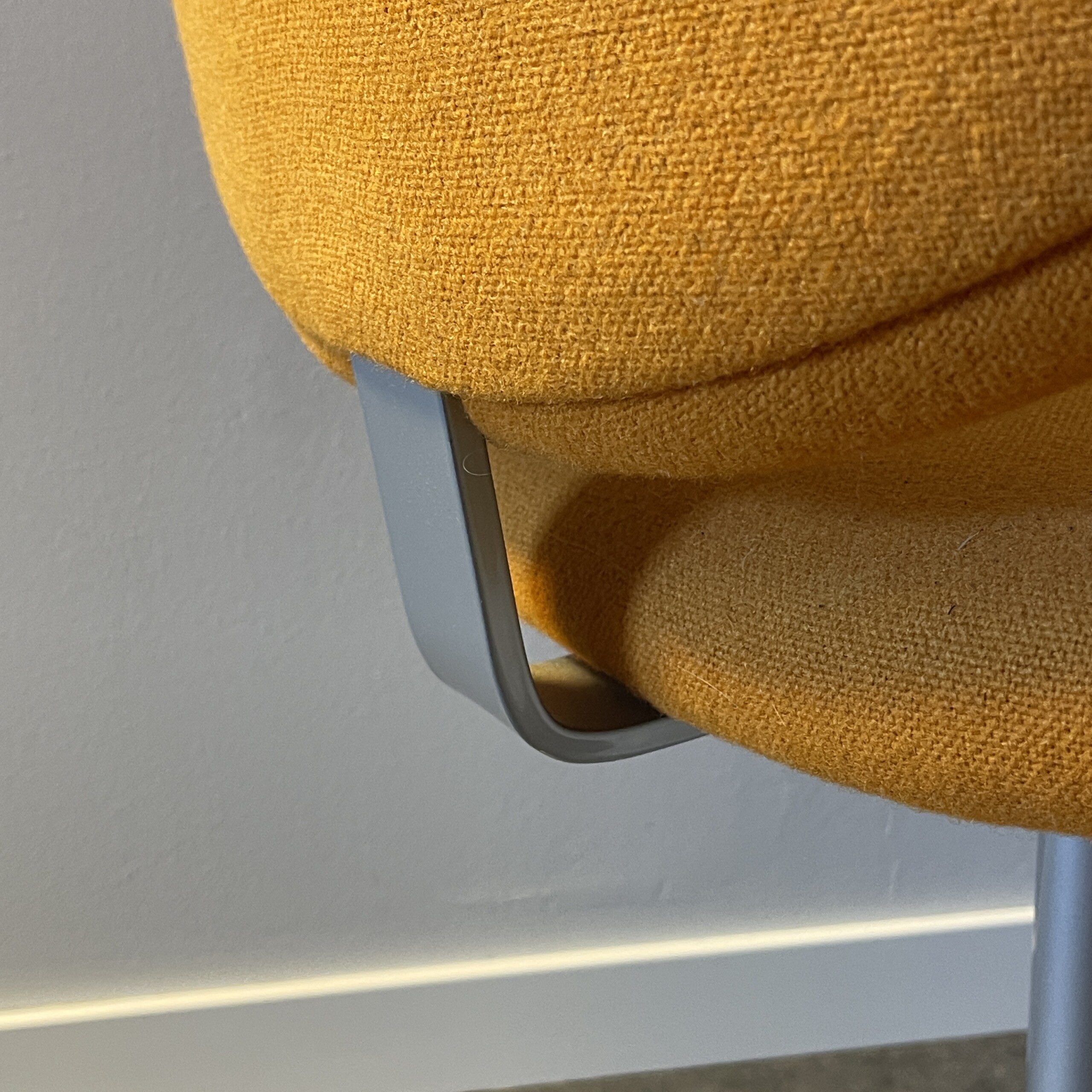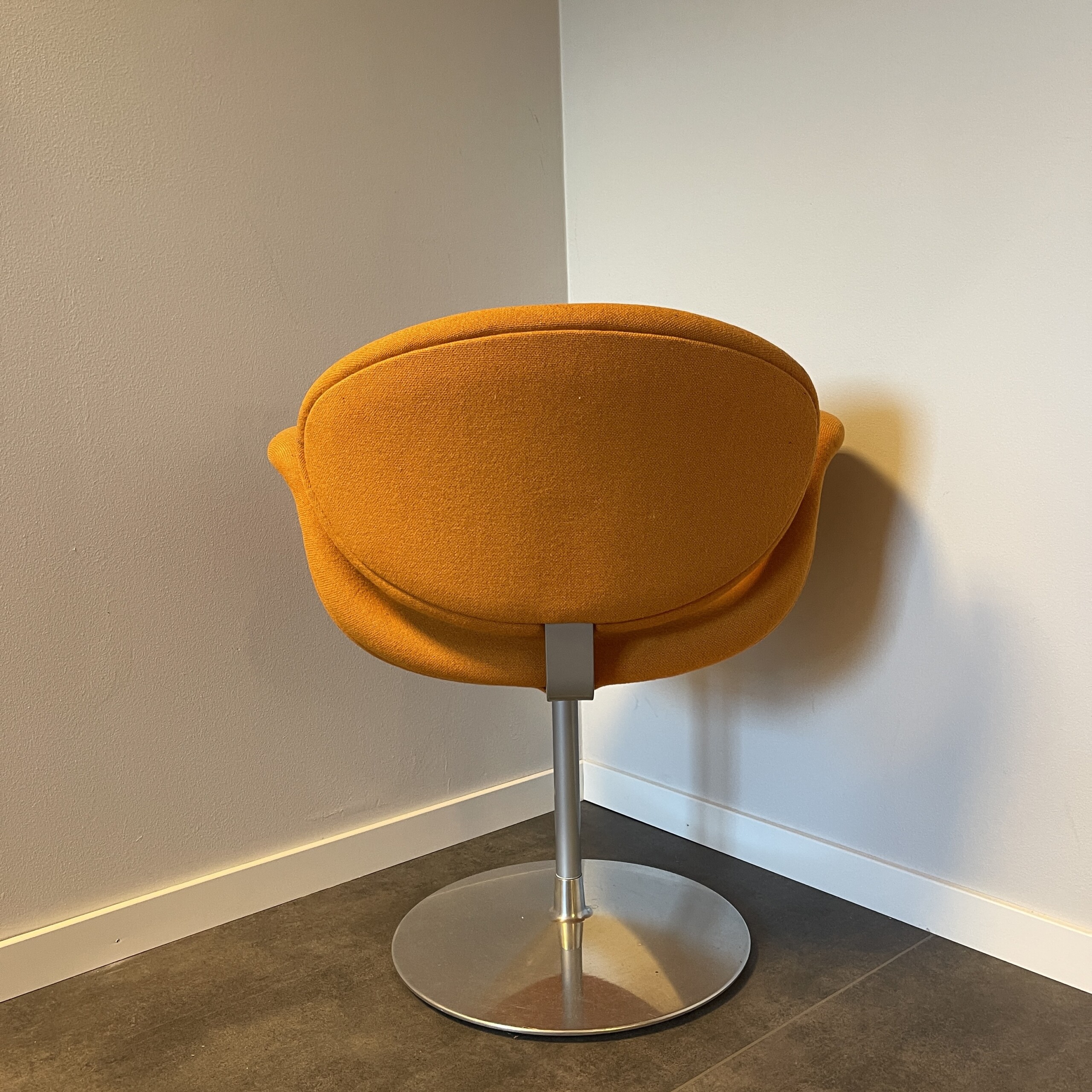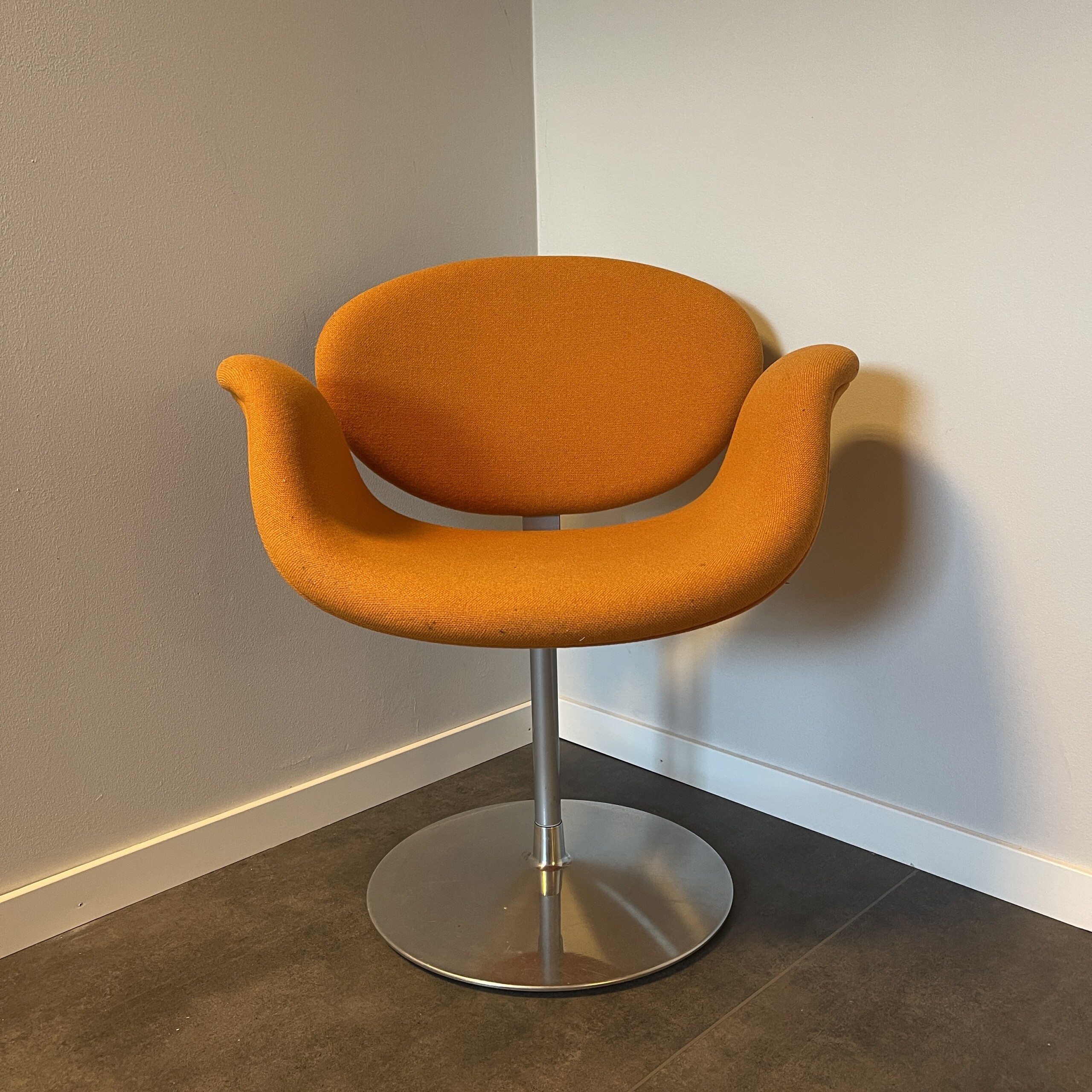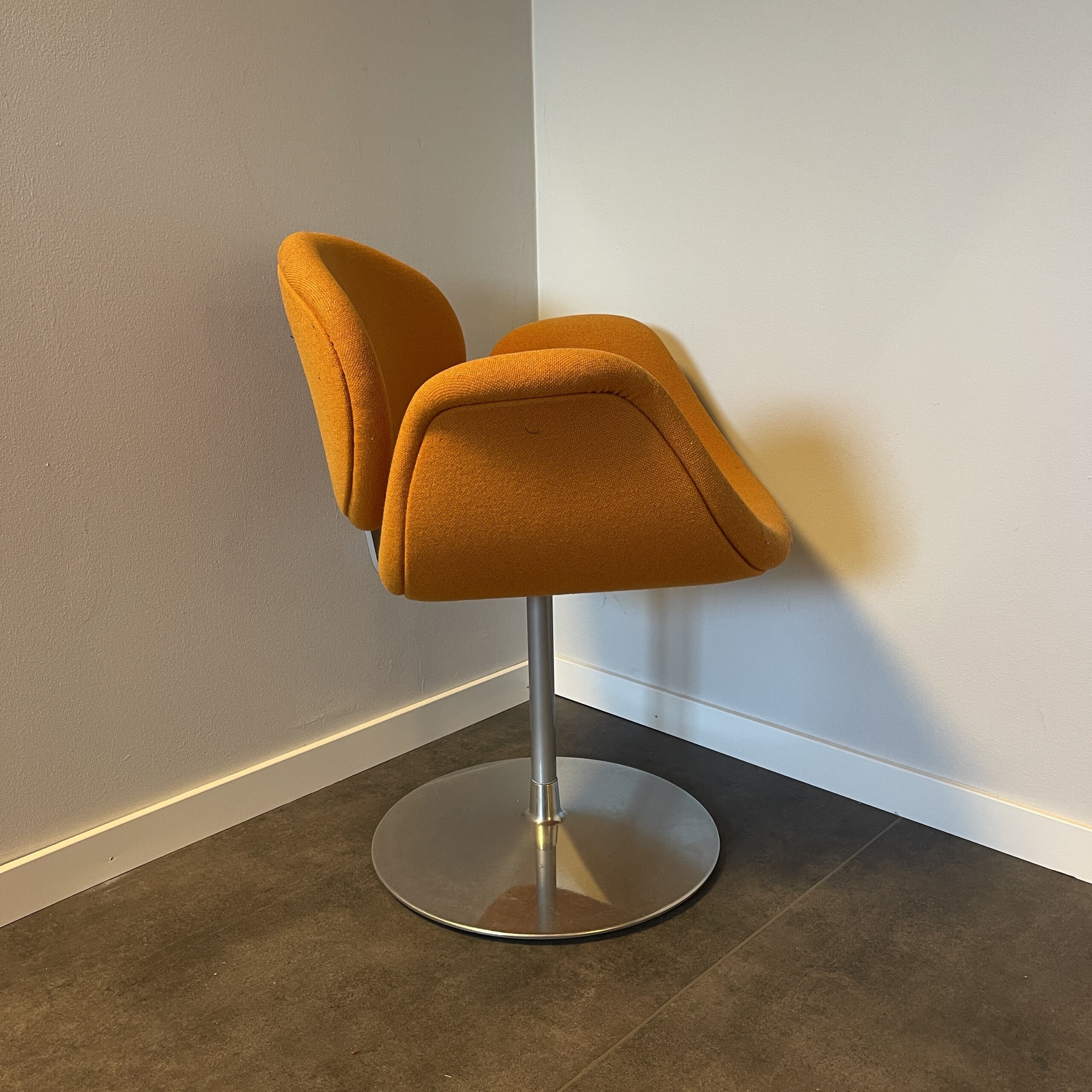 Sæde og ryg i stof (orange). Søjlefod i metal (krom).
