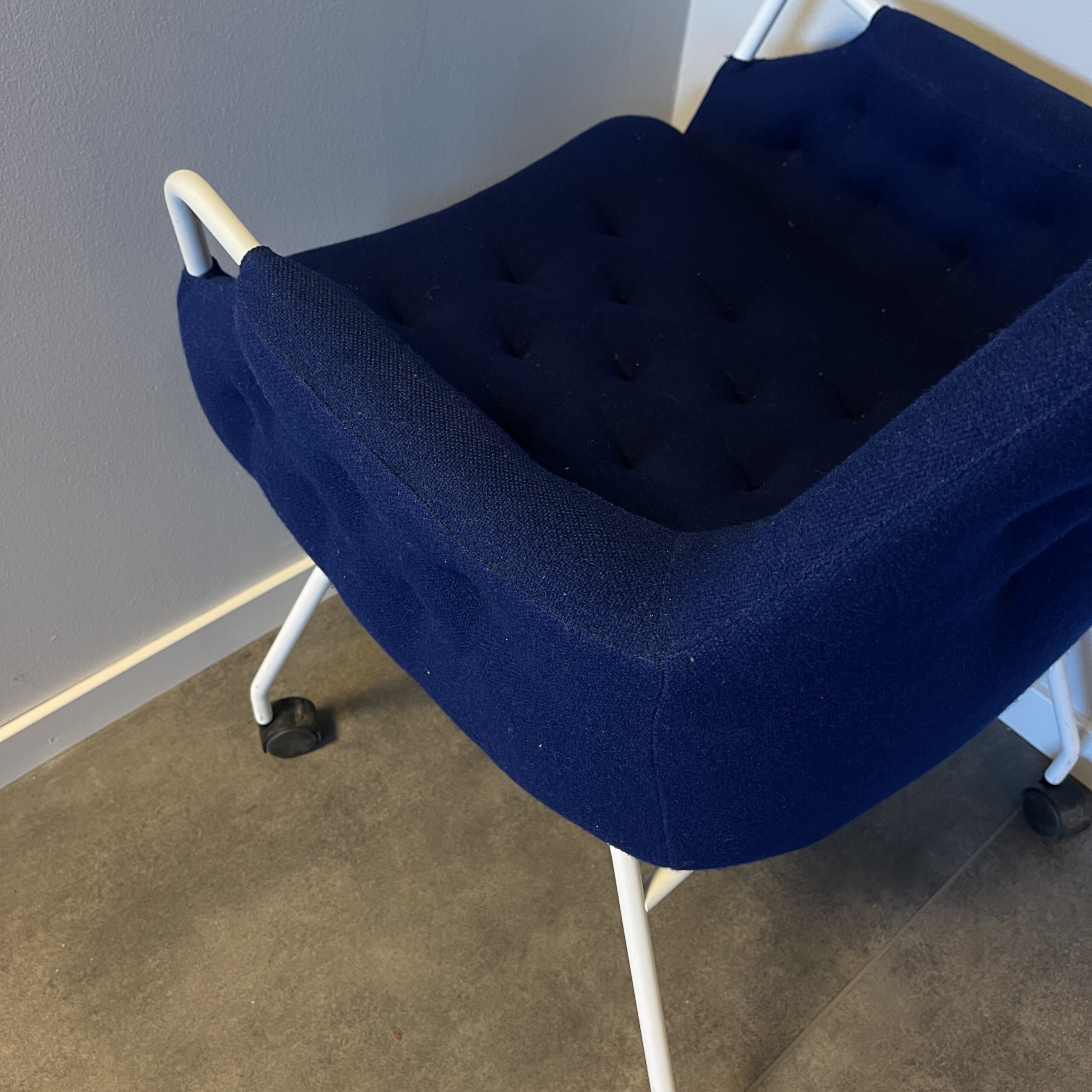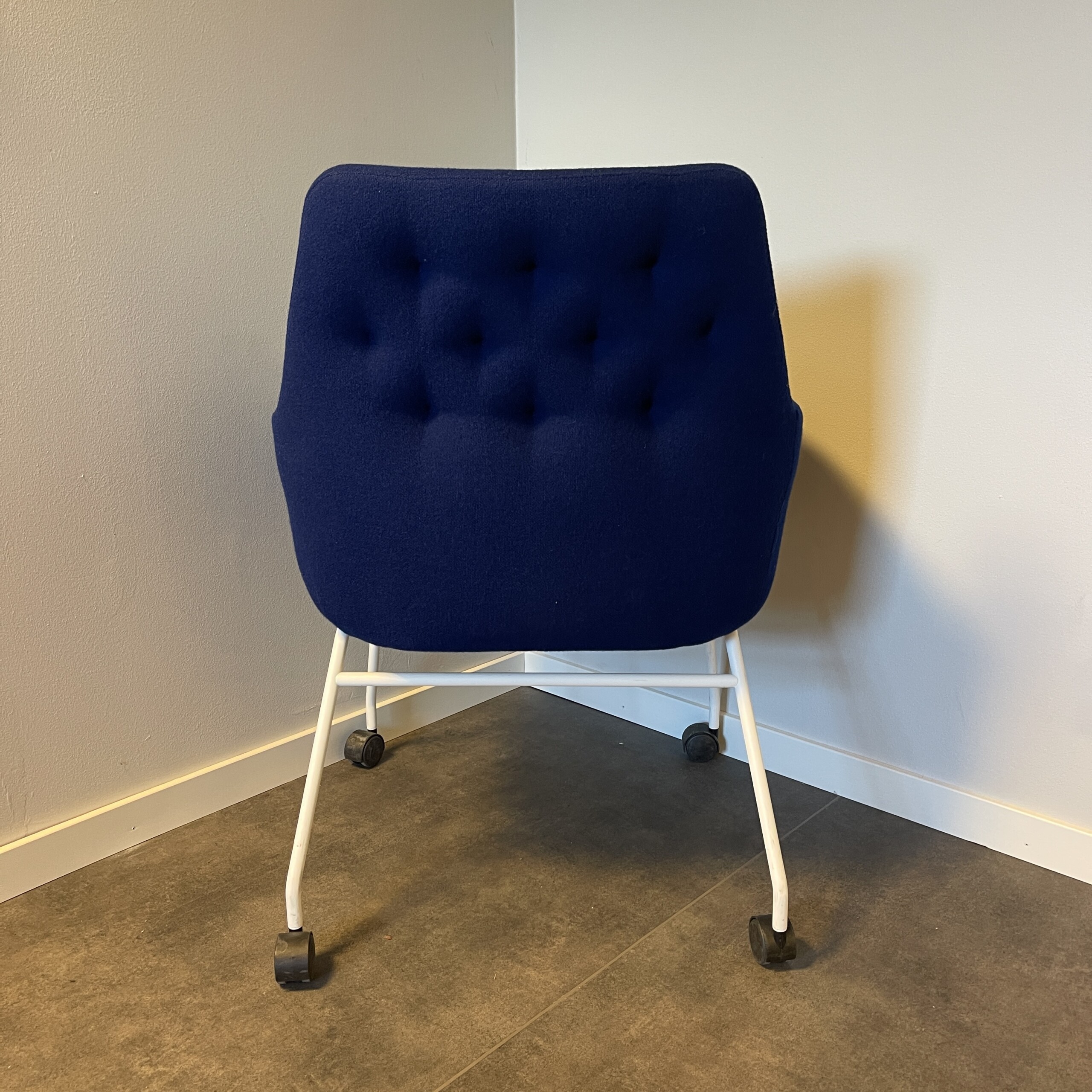 Sæde og ryg i stof (blå). 4-bensstel i metal (hvid).