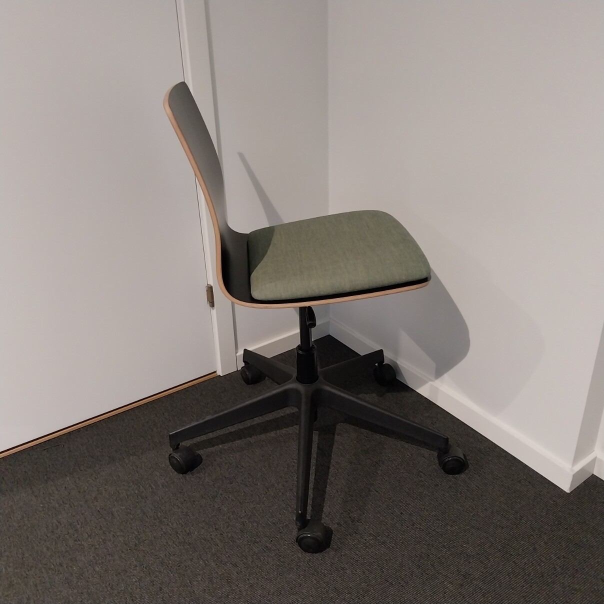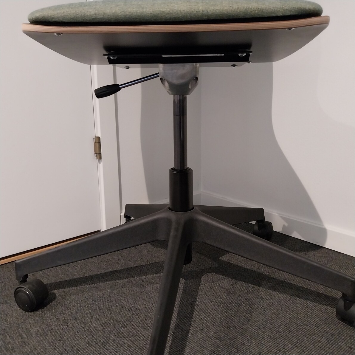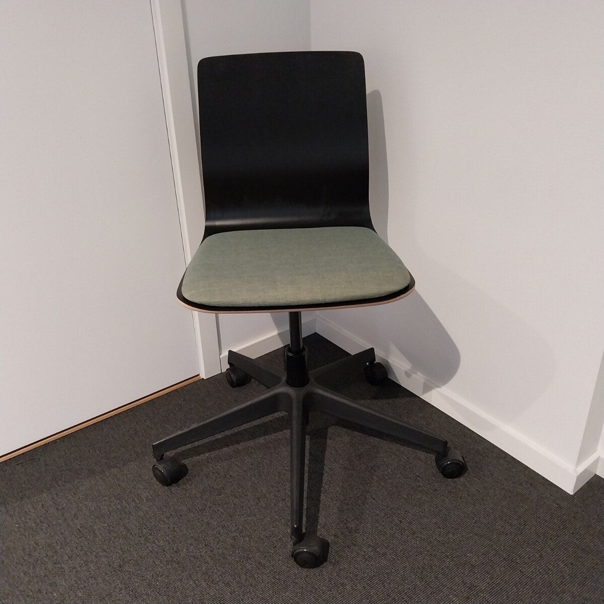 Sæde i stof (grøn). Ryg i laminat (sort). Fodkryds i plast (sort). Højdejusterbar.